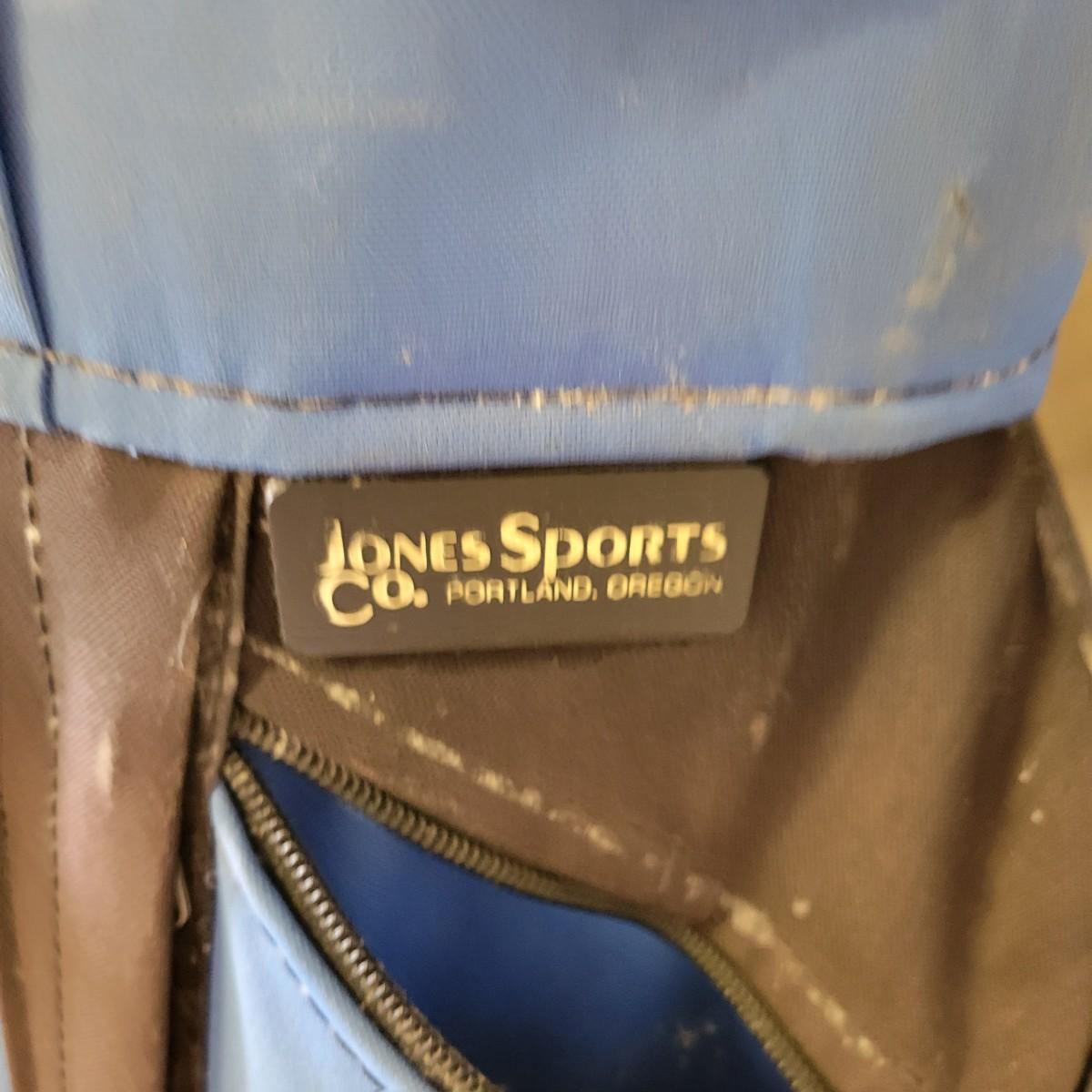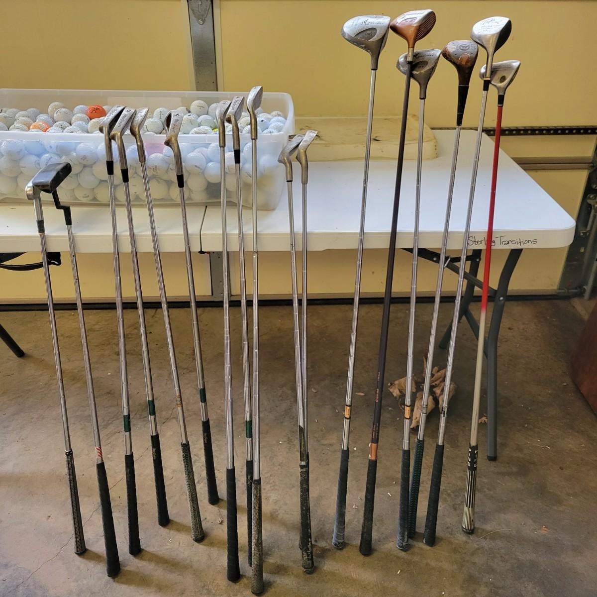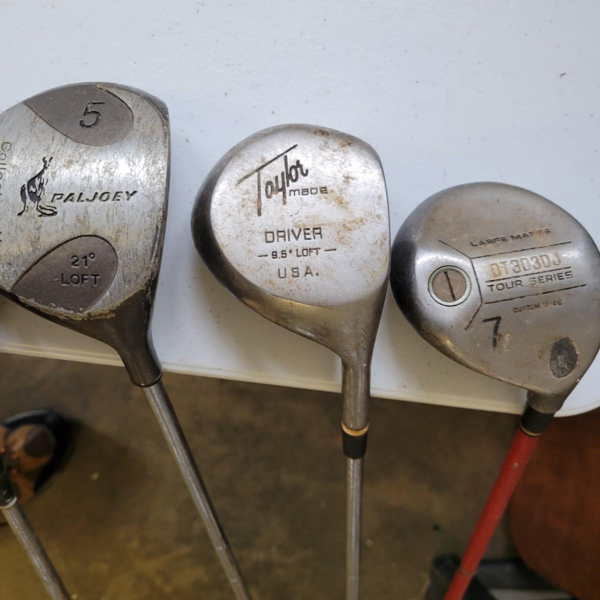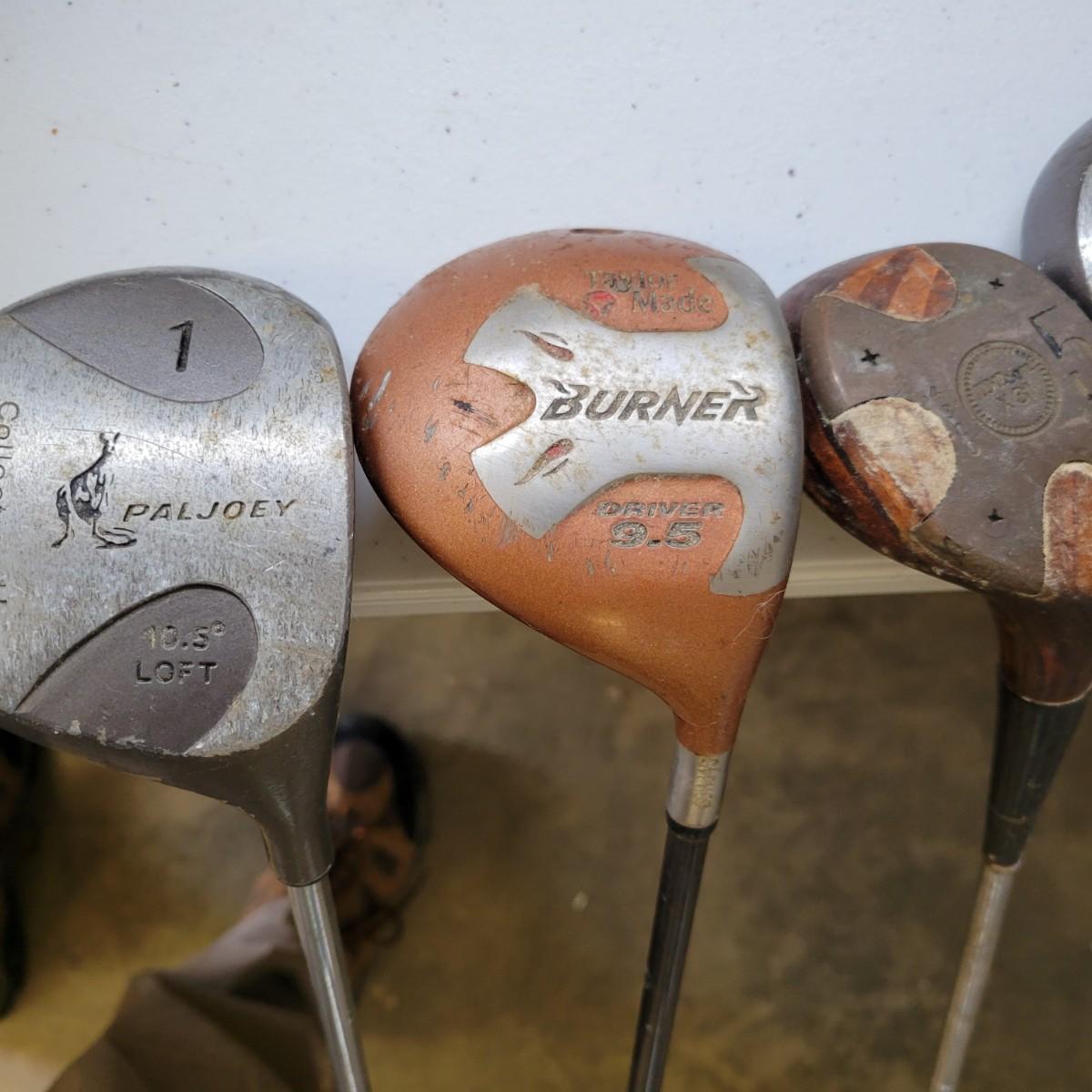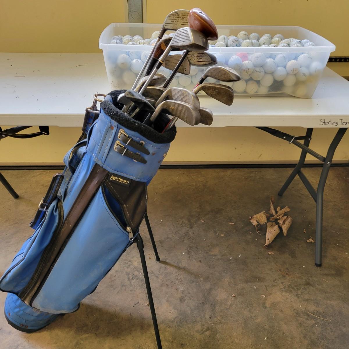 An assortment of golf clubs, a golf bag and more in fair to good condition. The golf bag has been in a garage and does show some mildew, but could be cleaned. The bag is made by Jones Sport Co. The clubs are an assortment of different brands, but make up an entire set. Manufacturers include PalJoey drivers, Taylor Made, Ping and a wooden driver. The longest driver is a JoeyPal 1 and has a 41" shaft. Irons and wedges are manufactured by McGregor, Kinetic and Ping. The 3 iron has a 37.5" shaft. Two putters are included made by Spalding and Glidden. Lot also includes a left hand glove, tees and a lot of balls, likely over 200. Local pickup only