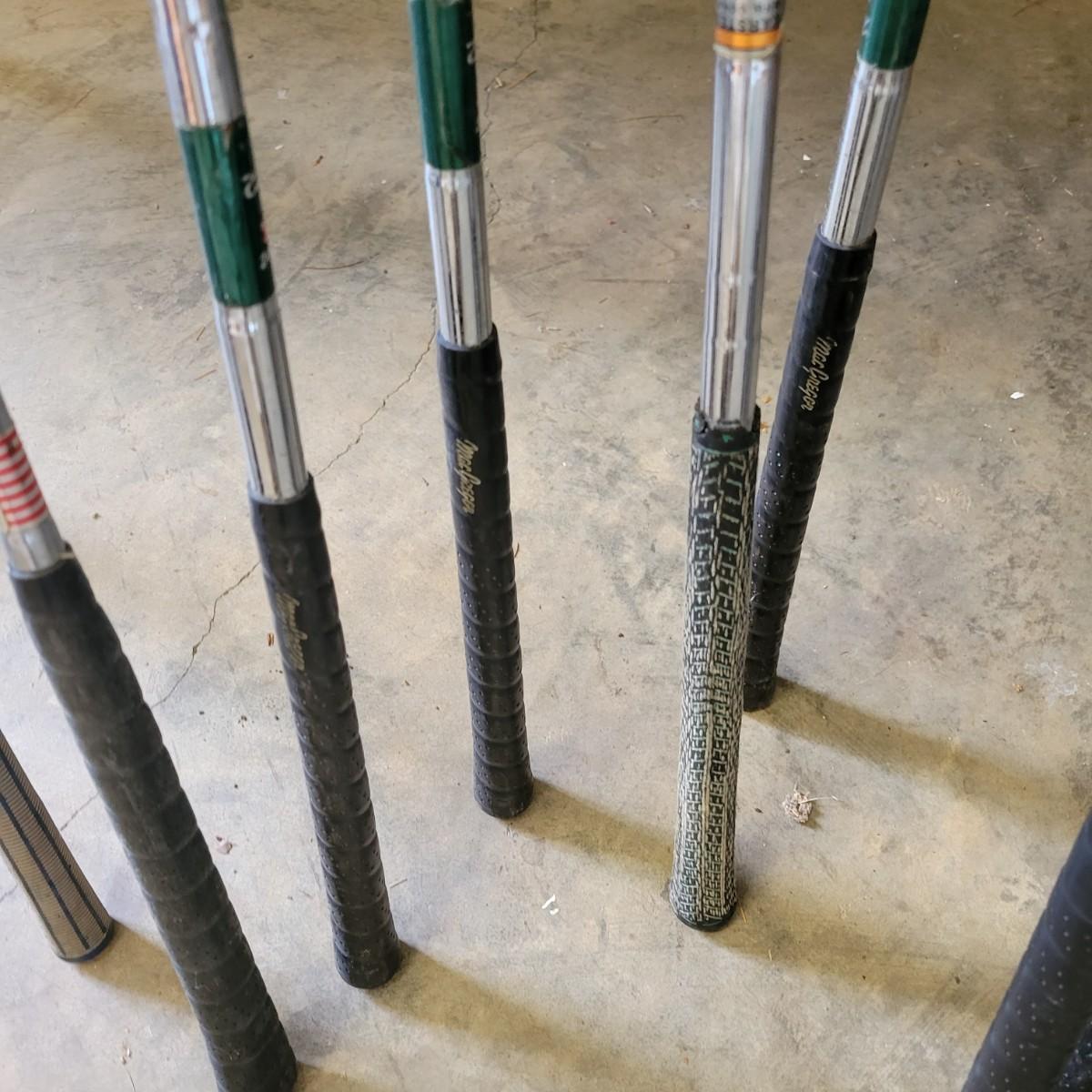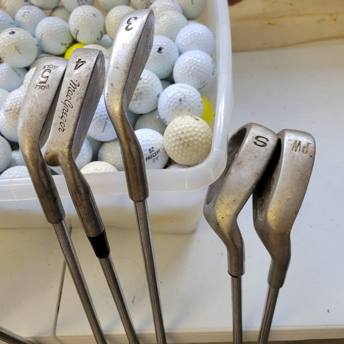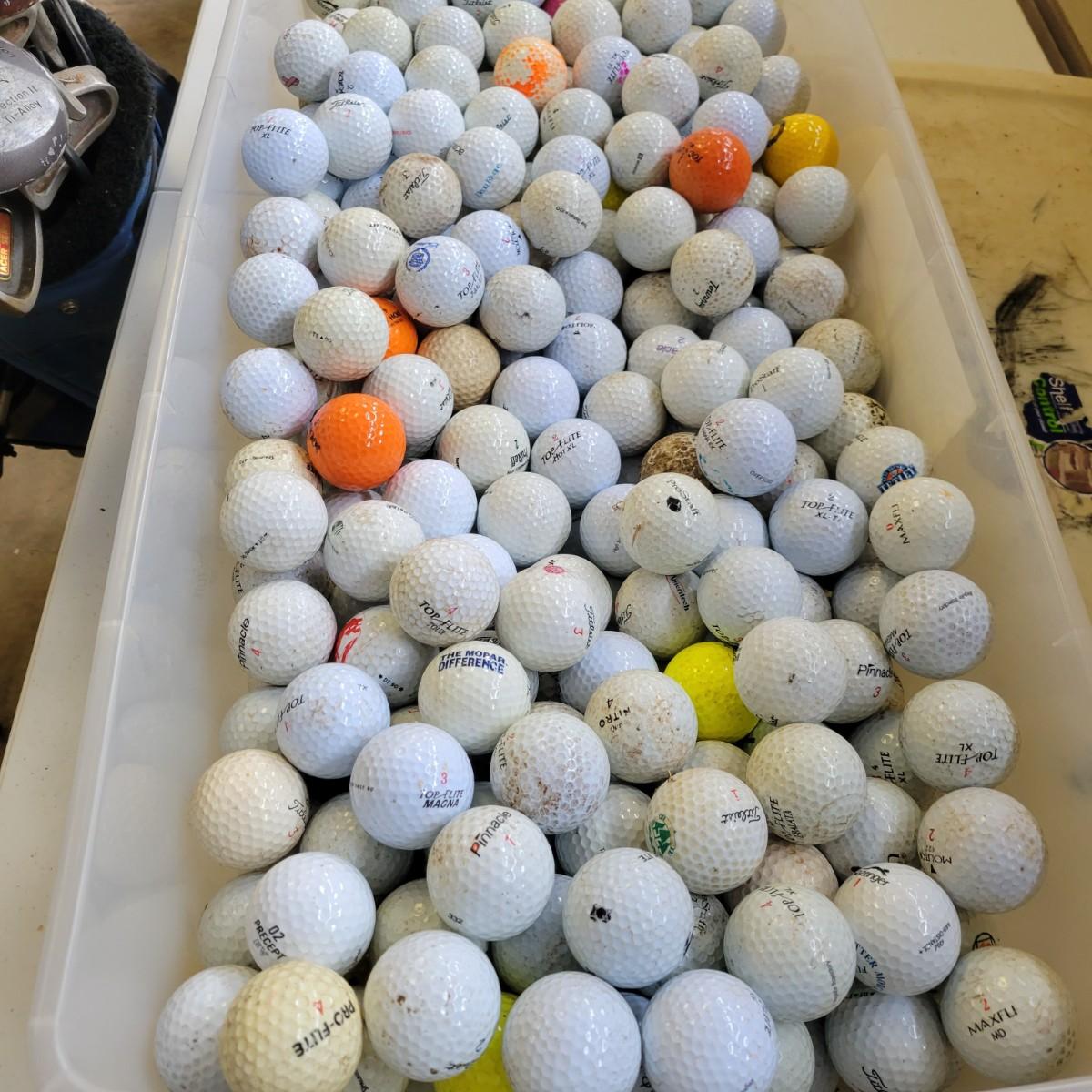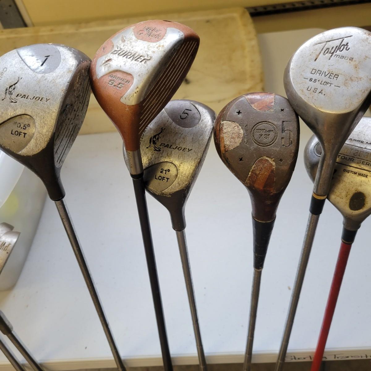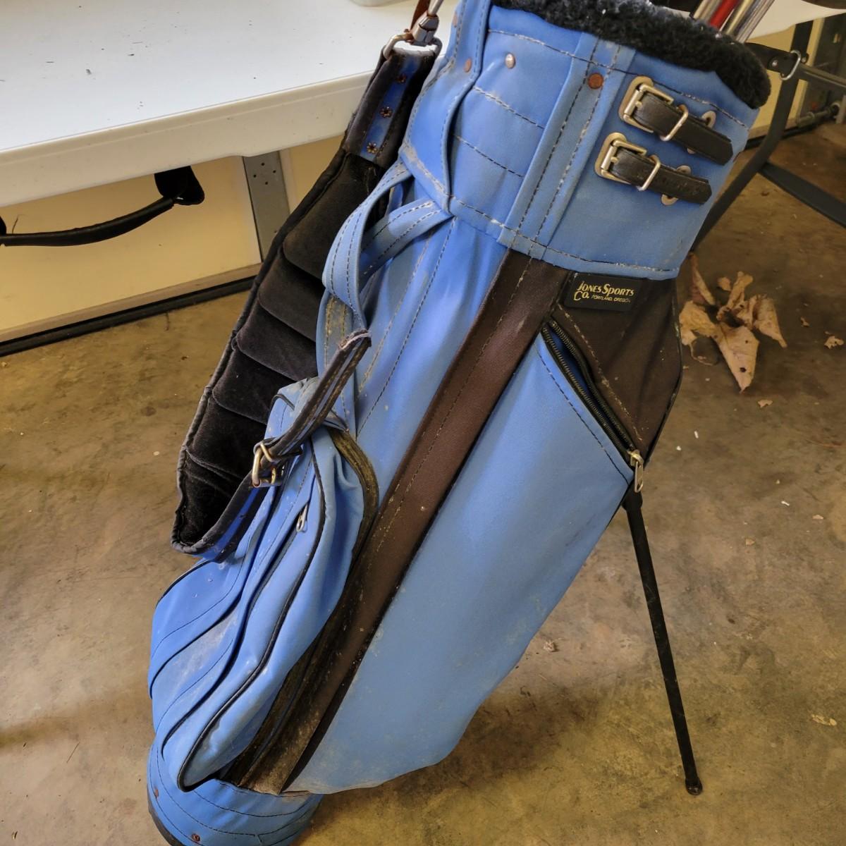 An assortment of golf clubs, a golf bag and more in fair to good condition. The golf bag has been in a garage and does show some mildew, but could be cleaned. The bag is made by Jones Sport Co. The clubs are an assortment of different brands, but make up an entire set. Manufacturers include PalJoey drivers, Taylor Made, Ping and a wooden driver. The longest driver is a JoeyPal 1 and has a 41" shaft. Irons and wedges are manufactured by McGregor, Kinetic and Ping. The 3 iron has a 37.5" shaft. Two putters are included made by Spalding and Glidden. Lot also includes a left hand glove, tees and a lot of balls, likely over 200. Local pickup only