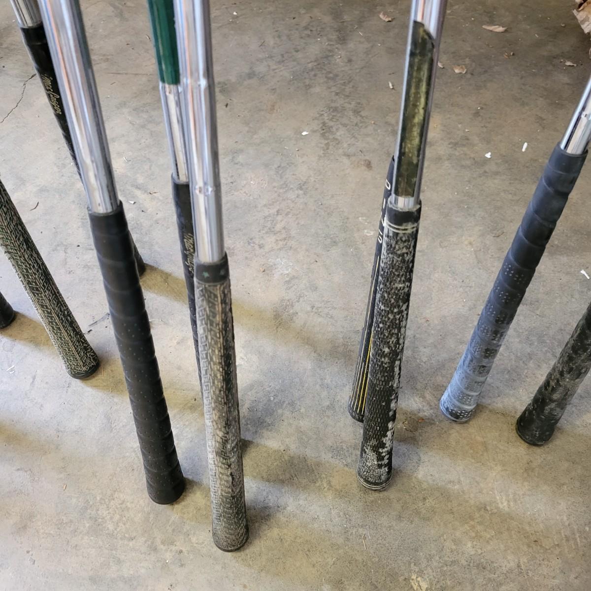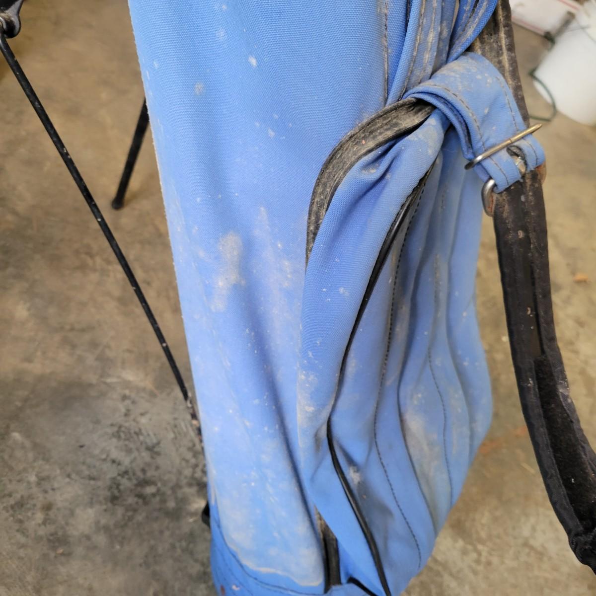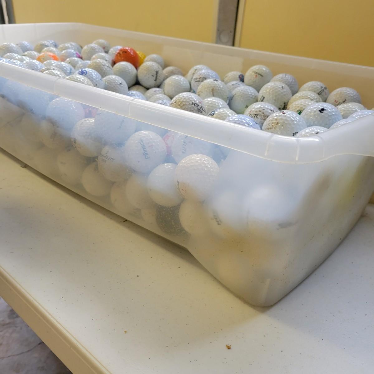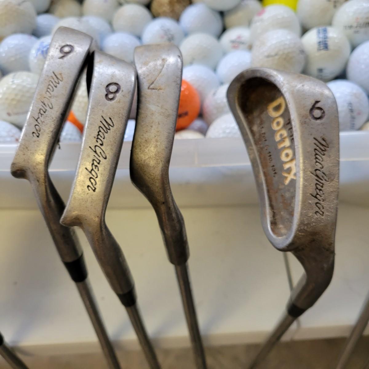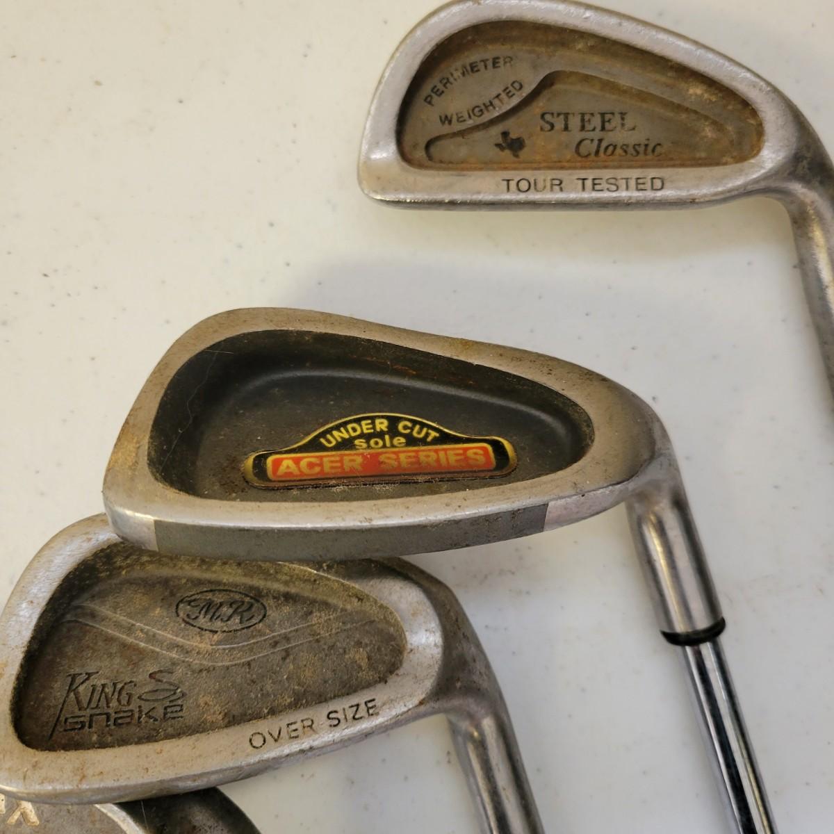 An assortment of golf clubs, a golf bag and more in fair to good condition. The golf bag has been in a garage and does show some mildew, but could be cleaned. The bag is made by Jones Sport Co. The clubs are an assortment of different brands, but make up an entire set. Manufacturers include PalJoey drivers, Taylor Made, Ping and a wooden driver. The longest driver is a JoeyPal 1 and has a 41" shaft. Irons and wedges are manufactured by McGregor, Kinetic and Ping. The 3 iron has a 37.5" shaft. Two putters are included made by Spalding and Glidden. Lot also includes a left hand glove, tees and a lot of balls, likely over 200. Local pickup only