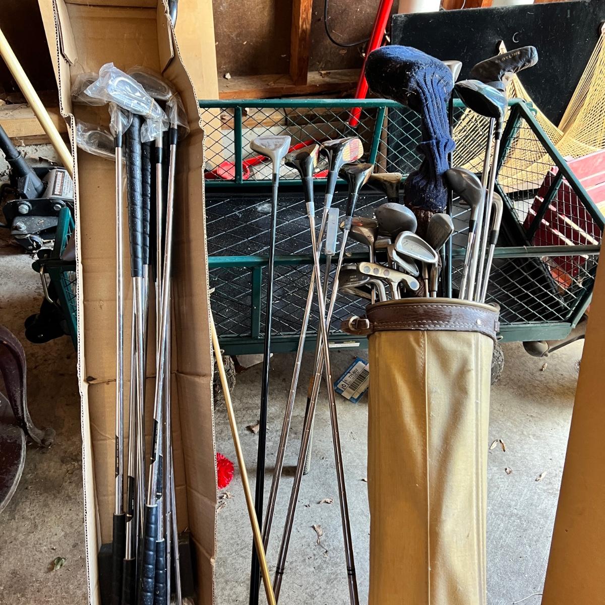 Some new in box. Clubs and one caddy. NOTE: PICK UP ONLY IN DUNKIRK MD.