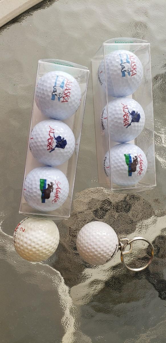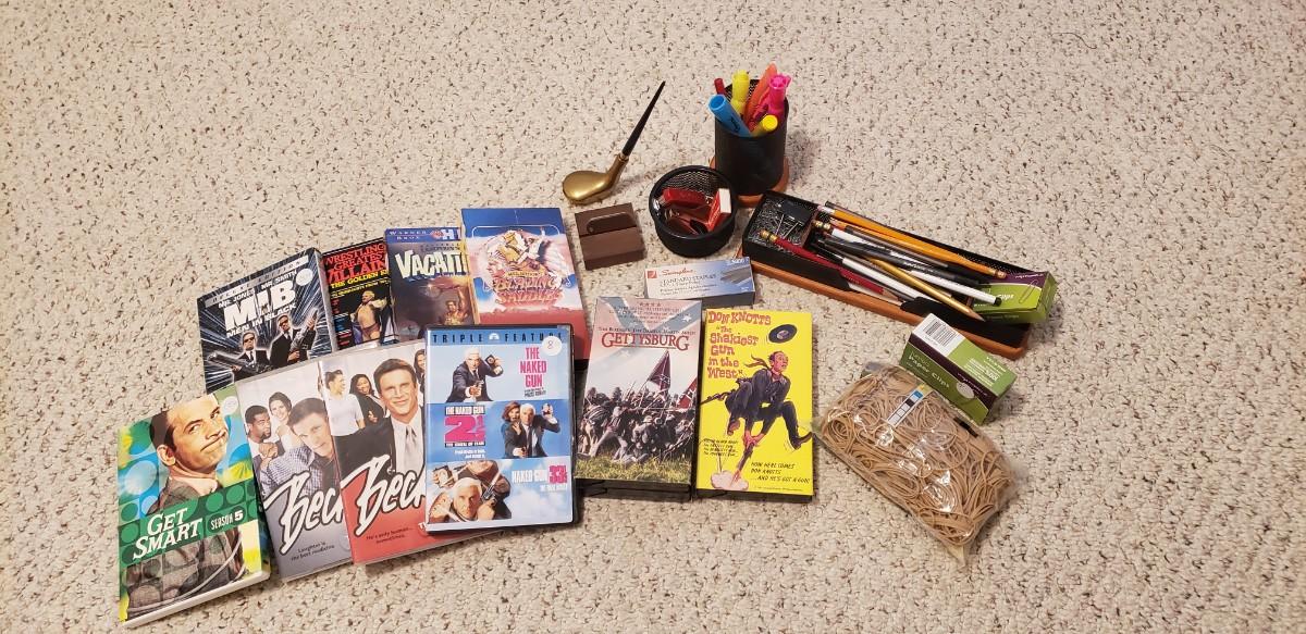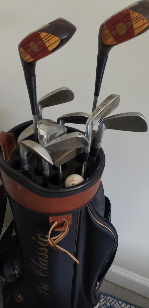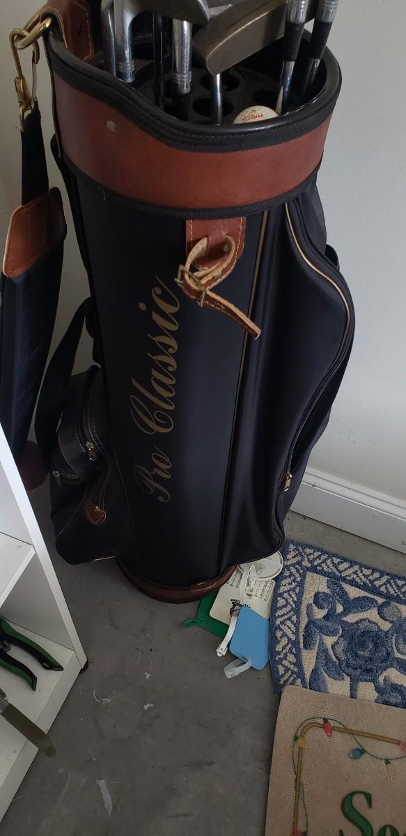 Golf clubs & bag filled with balls & tees. Wilson, McGregor, Titleist. Keychain golf ball, Golf book, travel book, collection of movies dvd & vhs & office supplies.