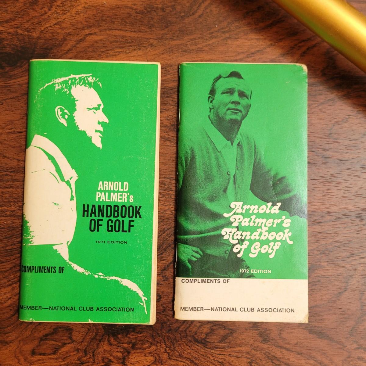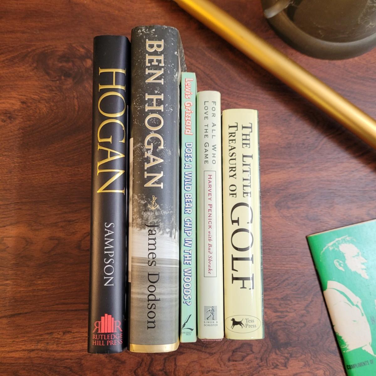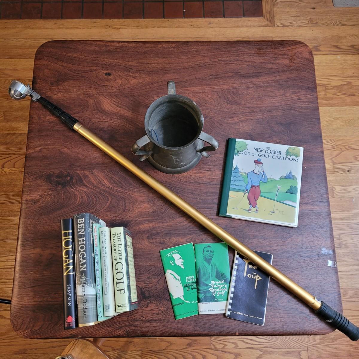 Collection of golf books including biographies of Ben Hogan, guides by Arnold Palmer, and humor books. Metal engraved decorative pot in fair condition with scratches and dent at lip. Ball retrieving tool in good condition, locking of extended rod works by tightening metal part. Tool measures approximately 79"L fully extended, 45" compact. Shipping available.