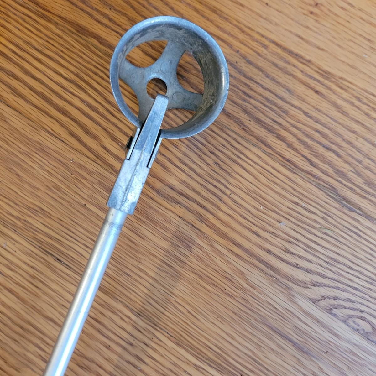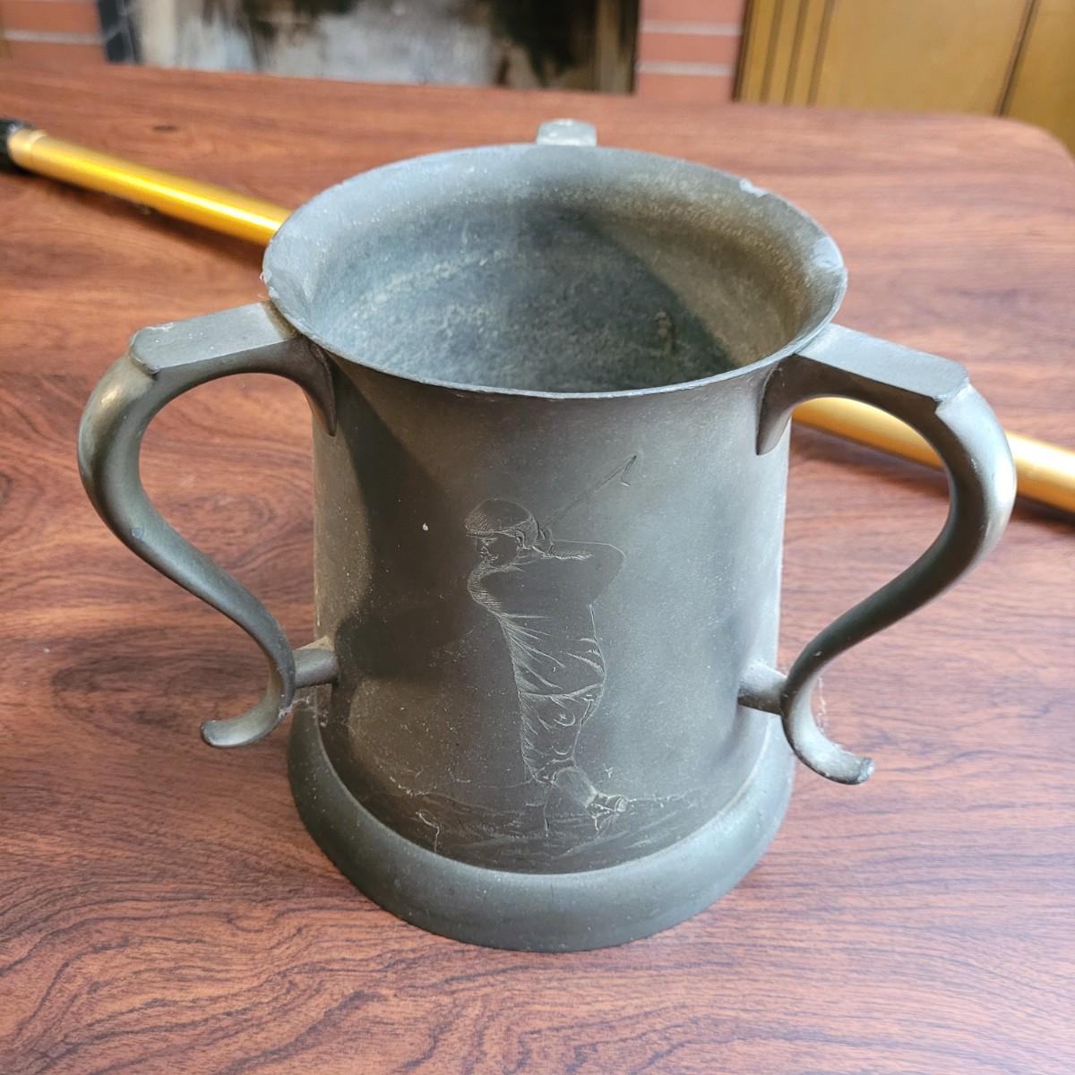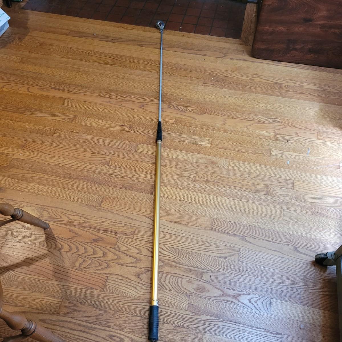 Collection of golf books including biographies of Ben Hogan, guides by Arnold Palmer, and humor books. Metal engraved decorative pot in fair condition with scratches and dent at lip. Ball retrieving tool in good condition, locking of extended rod works by tightening metal part. Tool measures approximately 79"L fully extended, 45" compact. Shipping available.