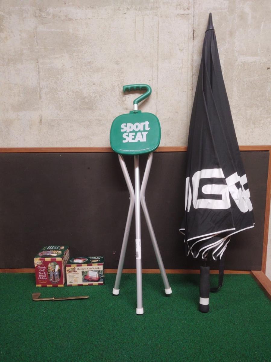 Umbrella, sport seat, and desk items.