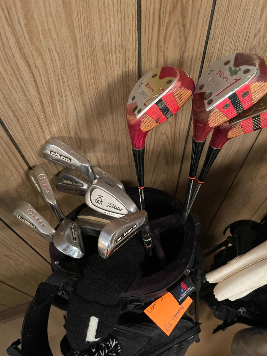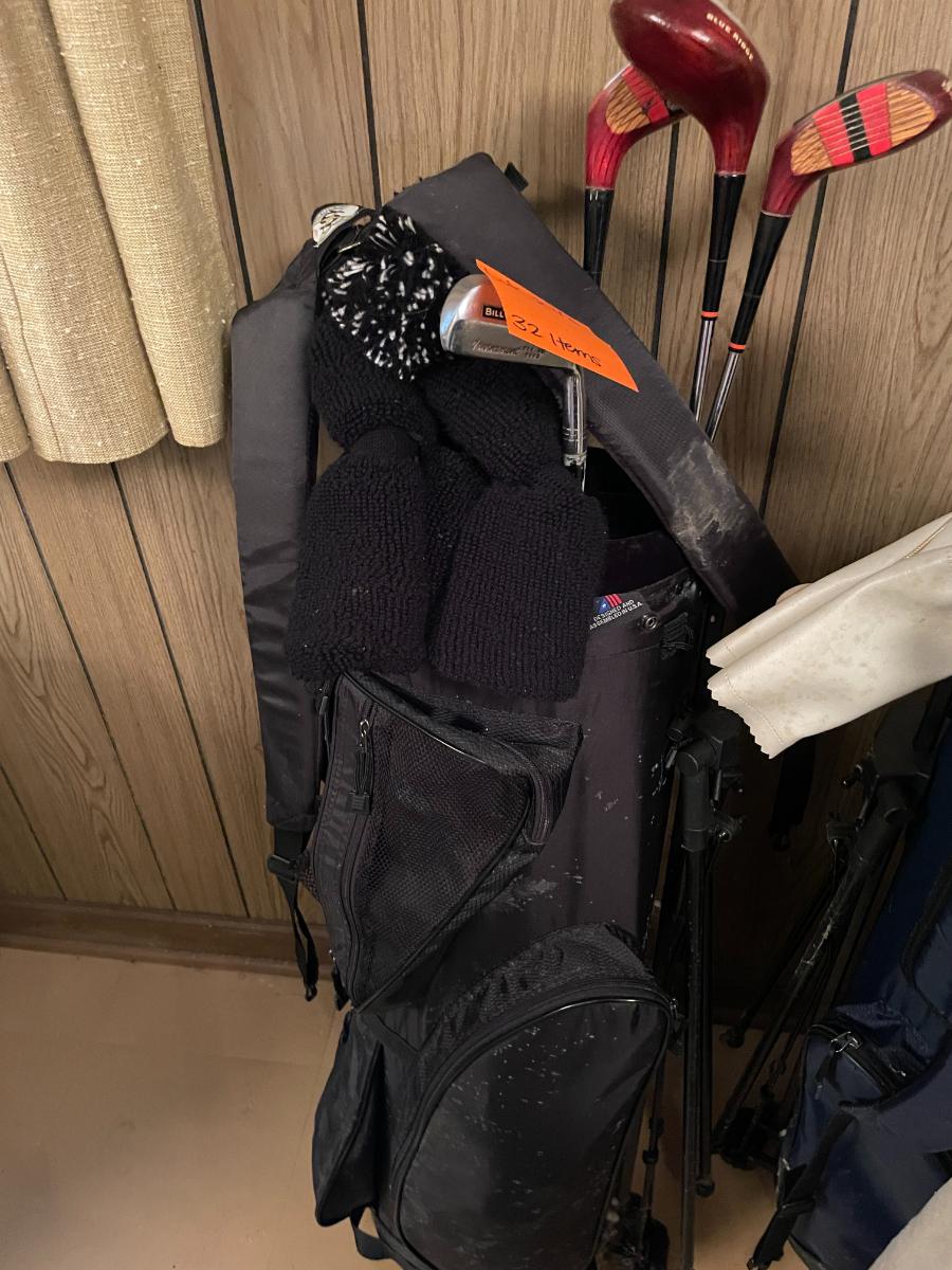 Golf Set #1 includes various brands of golf balls, tees, clubs, sock covers