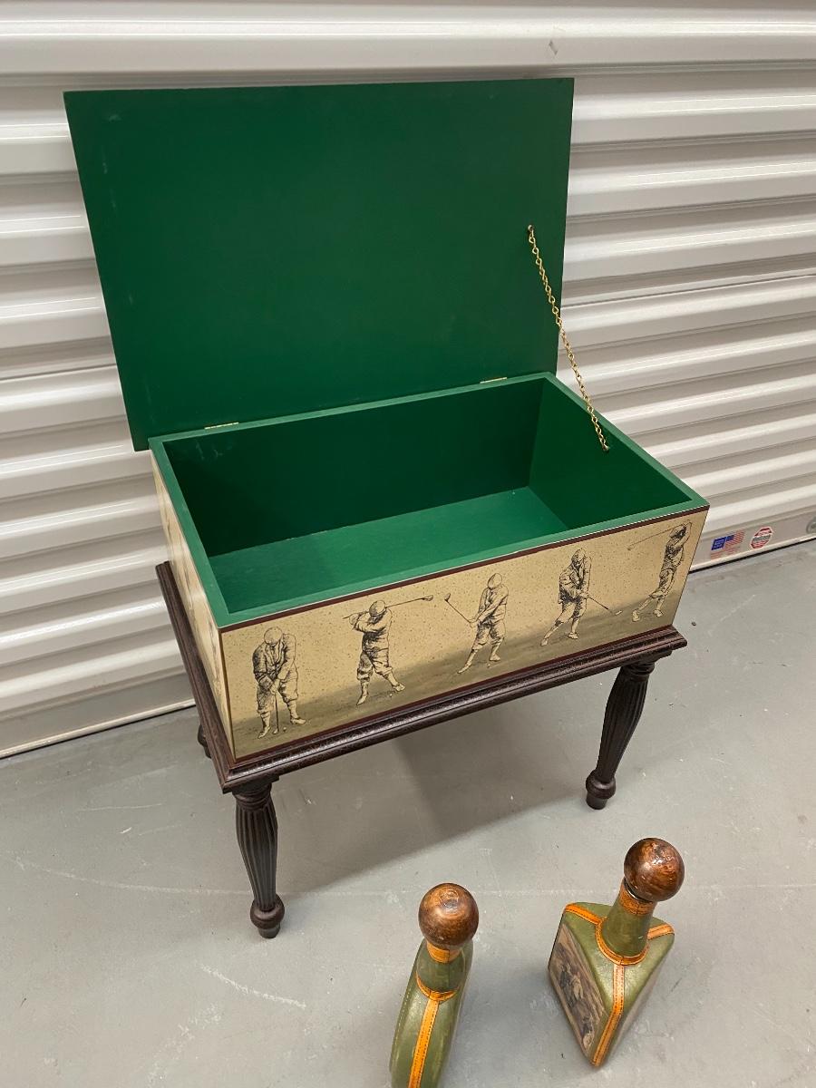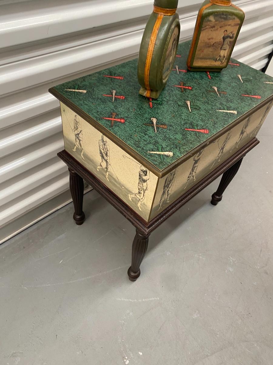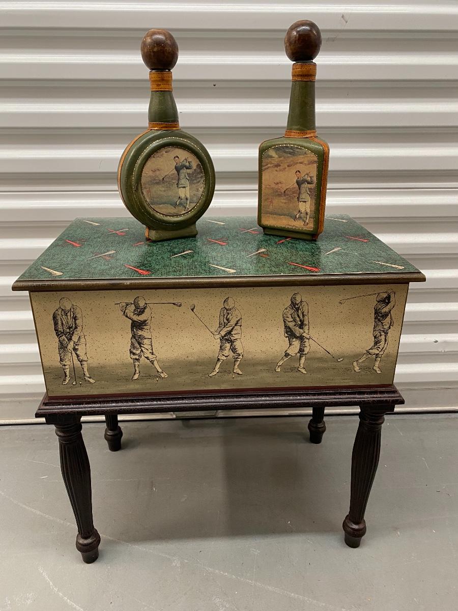 This is a small table with a golfing theme. The lid of the table lifts open. The table measures 21 inches wide x 14 inches deep x 21 inches high. It includes two decorative golf themed Decanters. Pick Up of Purchased Items will be on Saturday the 16th at Morningstar Storage in Bluffton, SC. 1110 Fording Island Rd, Bluffton, SC 29910. At the end of the sale todayI will send out a SignUpGenius link to the winning bidder to schedule your your pick up time along with a contact phone number.
