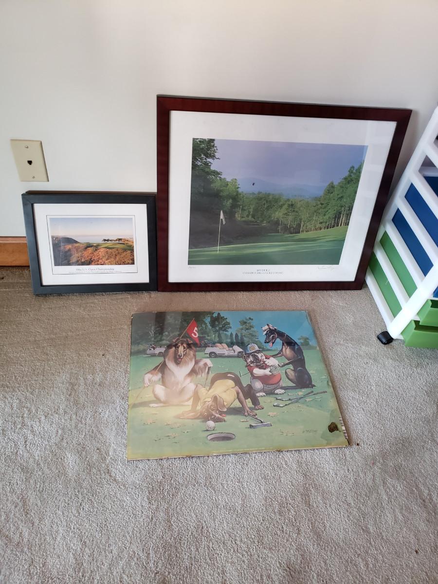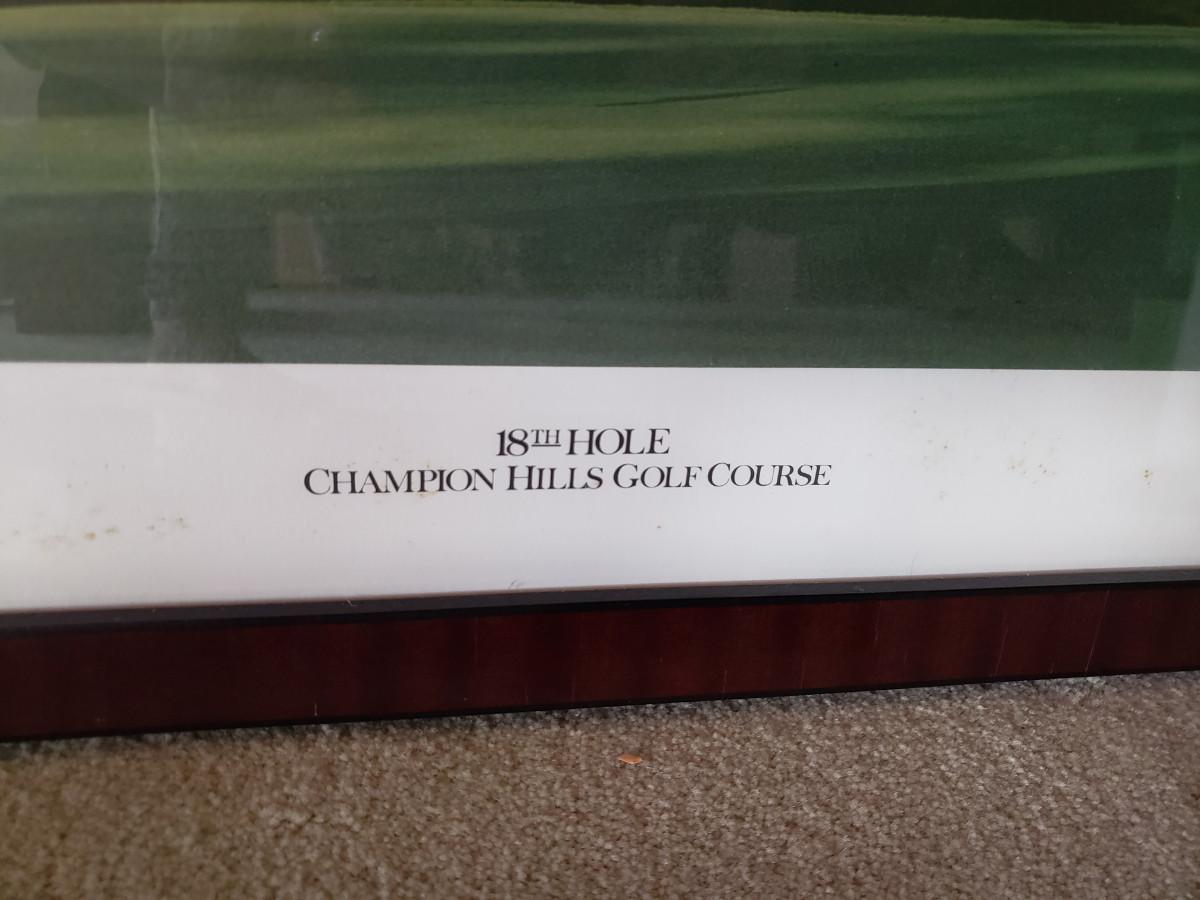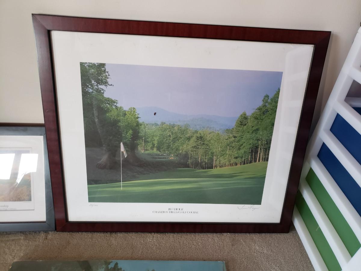 Various pieces of golf themed artwork. Includes a litho of the 18th Hole at the Champion Hills Golf Course. That piece is numbered 299/400 and signed by Tom Fazio.