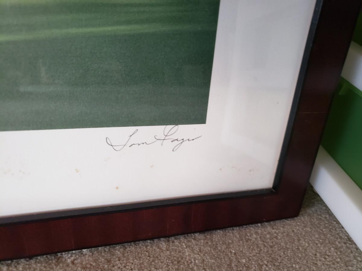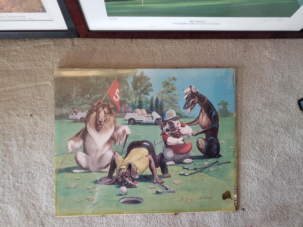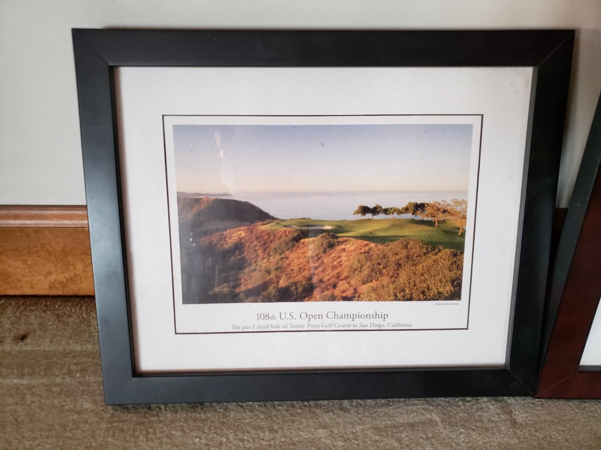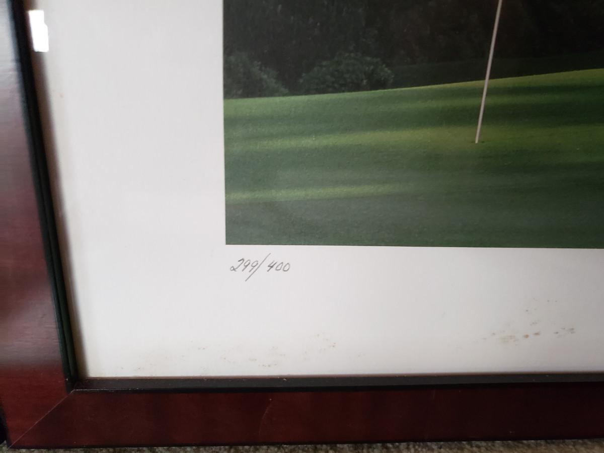 Various pieces of golf themed artwork. Includes a litho of the 18th Hole at the Champion Hills Golf Course. That piece is numbered 299/400 and signed by Tom Fazio.