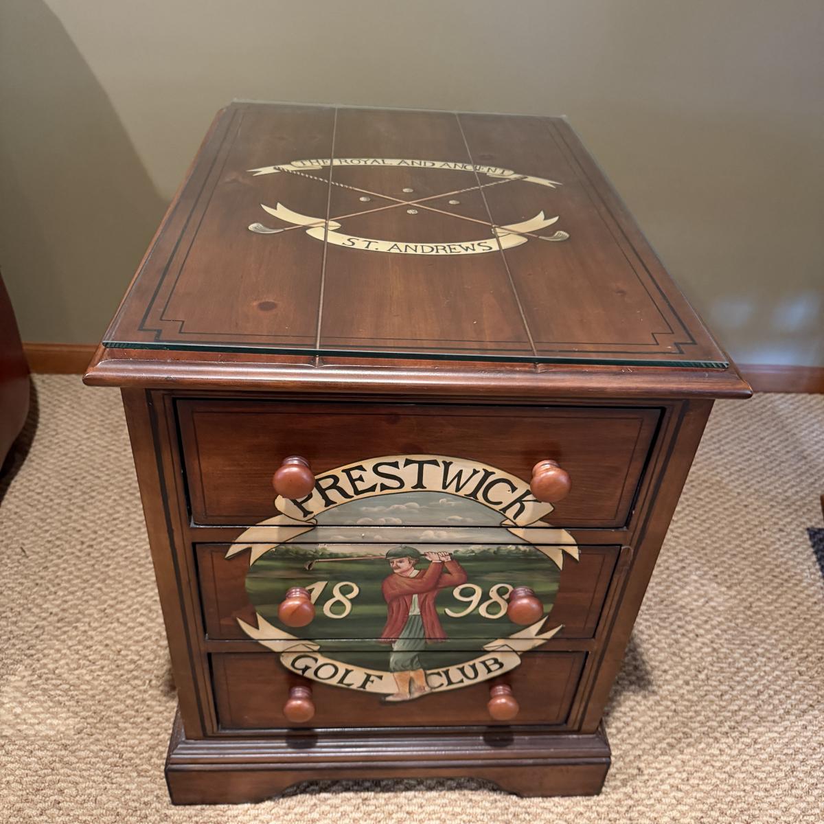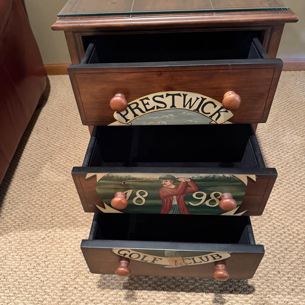 Lot includes a wooden golf themed three drawer end table that measures 20” x 27” x 25”H. Also includes a piece of glass on top.