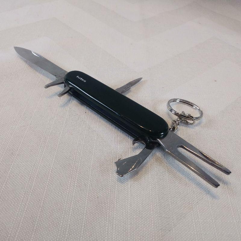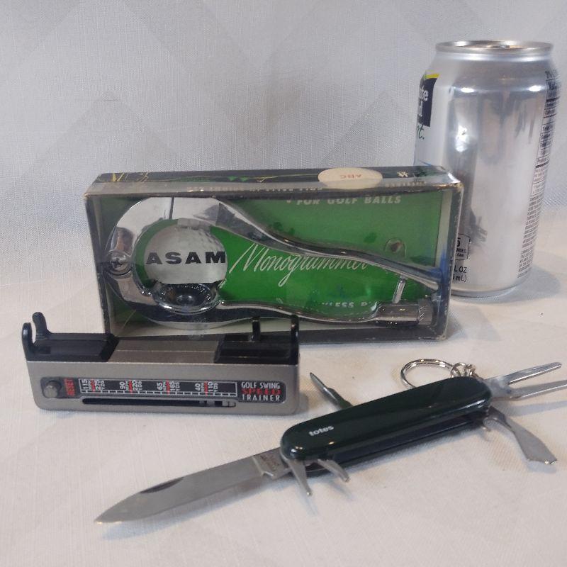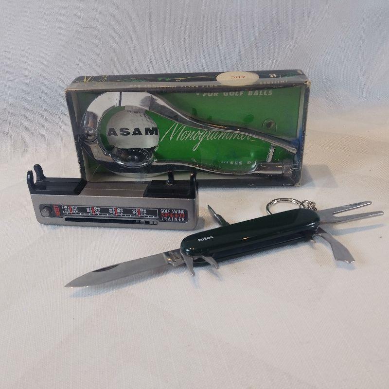 This auction lot is for a Golf Trio. Beginning with a set of golf essentials. One is new-in-box Ball Monogrammer. The second item is a Golf Swing Speed Trainer and lastly is a Golf Pocket Knife by Totes. All appear unused and are in very good condition