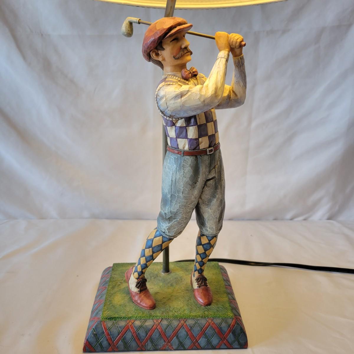 A resin molded lamp of a golfer in vintage clothing with a blue and white checkered shade. It has a two way switch on a metal rod and measures approximately 12"D x 26"H. Shipping available
