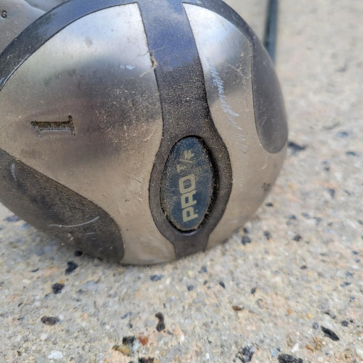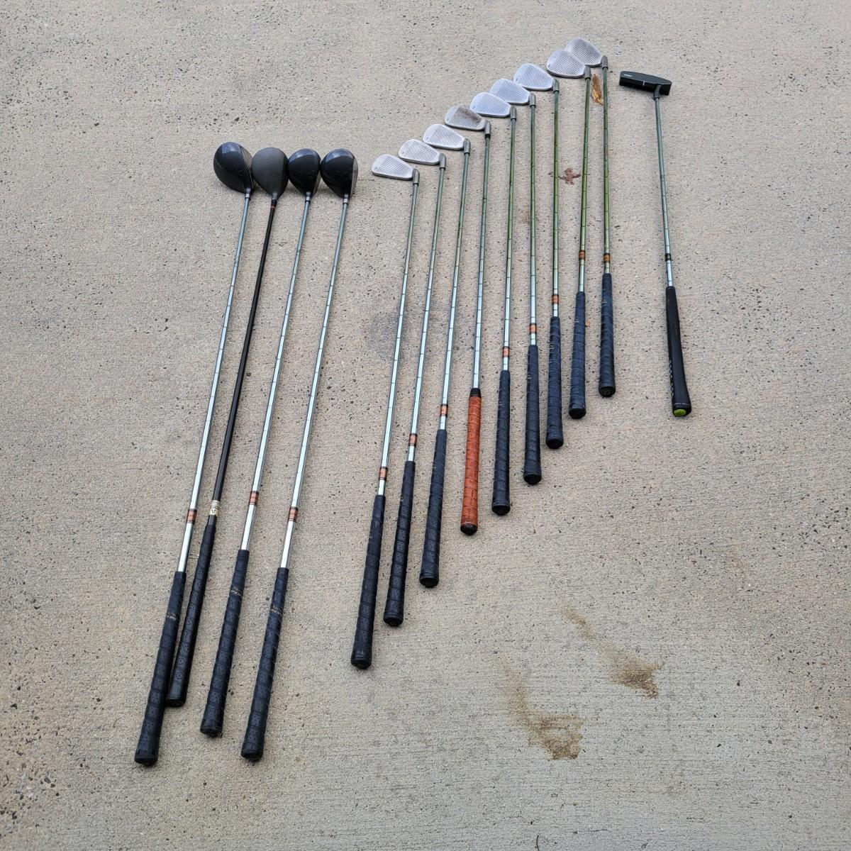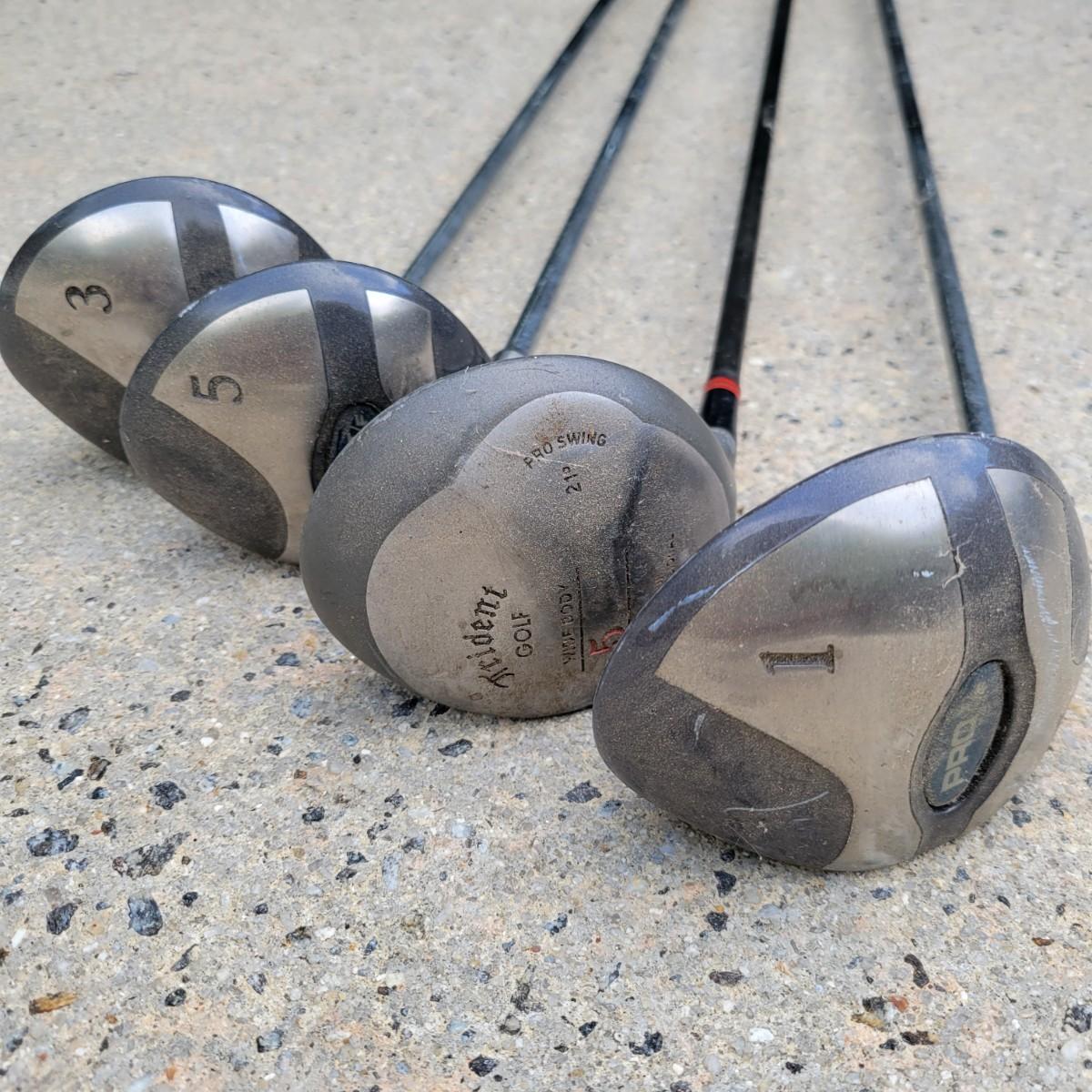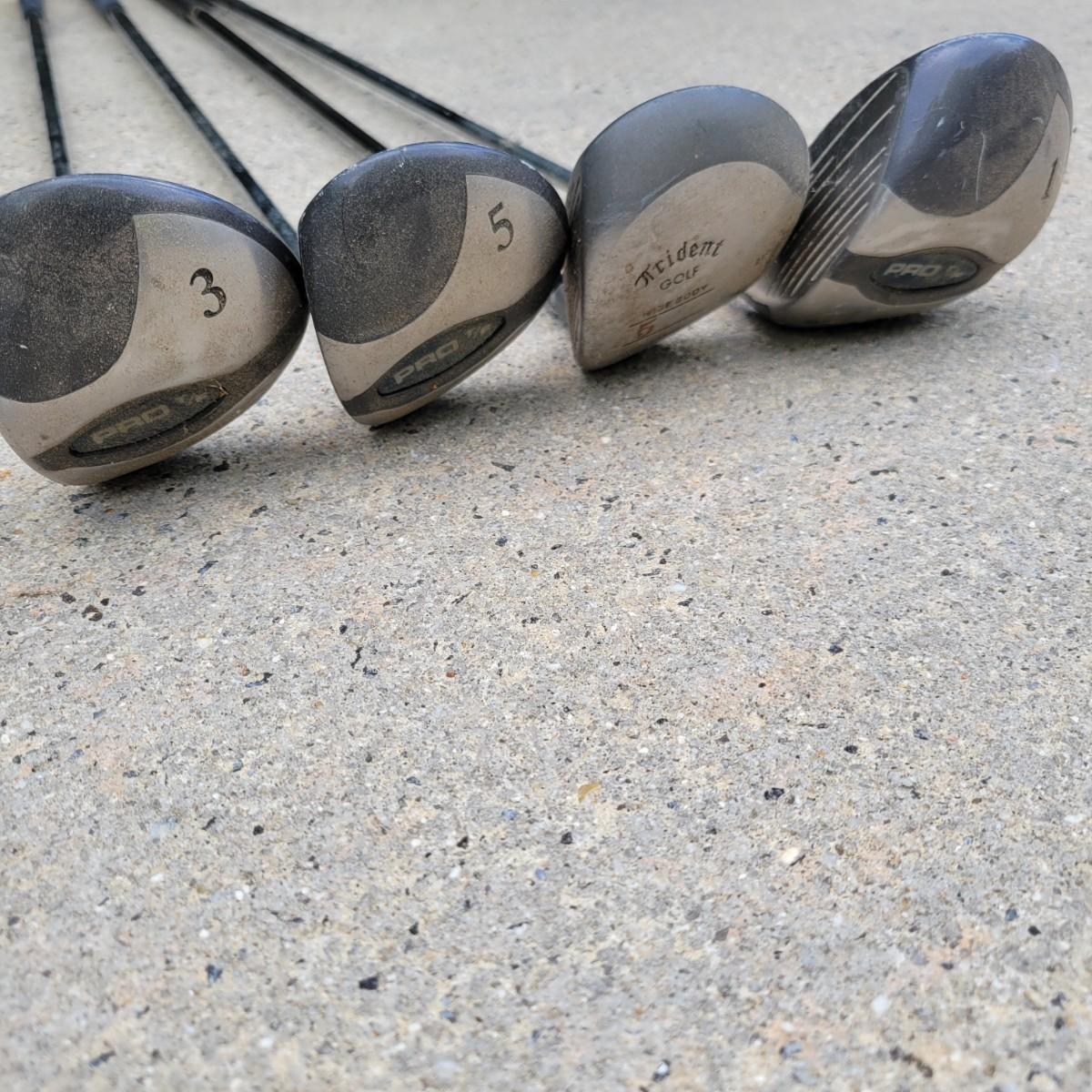 A set of left handed GolfPride golf clubs that includes four drivers, one of which is a Trident club. Shaft length on the 1 wood is 42.5". A full set of irons are also included with a pitching wedge. The 3 irons shaft measures approximately 39". The putter is a Ray Cook. This lot also includes a Titleist bag that has an abundance of balls and tees. Local pickup only