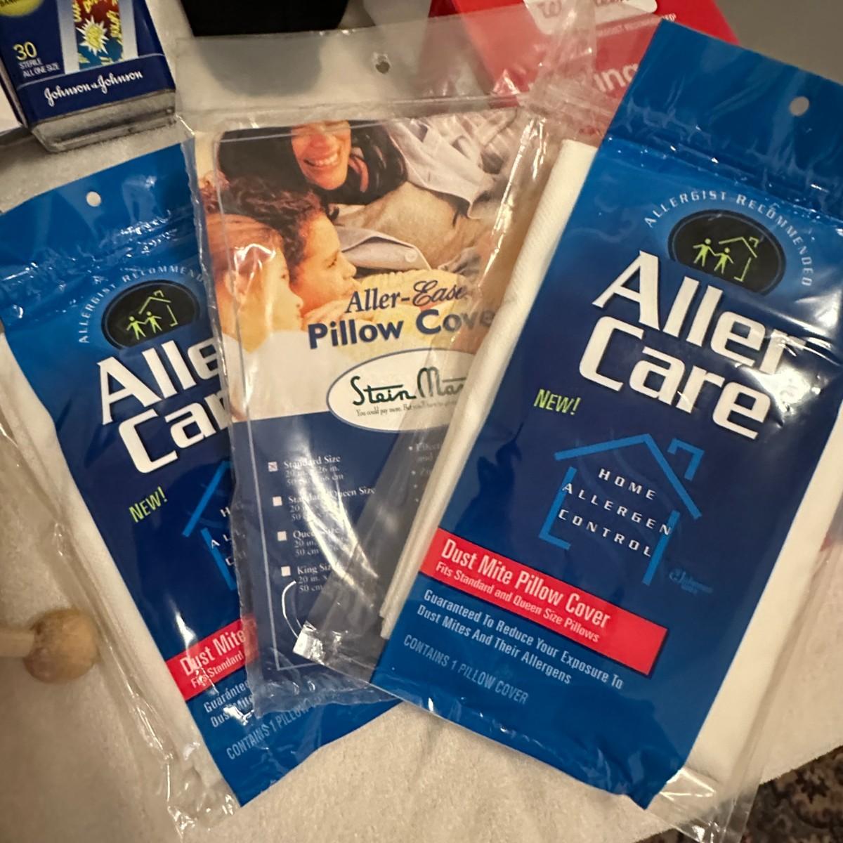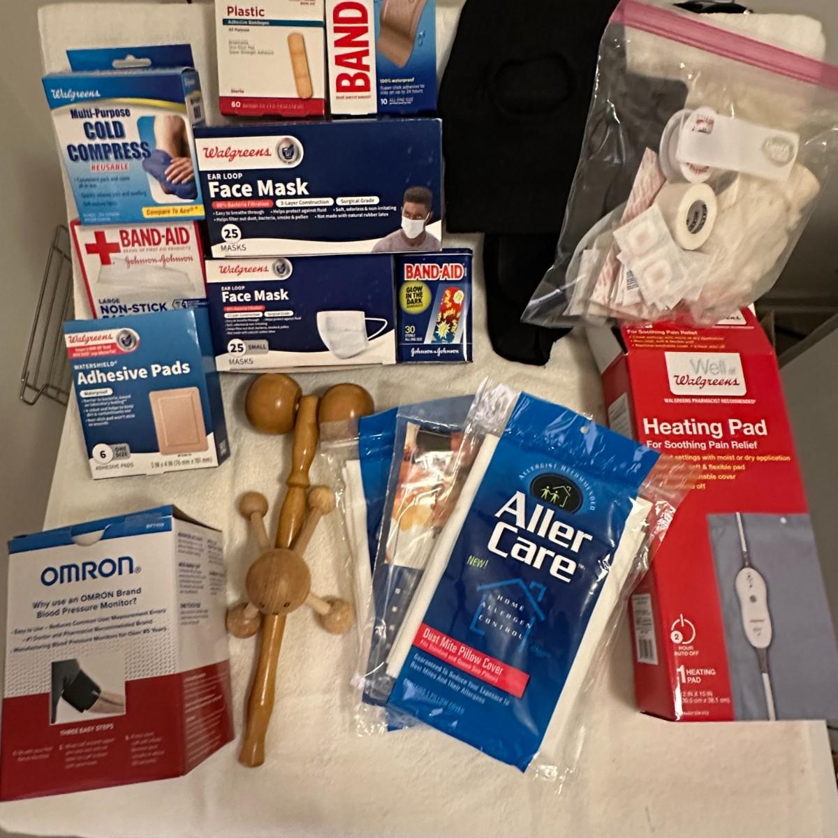 Good Health Related Items- bandages, face masks, heating pad (tested), blood pressure monitor (tested), cold compress, back massagers, 3 new allergen pillowcases