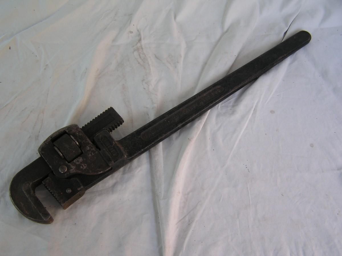 Good heavy steel pipe wrench w/good sharp teeth, measures 21"+ from tail to jaw