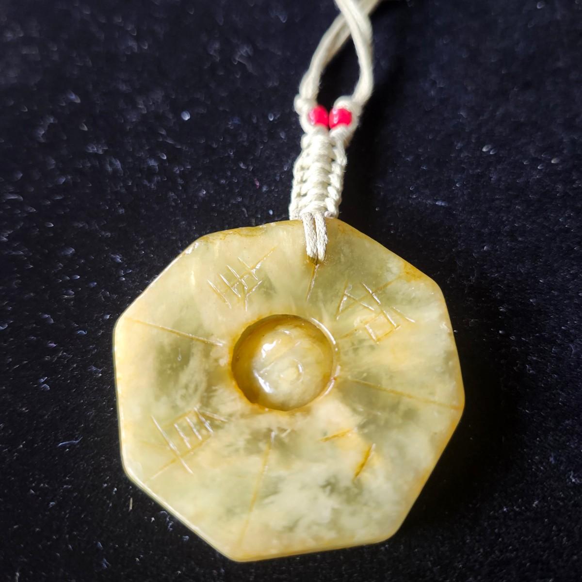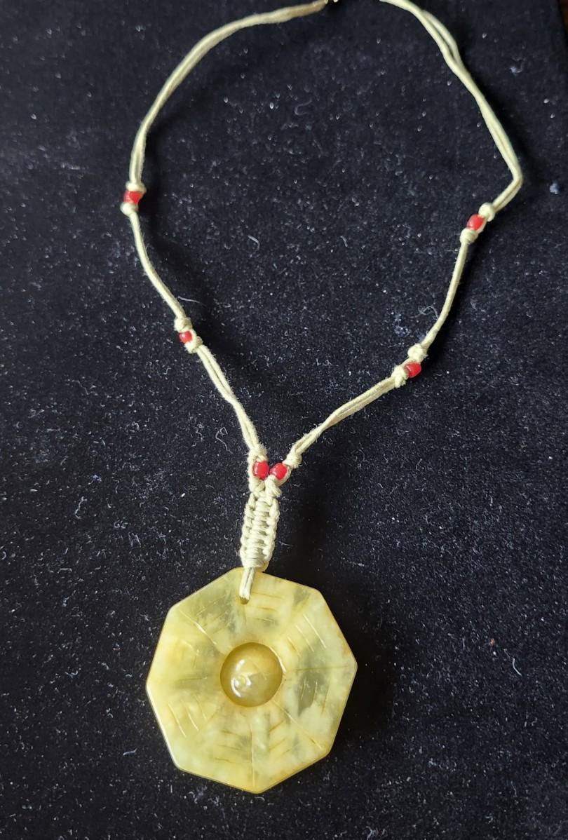This lovely pendant has a 9 " drop to the pendant, Carved Jade. Very good condition.