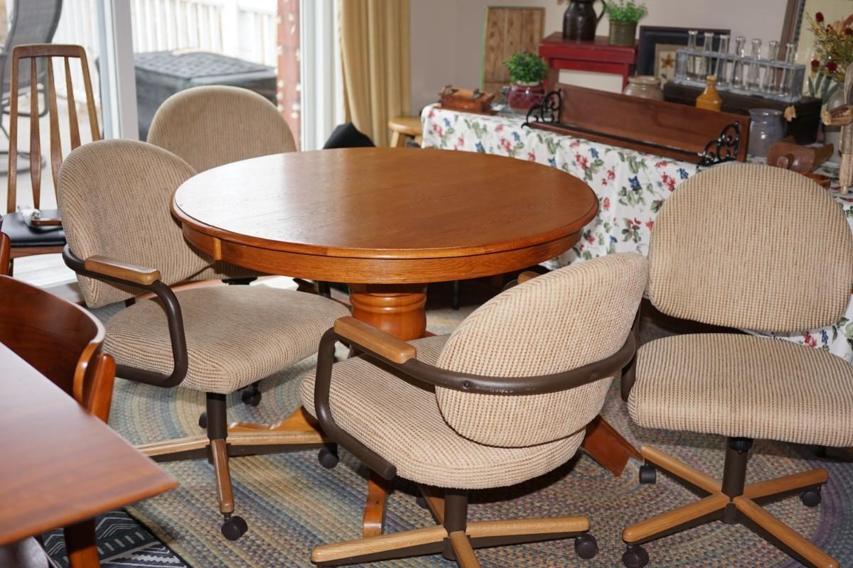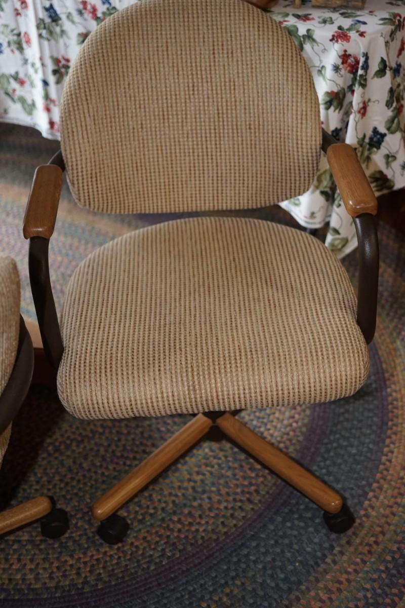 very good condition 41" round top natural oak table of good color, Pedestal base of good design. four chairs that swivel and have an excellent color of a beige blend tweed upholstered armchairs. this isn't like grandmas. Much more of a contemporary flair with black castors and black metal arm rests with matching tweed on the arm rests.
