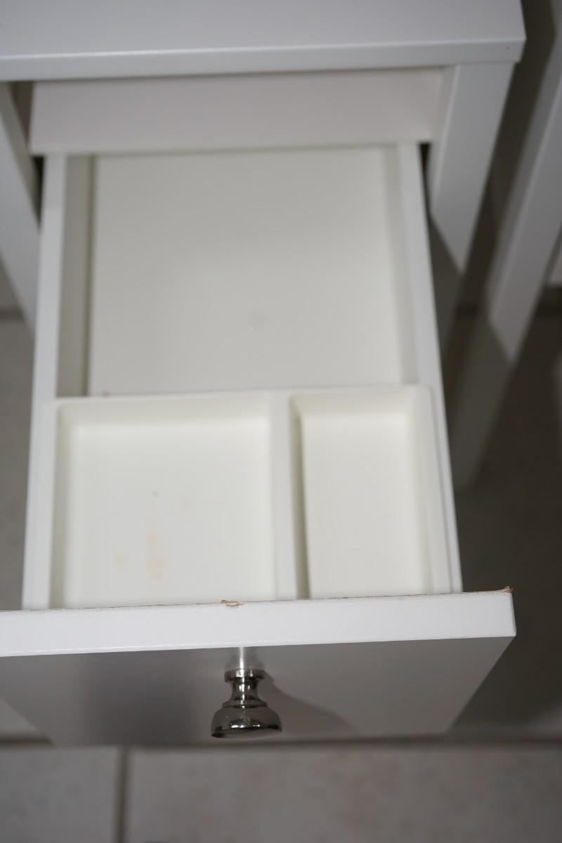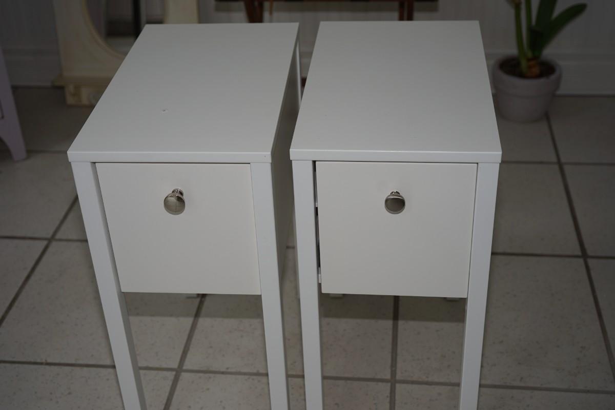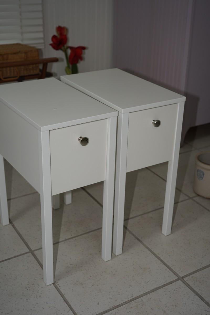 pair of wooden end tables painted white with chrome knobs. Inside the top drawers are sorting trays of hard plastic to sort smaller objects.