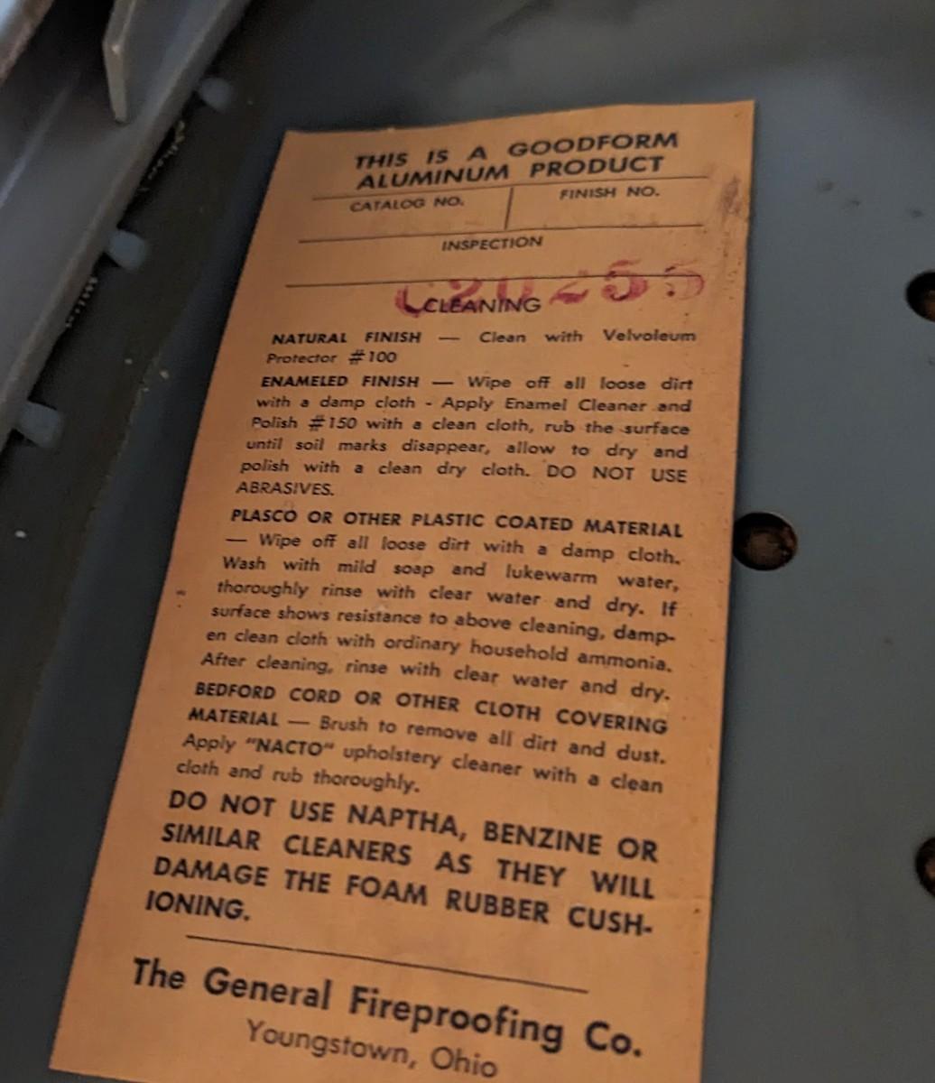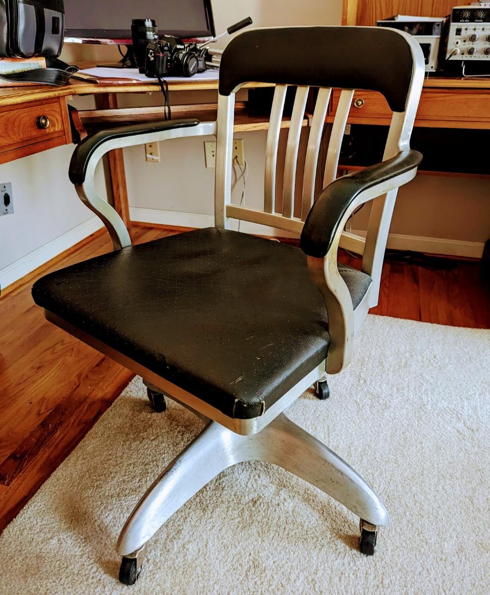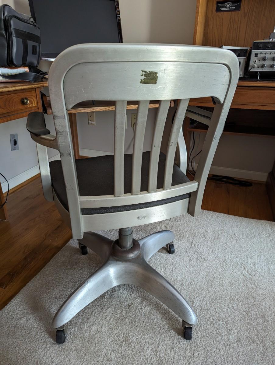 General Fireproofing Co. mid-century modern American industrial aluminum arm chair, the X-form base on casters, swivel seat with open splat-back, label to underside marked "Good Form".. 33.25" H x 22" W x 27" D.