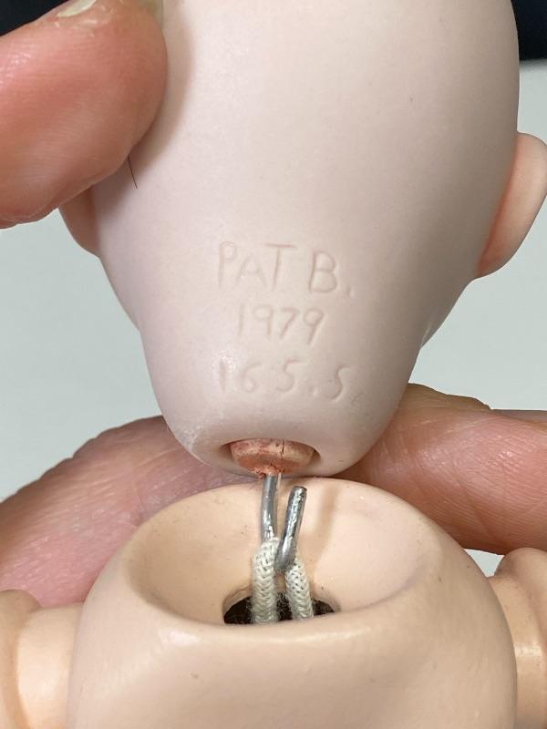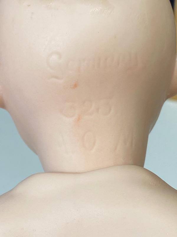 Bisque jointed doll just waiting to be finished. Bright green side looking eyes, no hair. Head is marked Germany 323 A.O.M. She has paper in her head to help keep eyes in place. Stands about 11" tall. She has what looks like a fine scratch possibly crack down the left side of face, very faint but it is there.