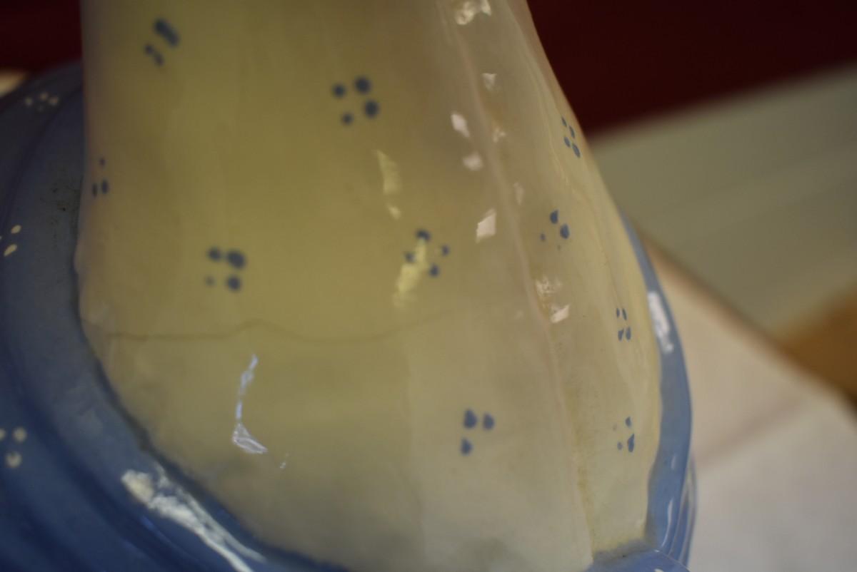Some crazing seen on the inside. There are a couple of hairline cracks seen as well. No makers mark on the base. The rim of the jar has a couple of small chips.