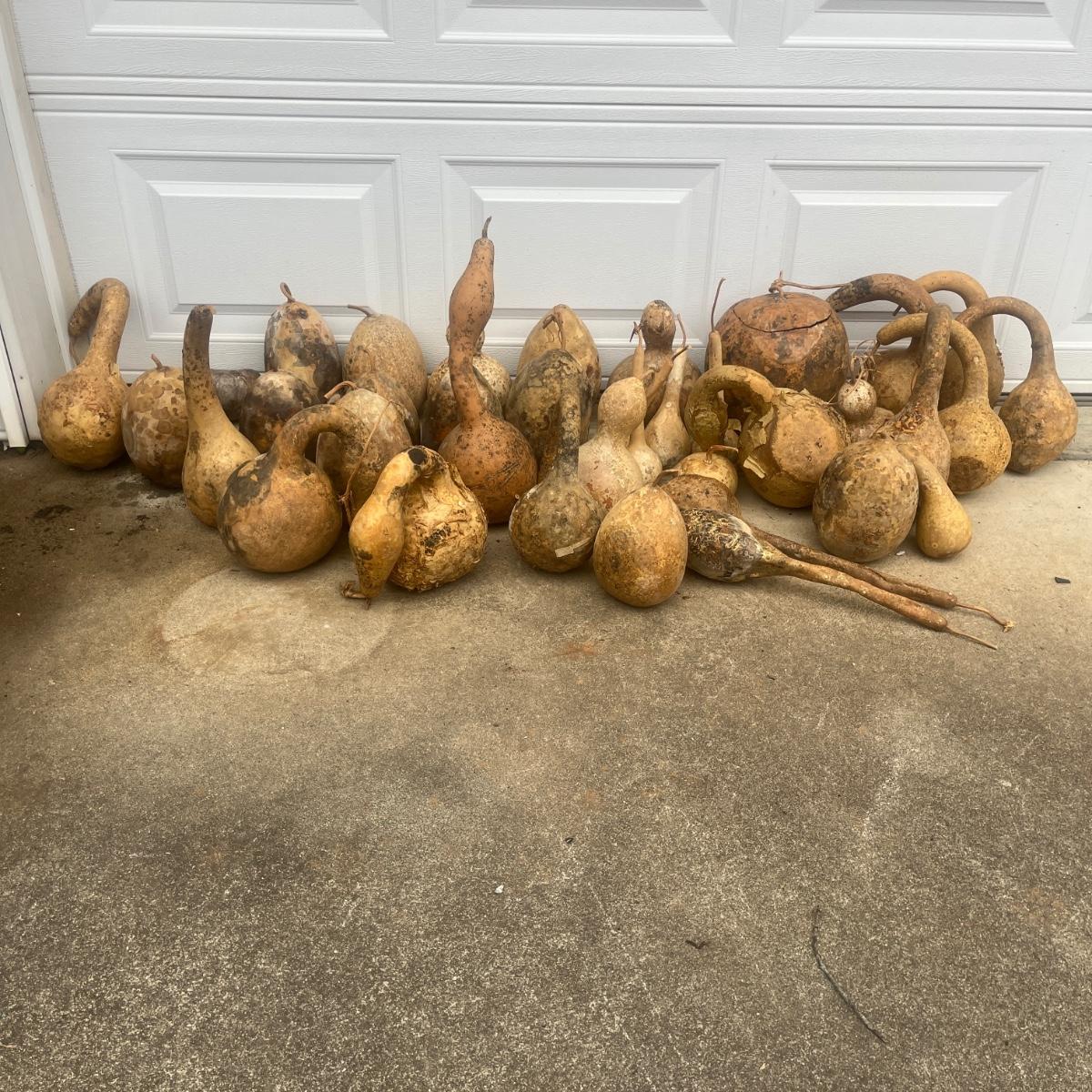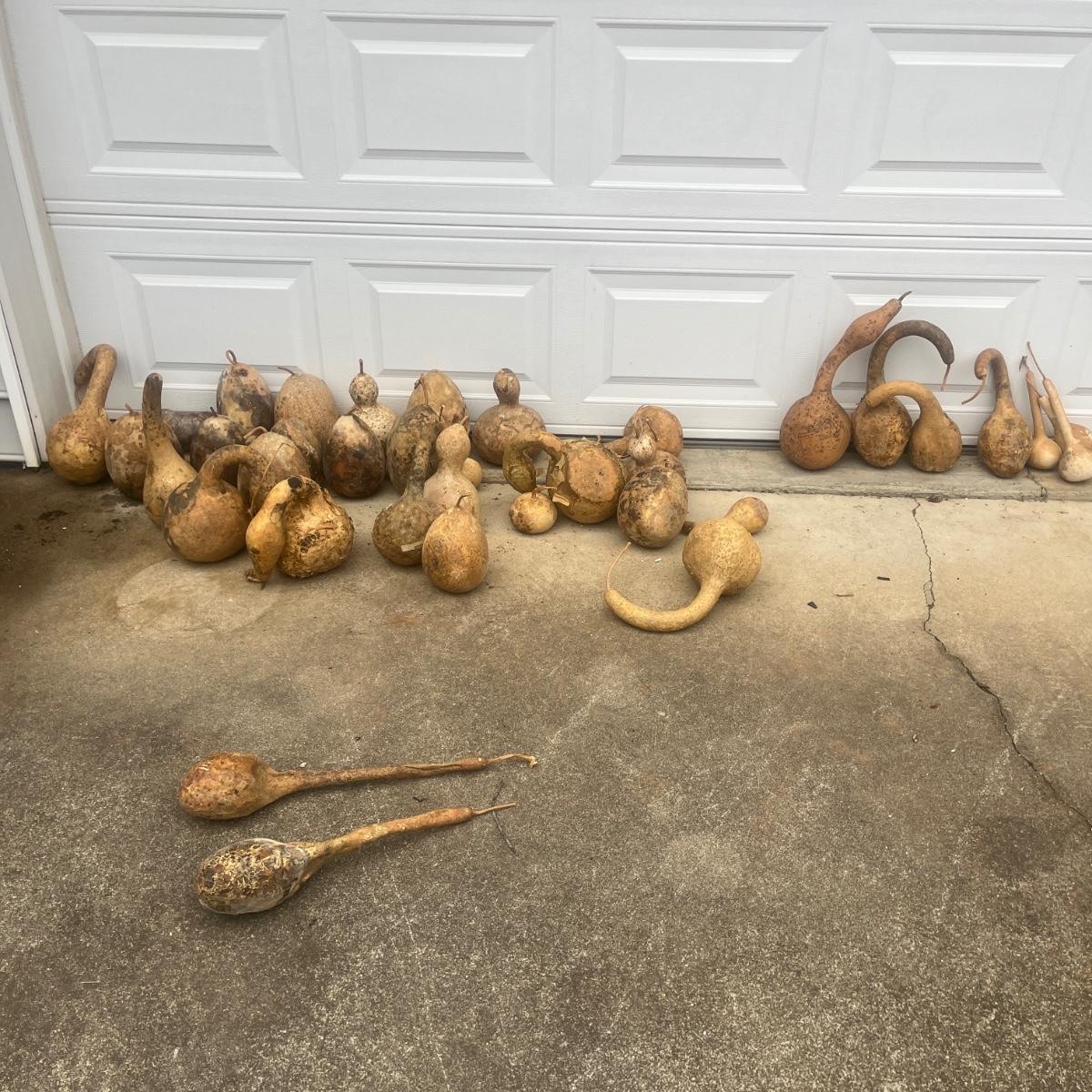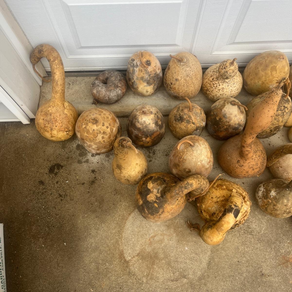 Lot includes over 30 gourds in many varieties, including dipper. Often used for seasonal decor and arts and crafts, like birdhouses. The tallest gourd measures 8”D x 18”H. These were likely grown onsite in the spacious gardens. They were drying in the rafters of the garage. There are some that could probably use another season to finish drying out. Please see photos for details. They will be bagged up for the buyer.
