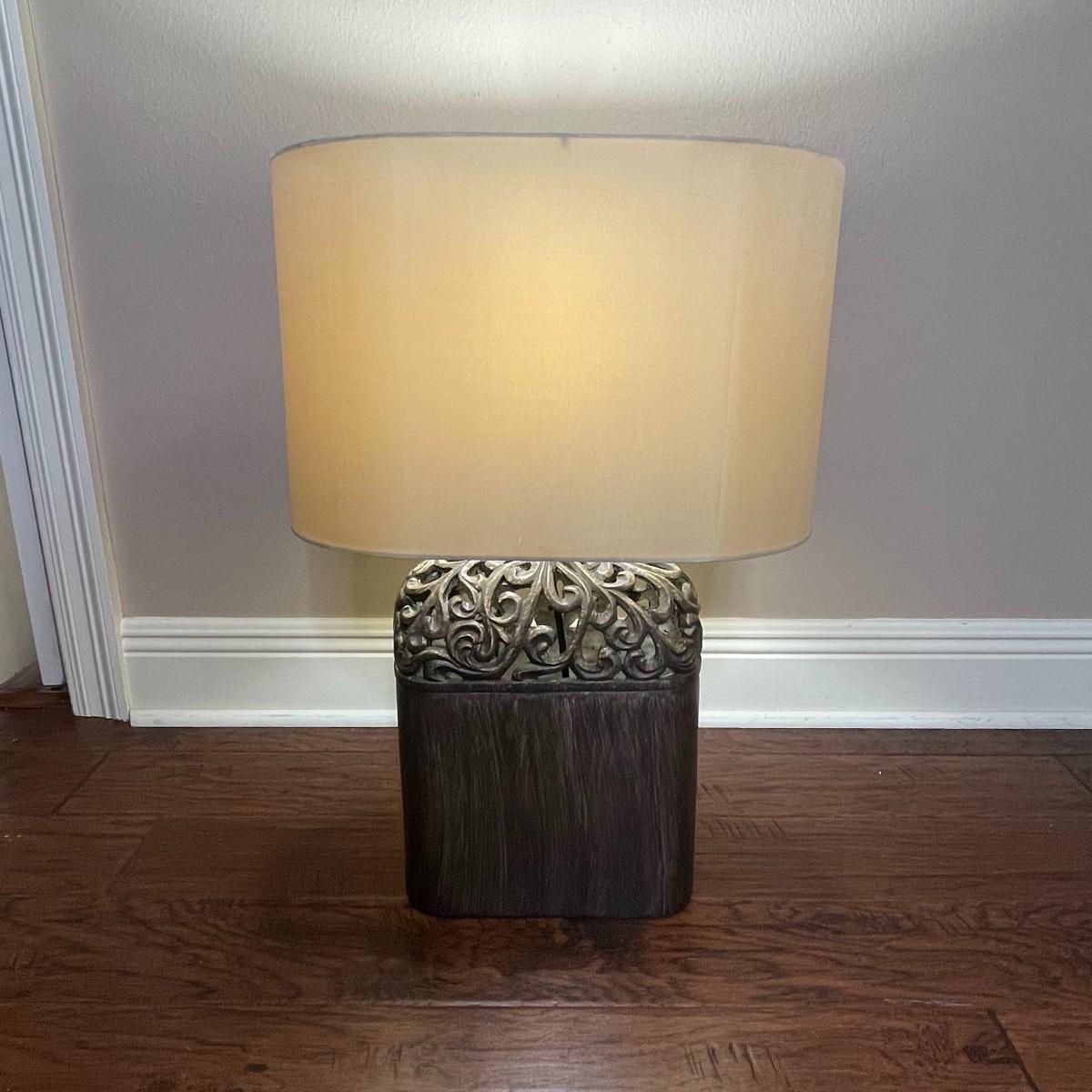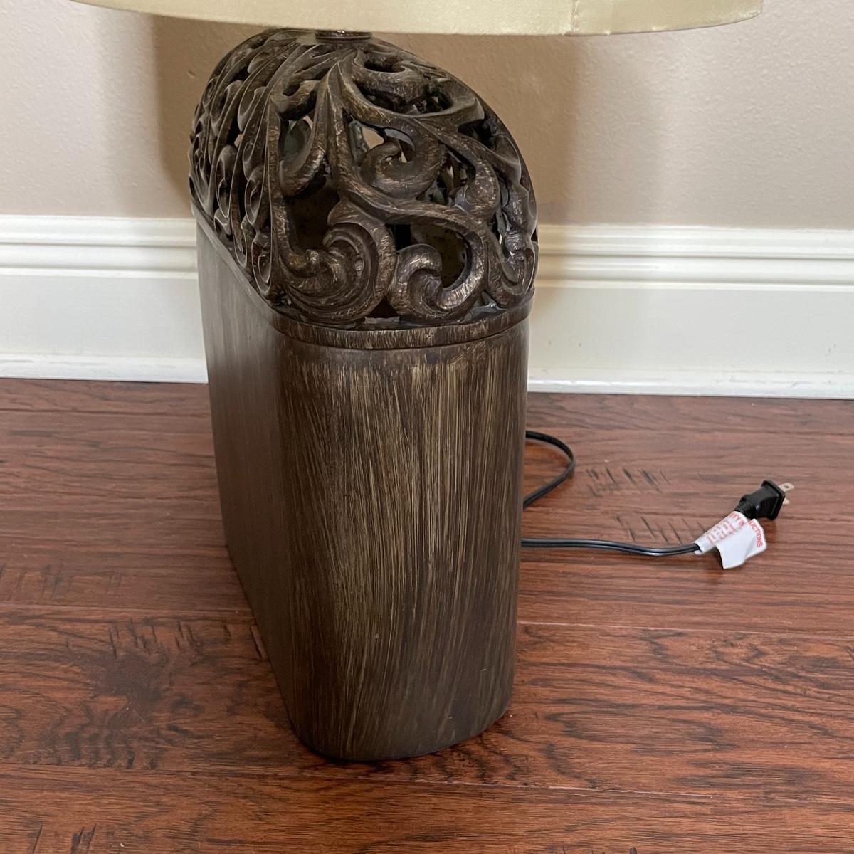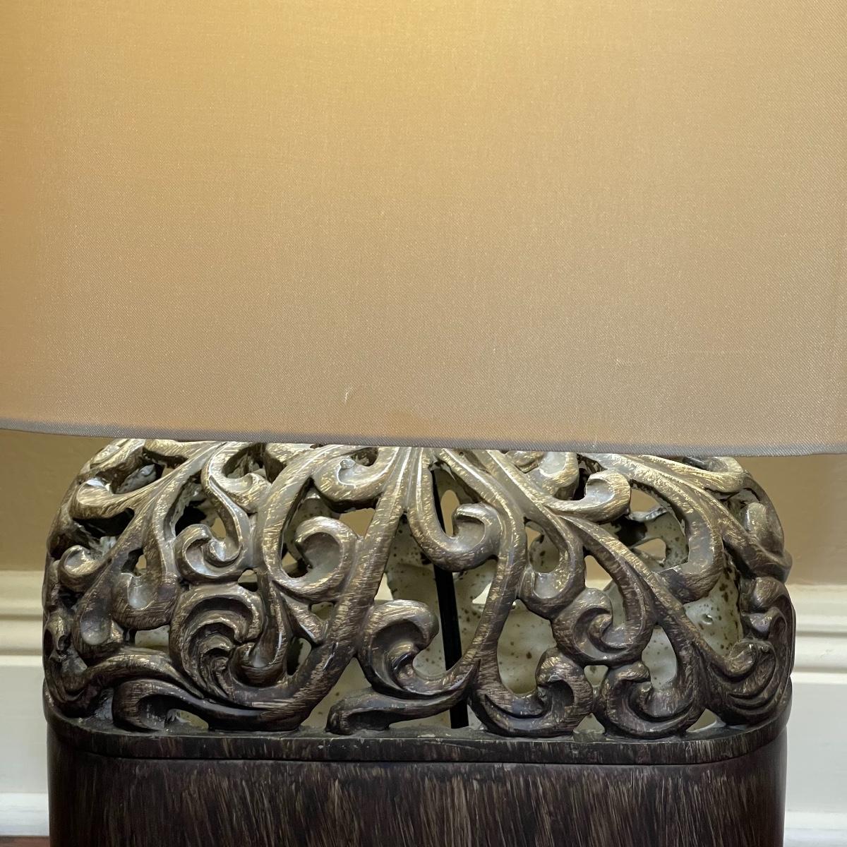 Made of heavy resin. Beautiful bronze paint and filigree design. Oval drum lampshade is in good condition.