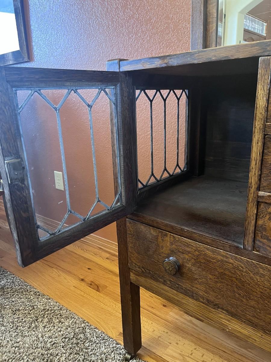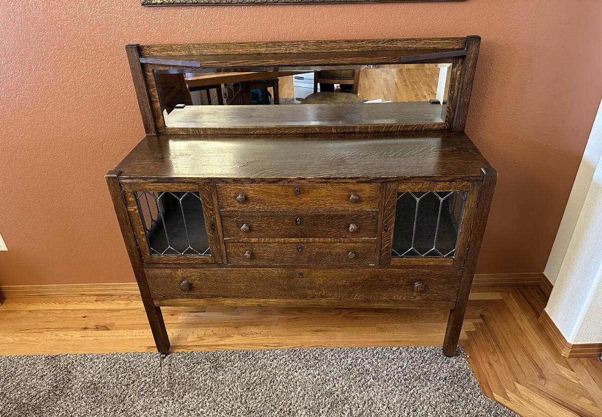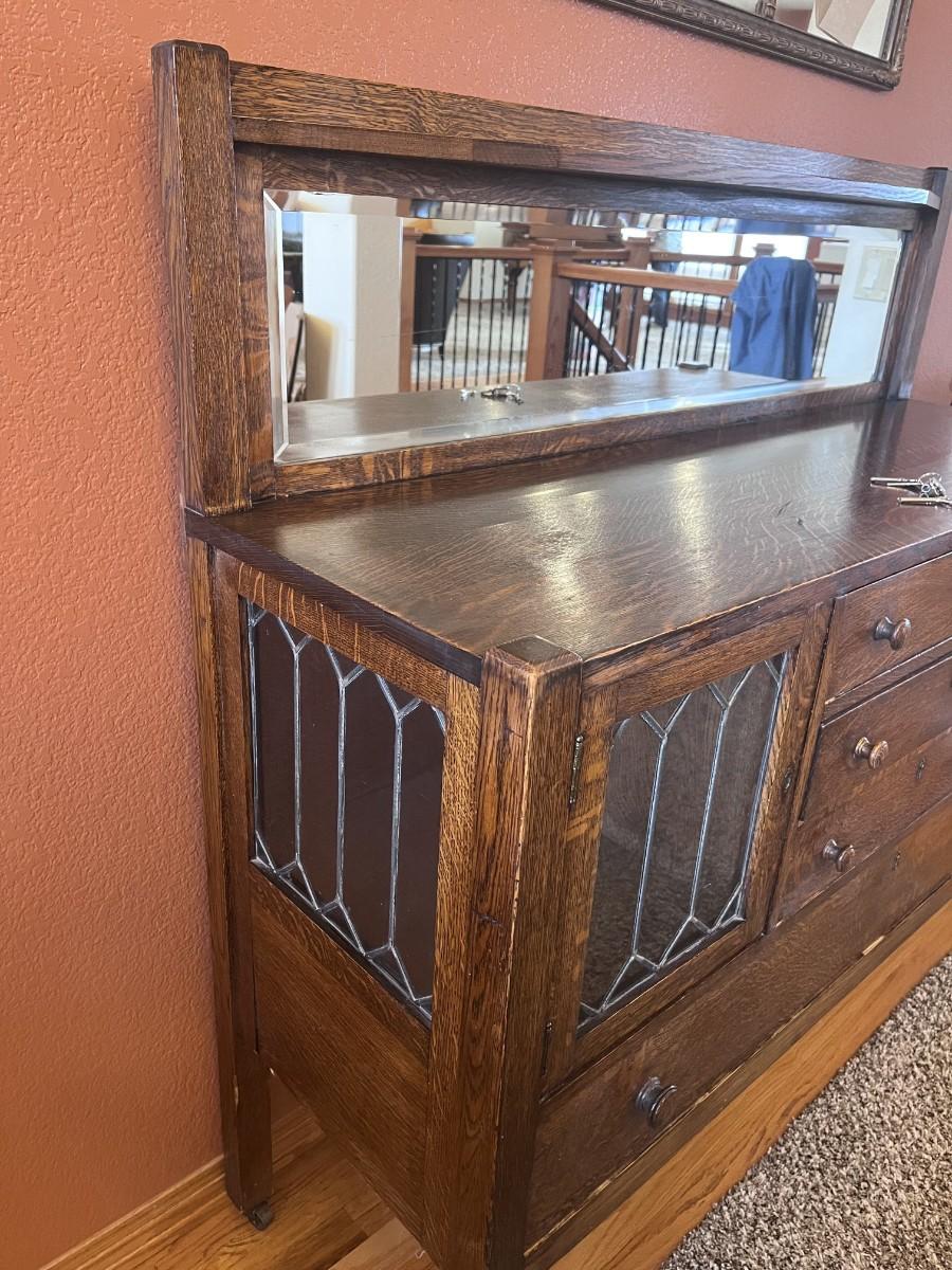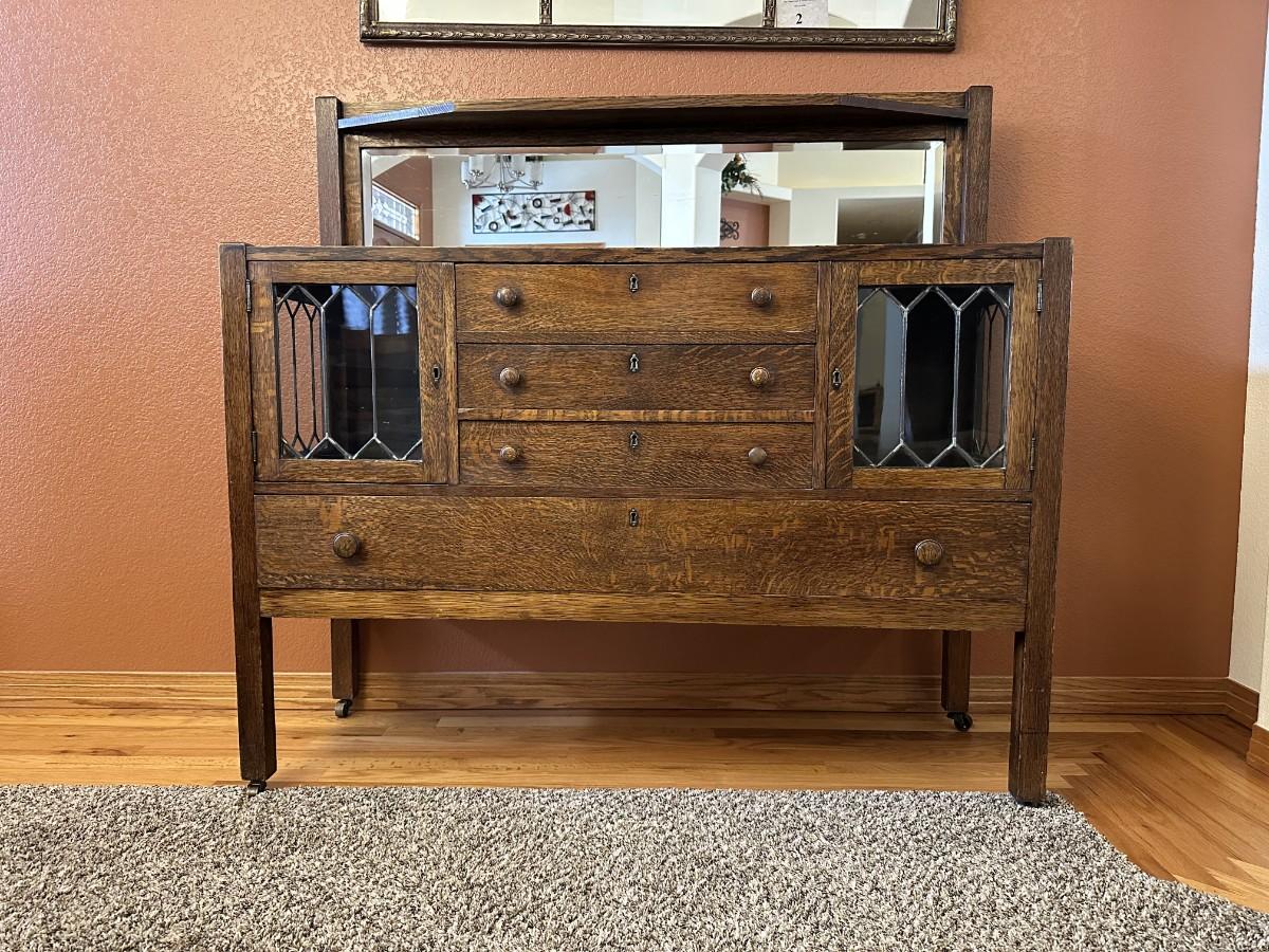 GORGEOUS ANTIQUE TIGER OAK, QUARTER-SAWN, MIRRORED BACK SIDEBOARD OR BUFFET WITH LEADED GLASS DOORS