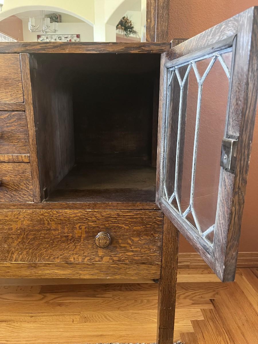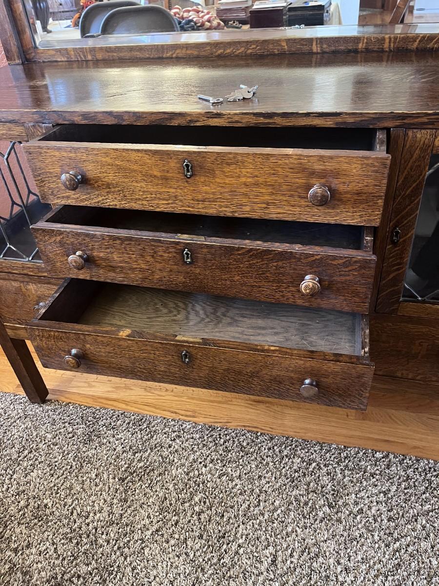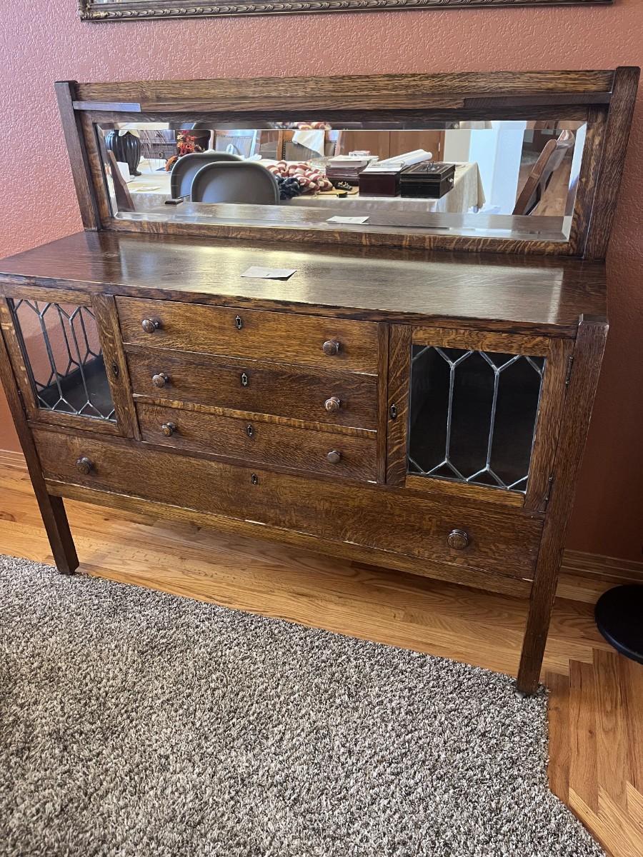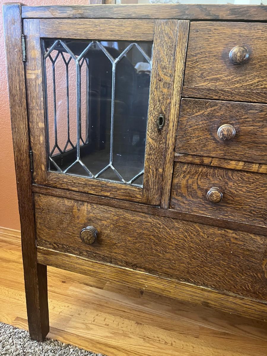 GORGEOUS ANTIQUE TIGER OAK, QUARTER-SAWN, MIRRORED BACK SIDEBOARD OR BUFFET WITH LEADED GLASS DOORS