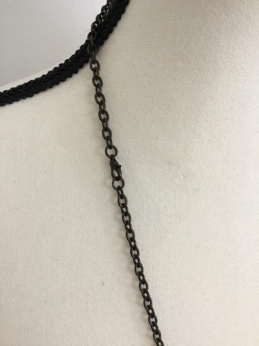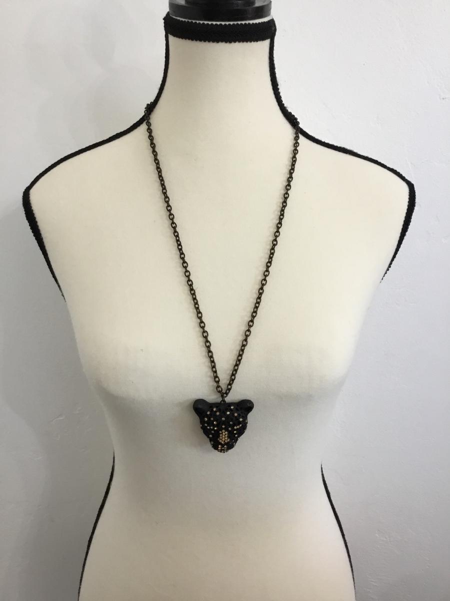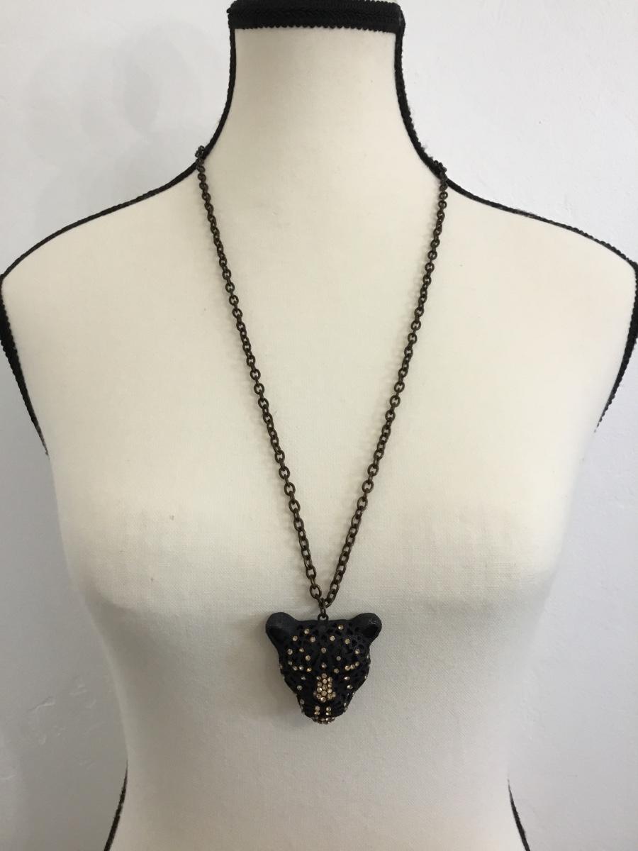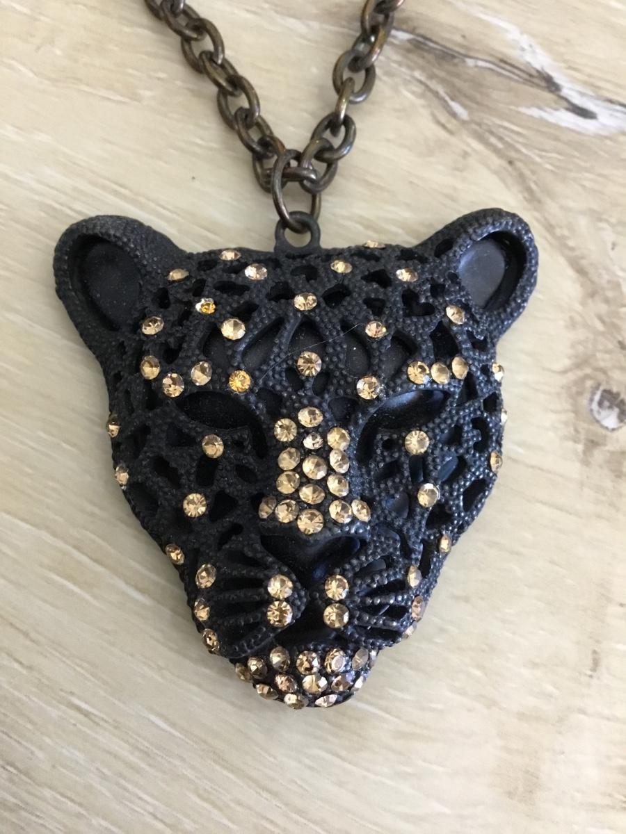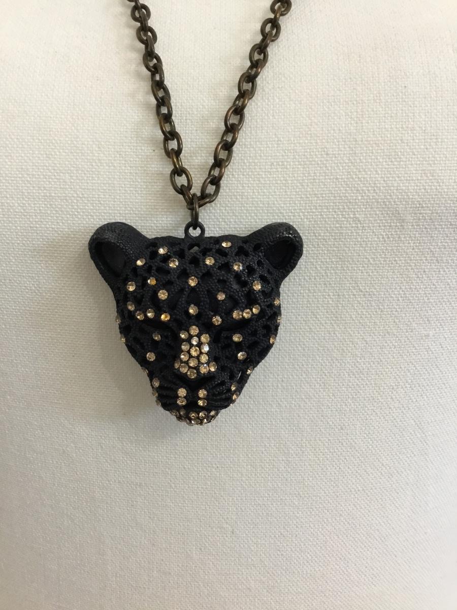 Gorgeous, antique, toned chain necklace, black panther, head, rhinestone covered pendant