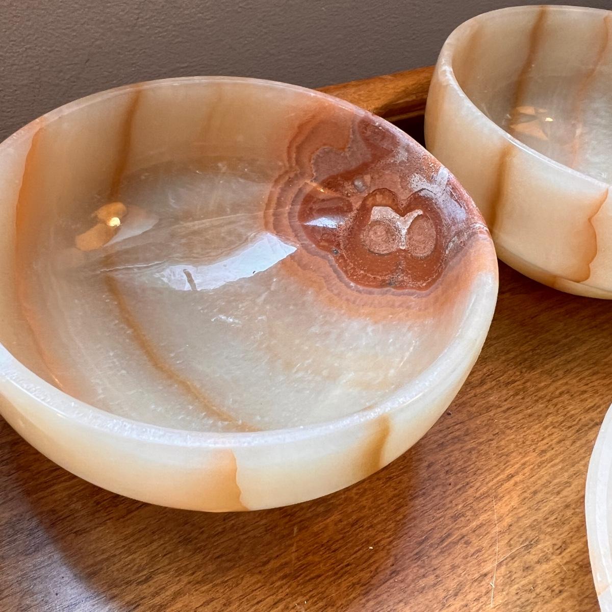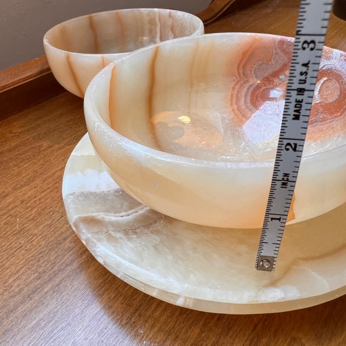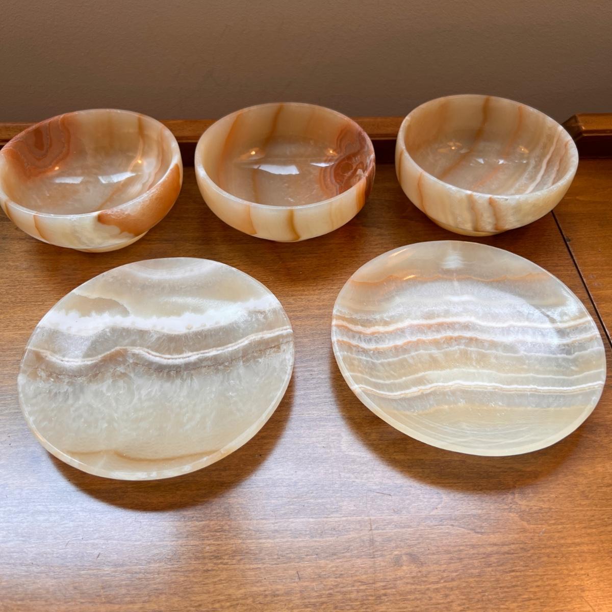 These are amazing! Carved Alabaster stone. 3 bowls 2 plates. Excellent condition!