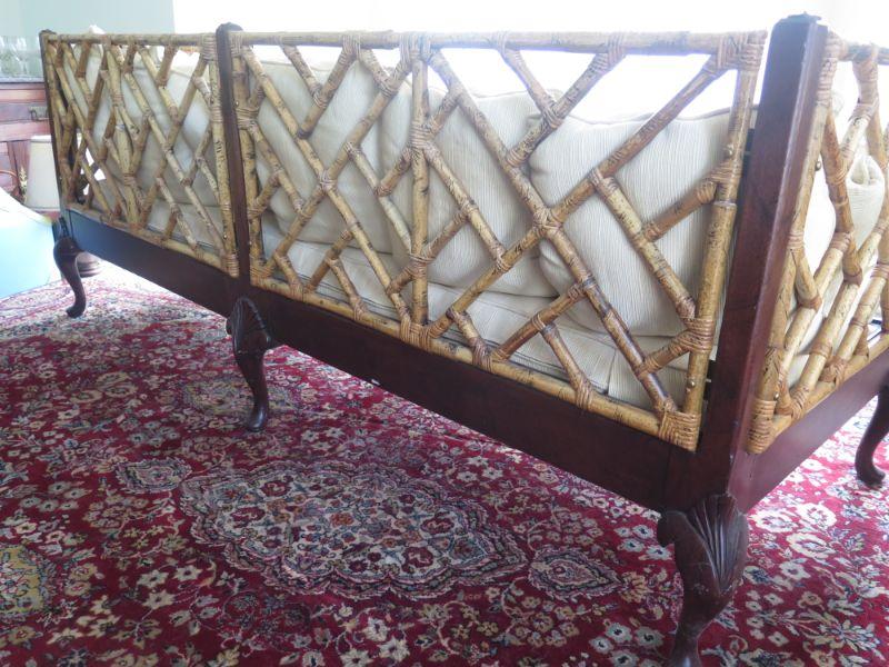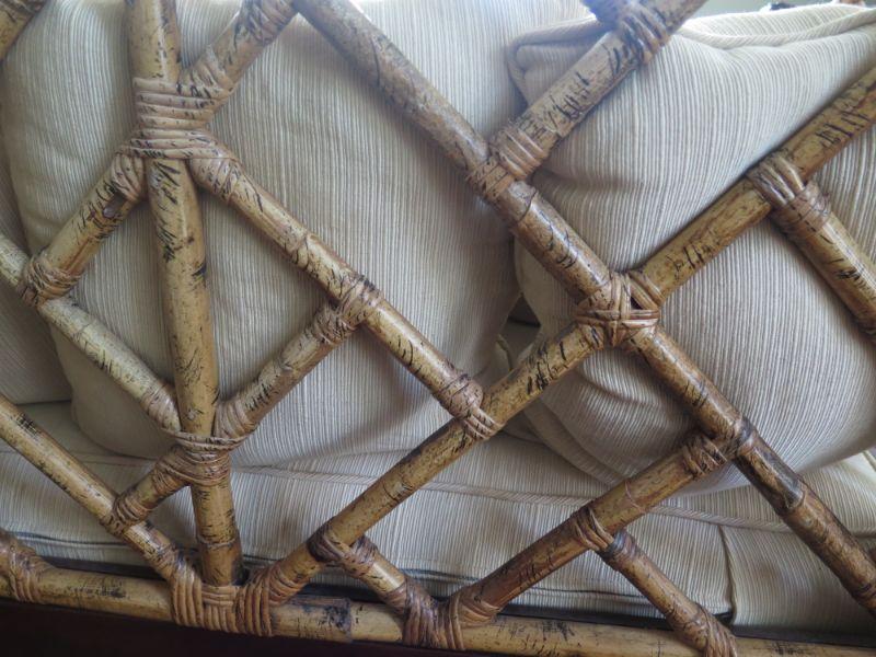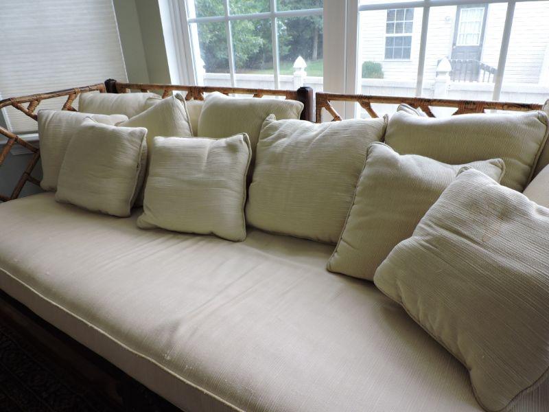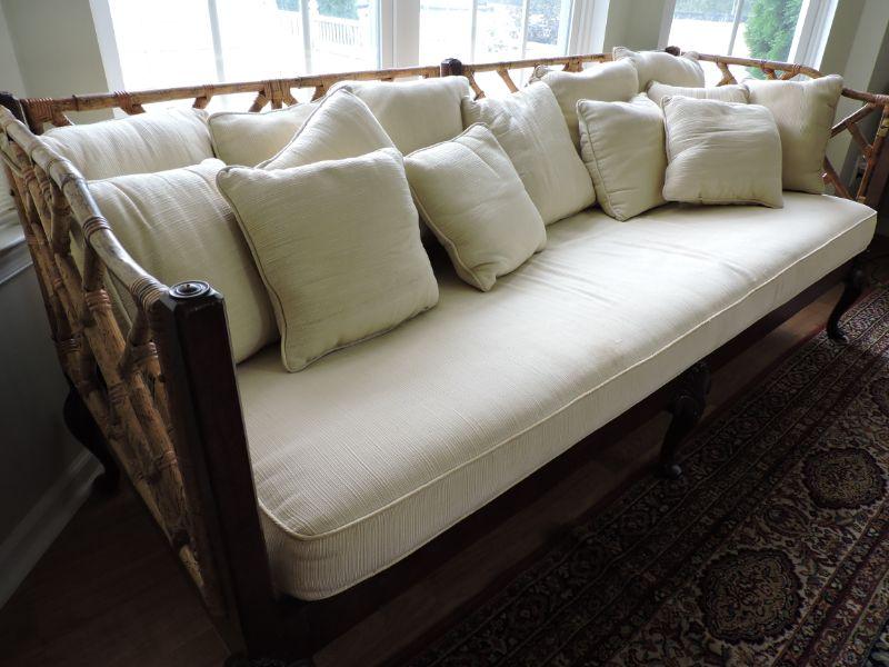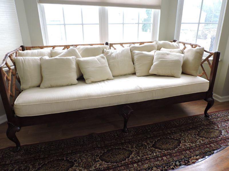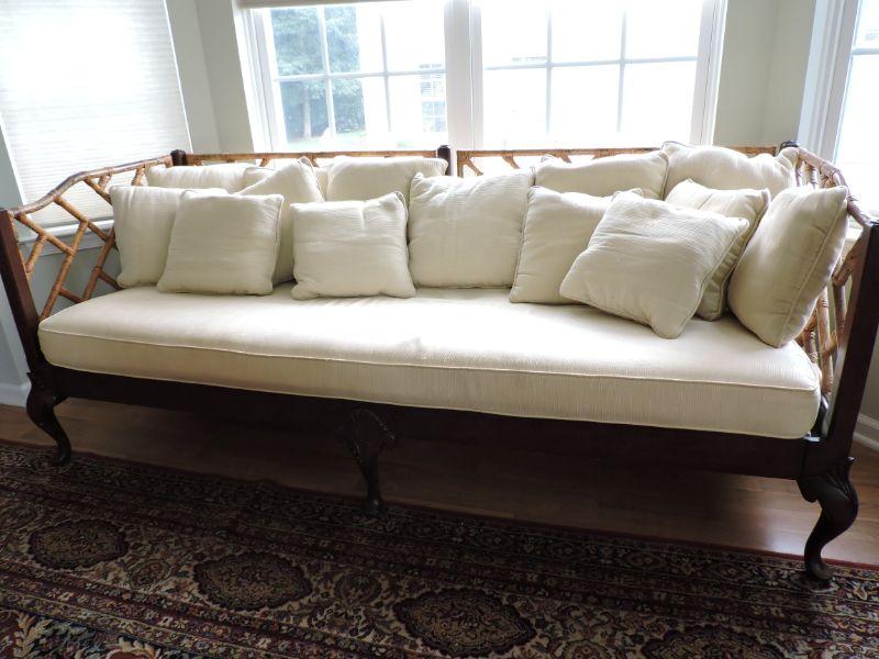 Stunning bamboo and wood day lounger with pillows. 82x36x32 **Please read Terms and Conditions before placing a bid. Pick up is Sunday, September 1, 2019 from 10am to 4pm in Williamstown. All sales are final. All sales are as is, where is. Please review all photos. Any props included in photos are not included in listing. All measurements are approximate. Comes from home with cats.