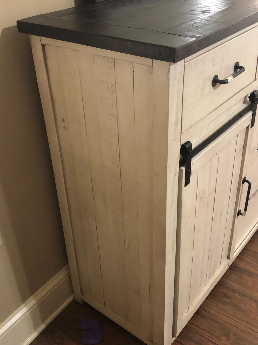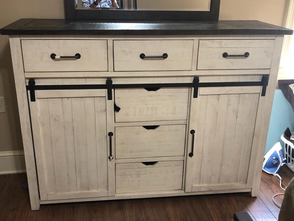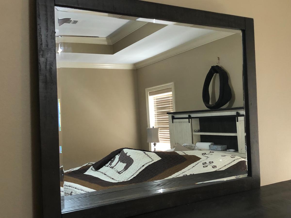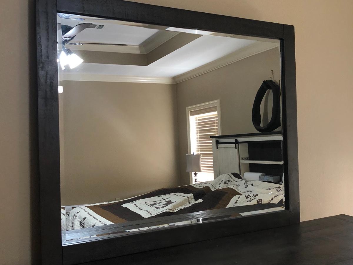 This bedroom set is beautiful. This dresser features 6 drawers and two barn doors. This dresser also has a gorgeous rustic mirror. The dresser measures 19 x 45 x 62