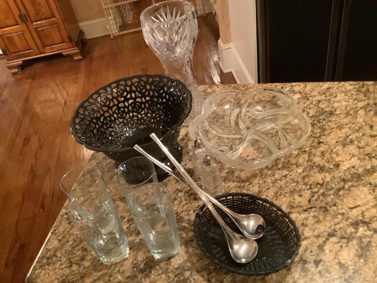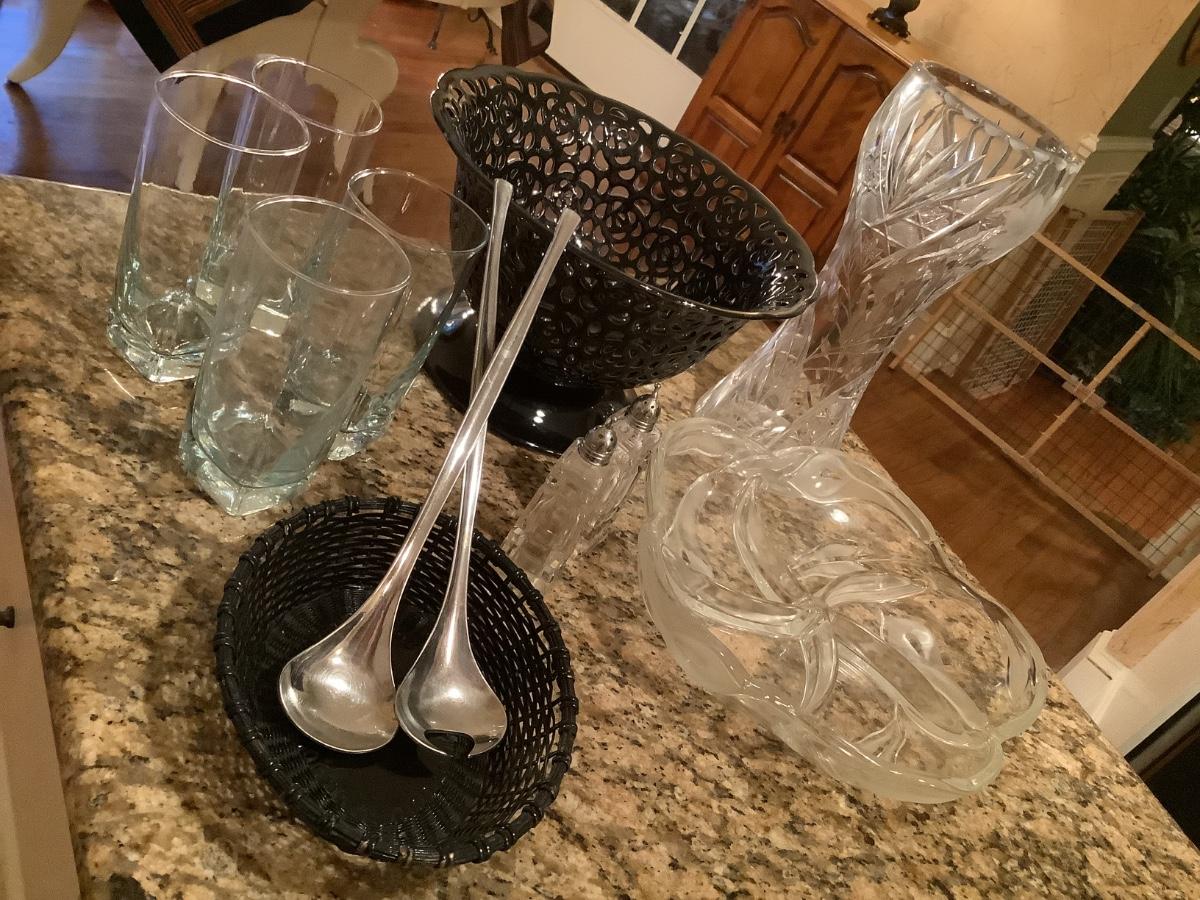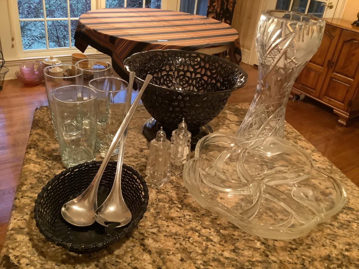 Gorgeous ceramic decor bowl in black, large glass vase, glass S&P, glass divided entertaining bowl, ladles, etc.