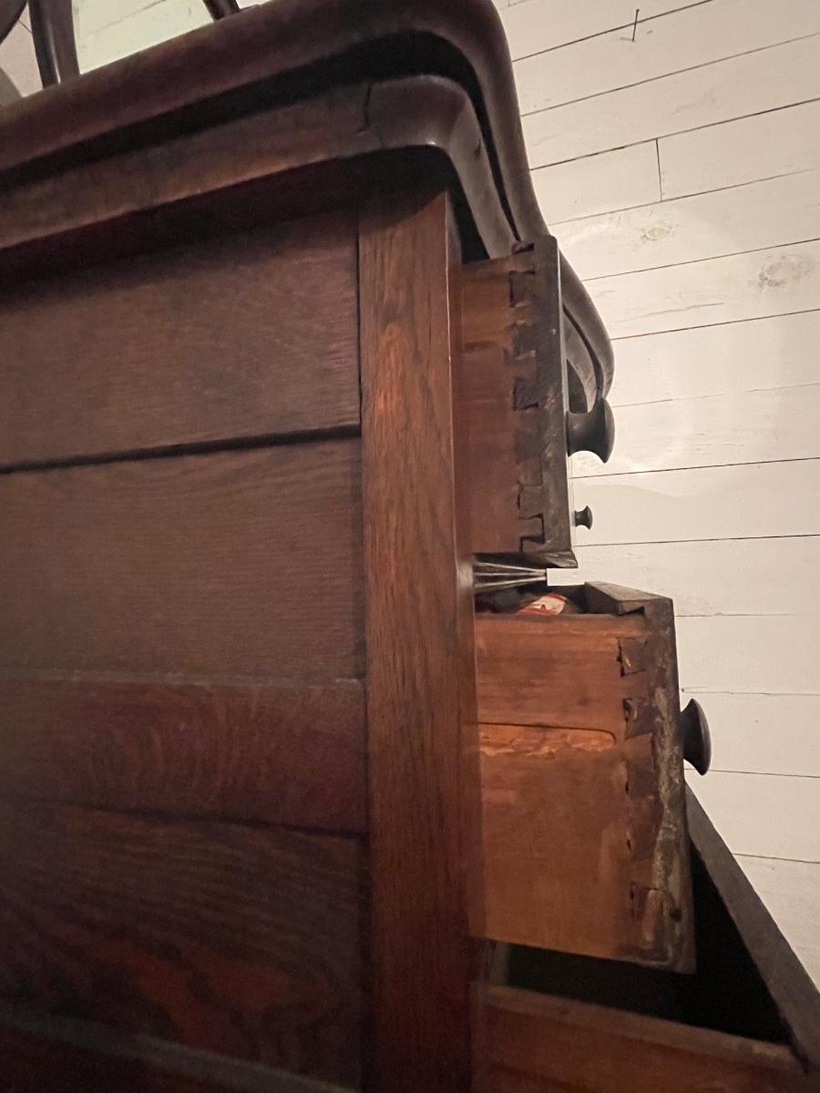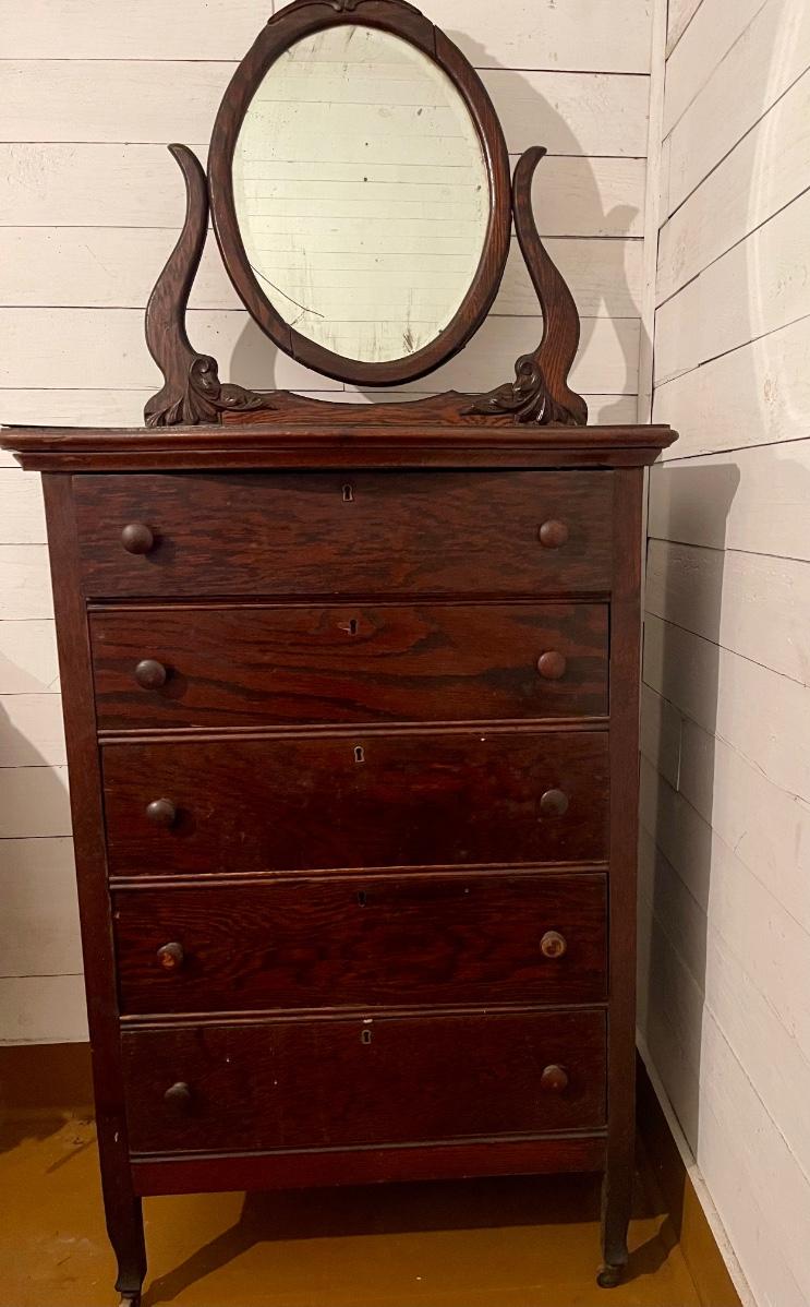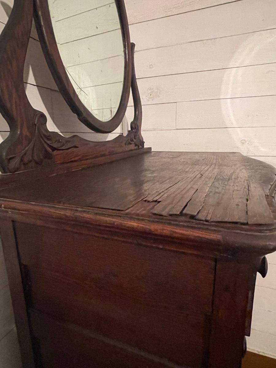 This antique chest of drawers is beautiful. The top has separated a bit as shown. 49” tall, 32”wide, 18”deep. Drawers show signs of use and age, but it’s still amazing. Put a little work into it or simply use as is. What a farmhouse statement piece for bedroom or use as linen storage. Many uses for such a wonderful piece! All antique furniture from this home shows signs of use and age. Many wonderful pieces from this old home!