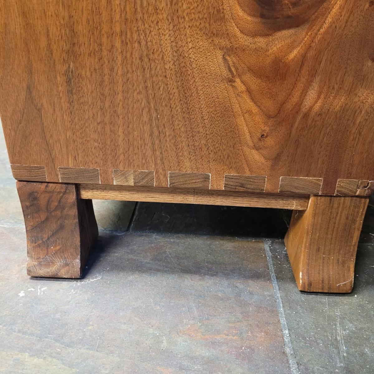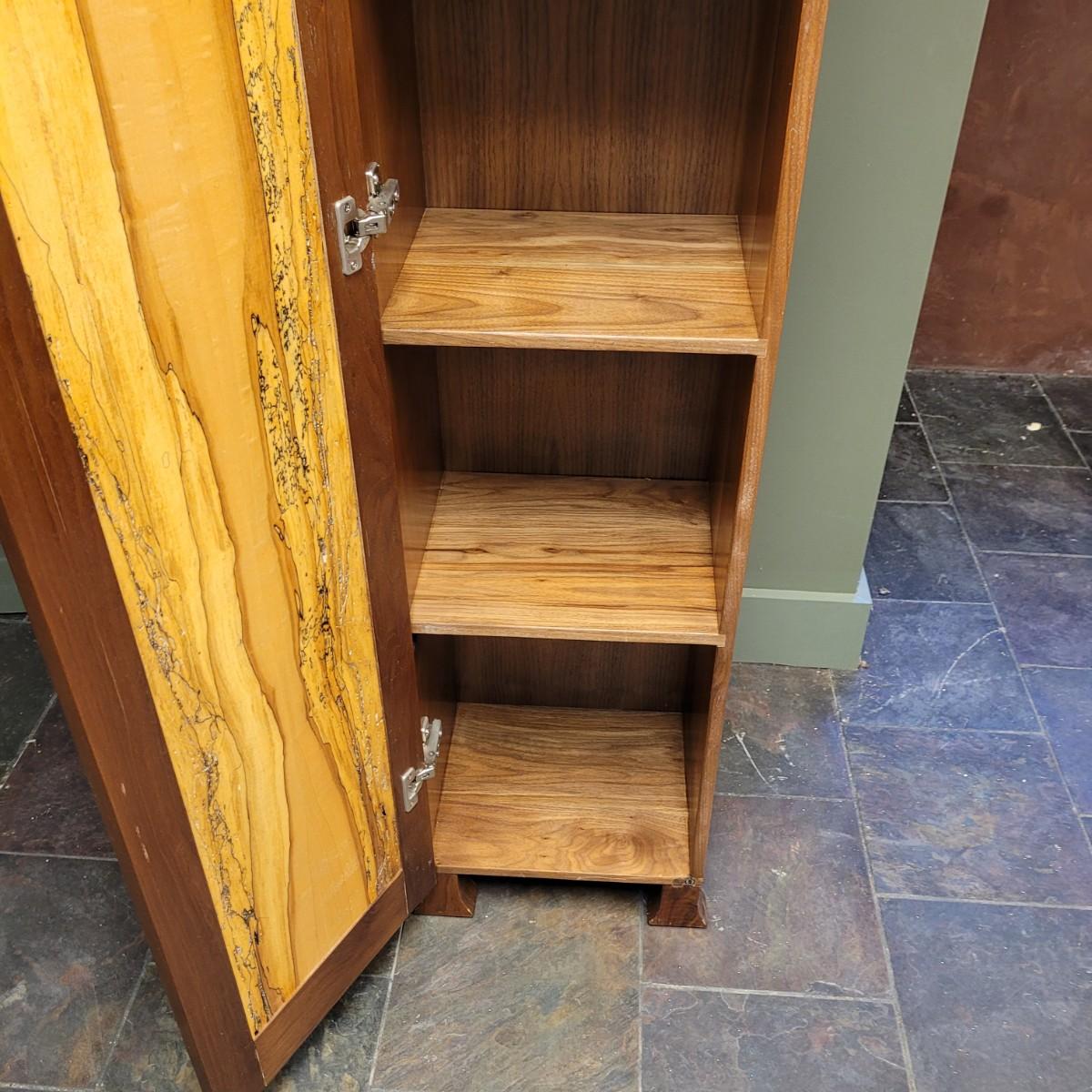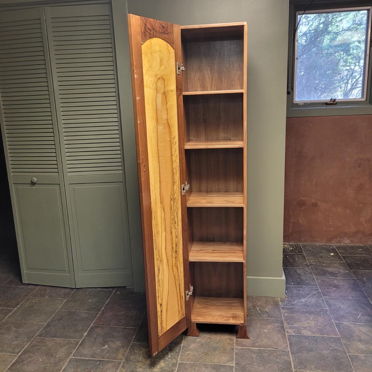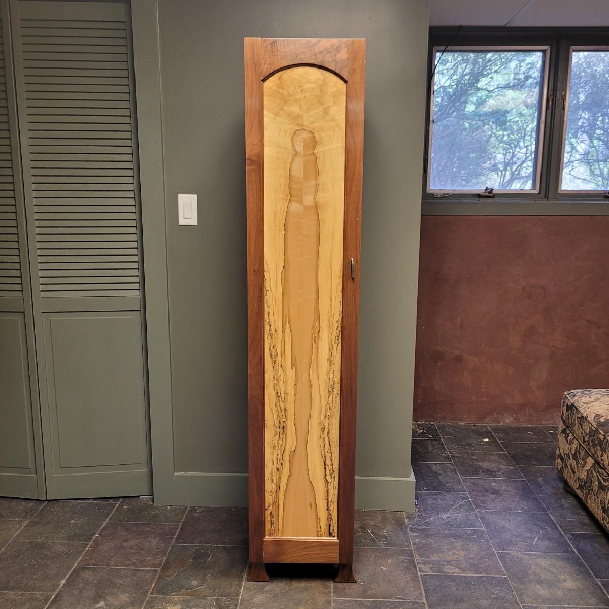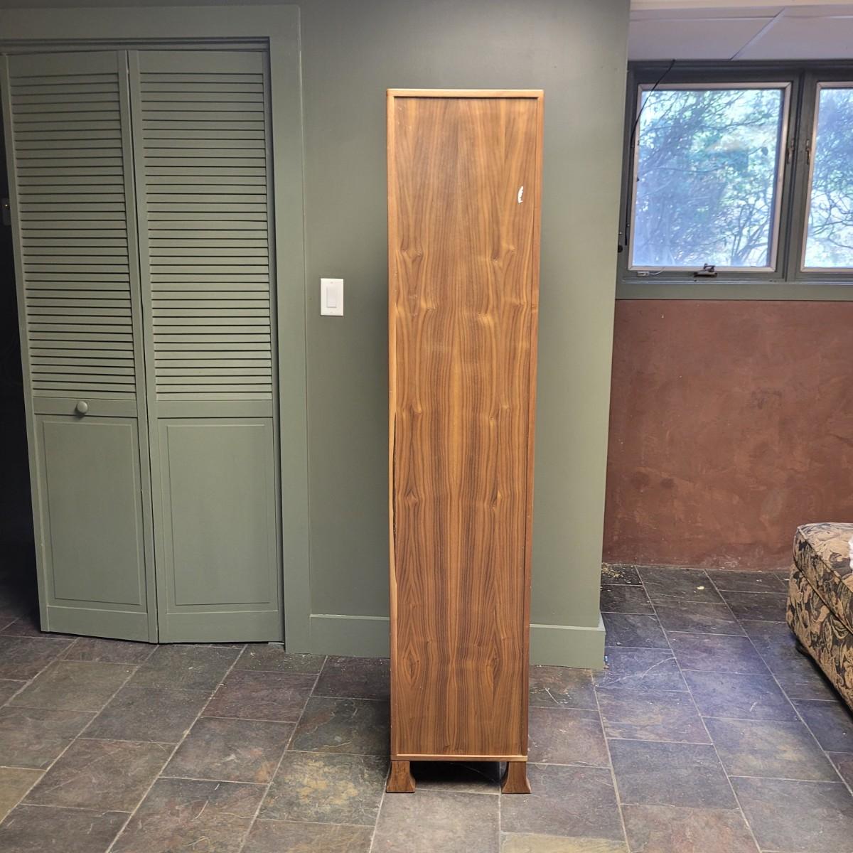 This beautiful custom-made tall, narrow hardwood cabinet with dovetail joints makes this a true work of art. Hinges are tightly affixed. Small scuffs and scratches throughout (see photos). Cabinet is slightly wobbly but seems to be easily repaired. Measures approximately 14" x 12.5" x 69"H. Local pick up only. Size is awkward, bring help if needed. Located in basement, stairs are required.