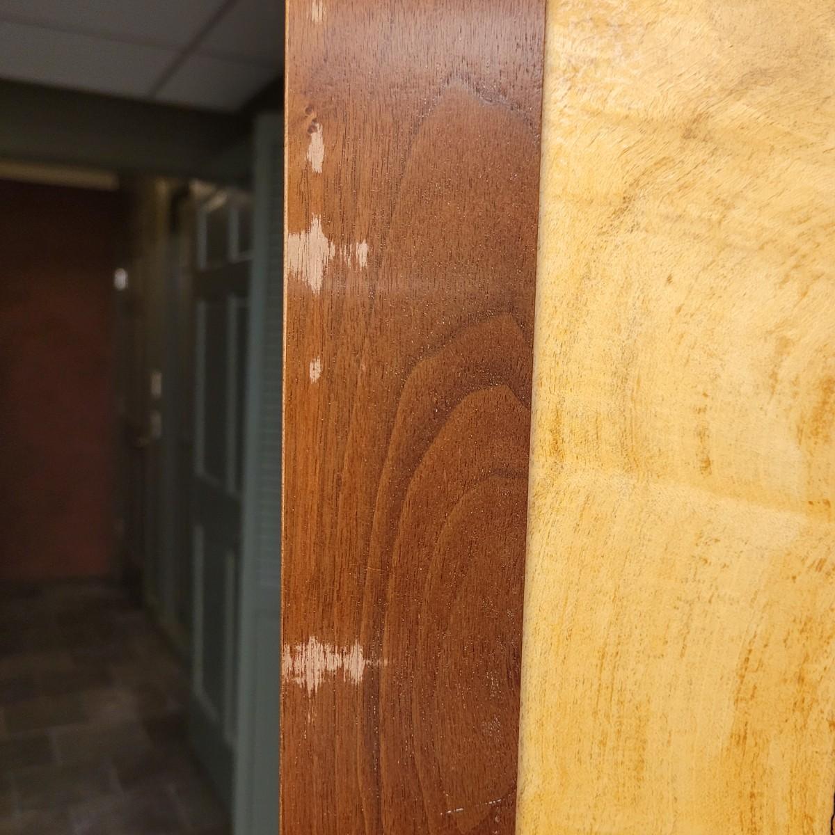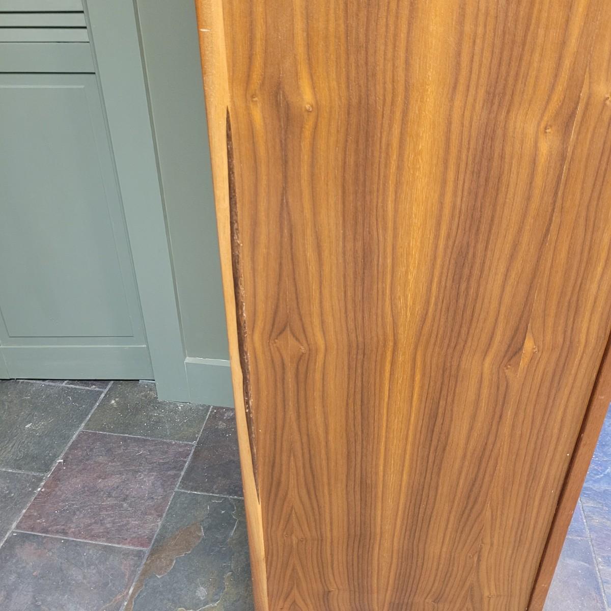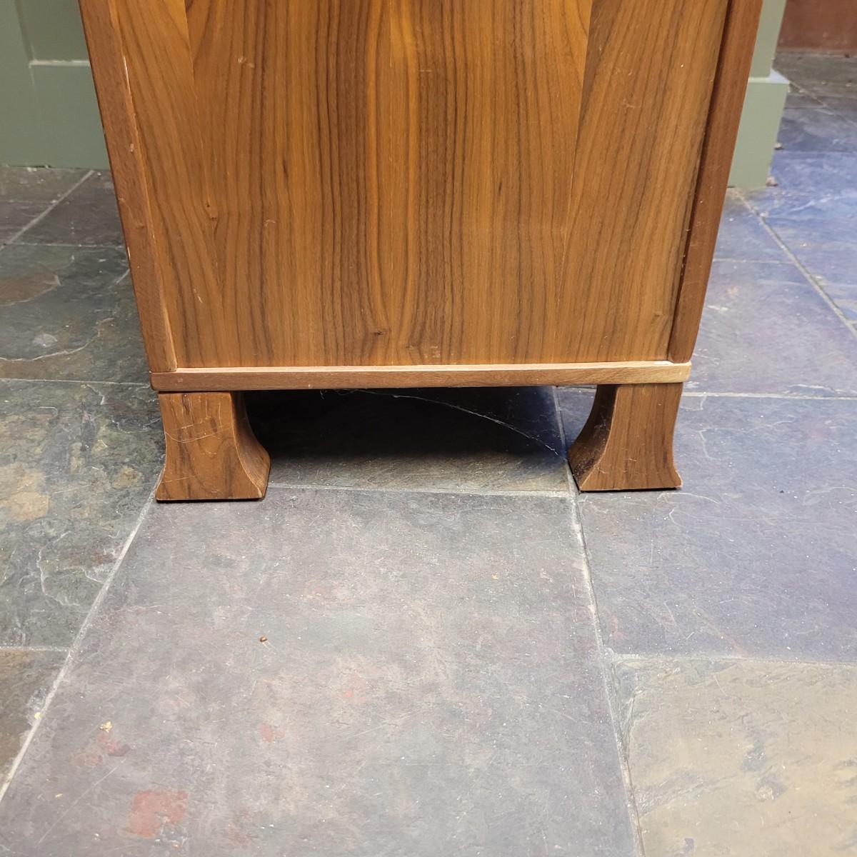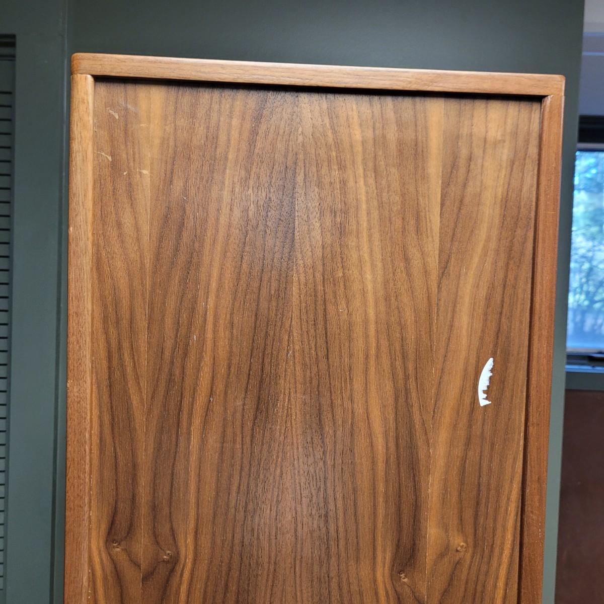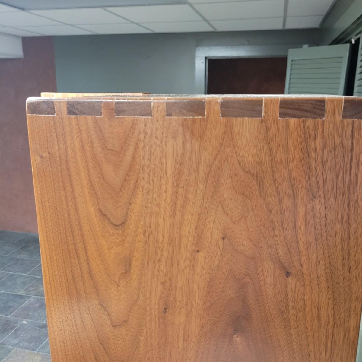 This beautiful custom-made tall, narrow hardwood cabinet with dovetail joints makes this a true work of art. Hinges are tightly affixed. Small scuffs and scratches throughout (see photos). Cabinet is slightly wobbly but seems to be easily repaired. Measures approximately 14" x 12.5" x 69"H. Local pick up only. Size is awkward, bring help if needed. Located in basement, stairs are required.