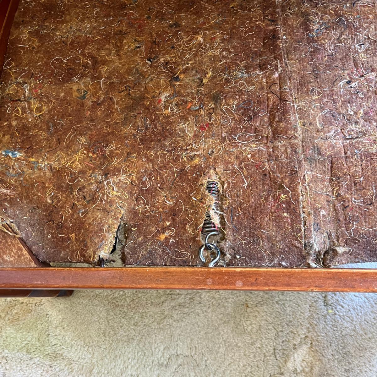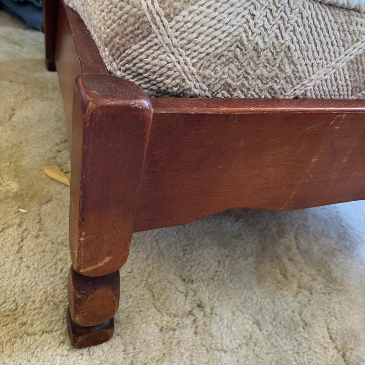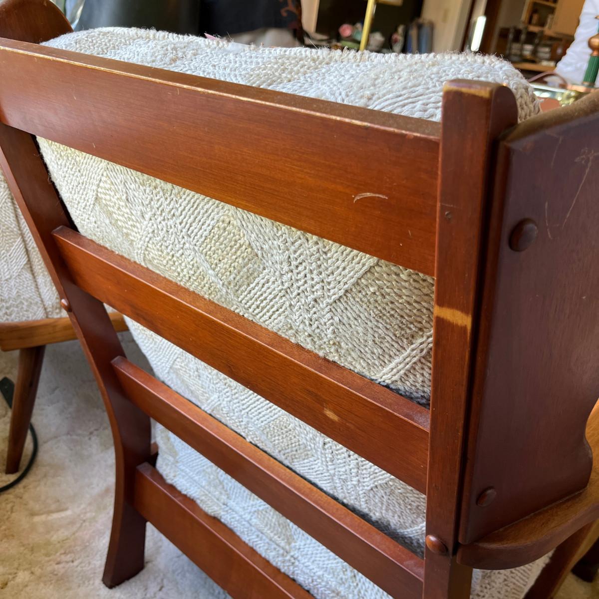 Chair has been reupholstered! Wood finish has a bit of wear.