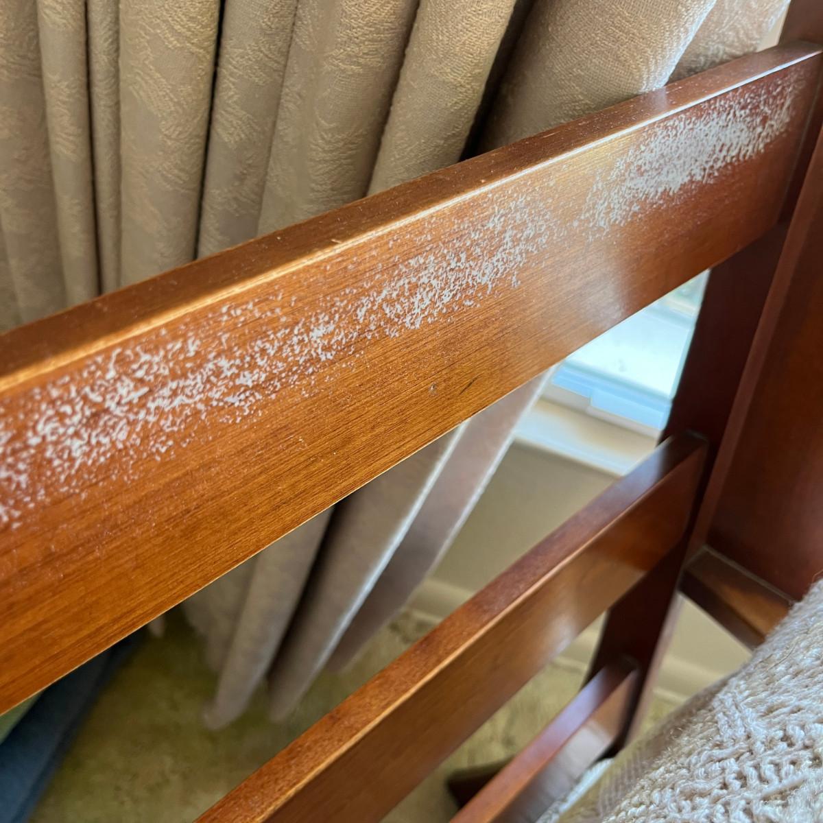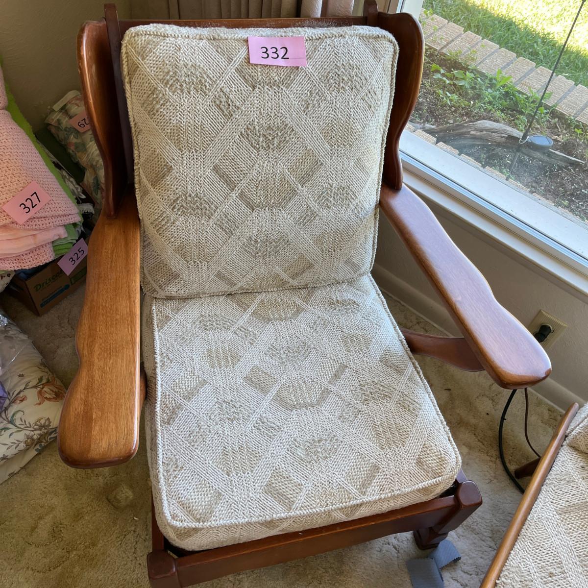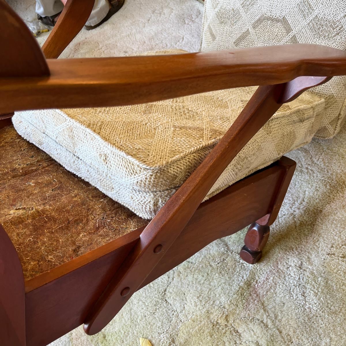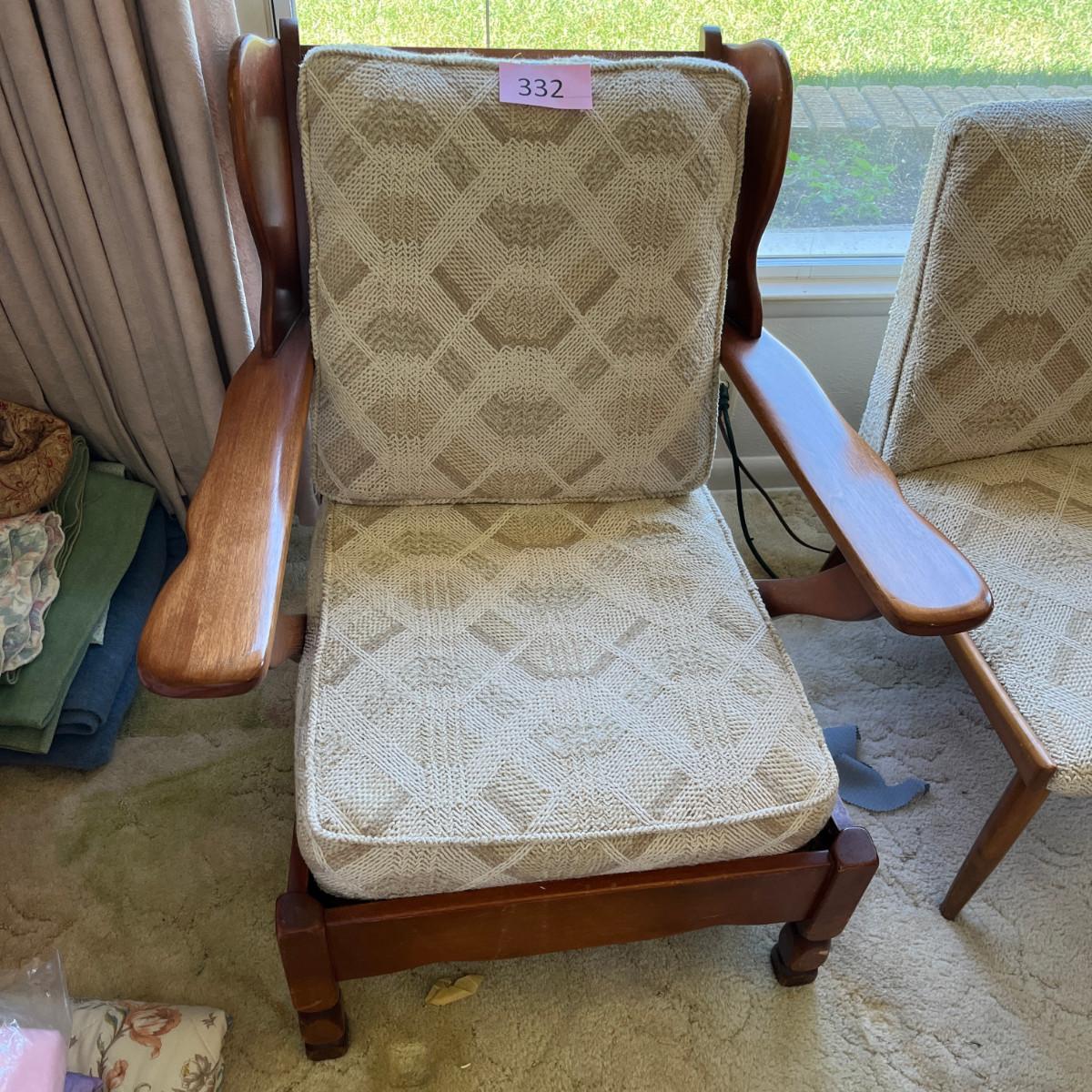 Chair has been reupholstered! Wood finish has a bit of wear.