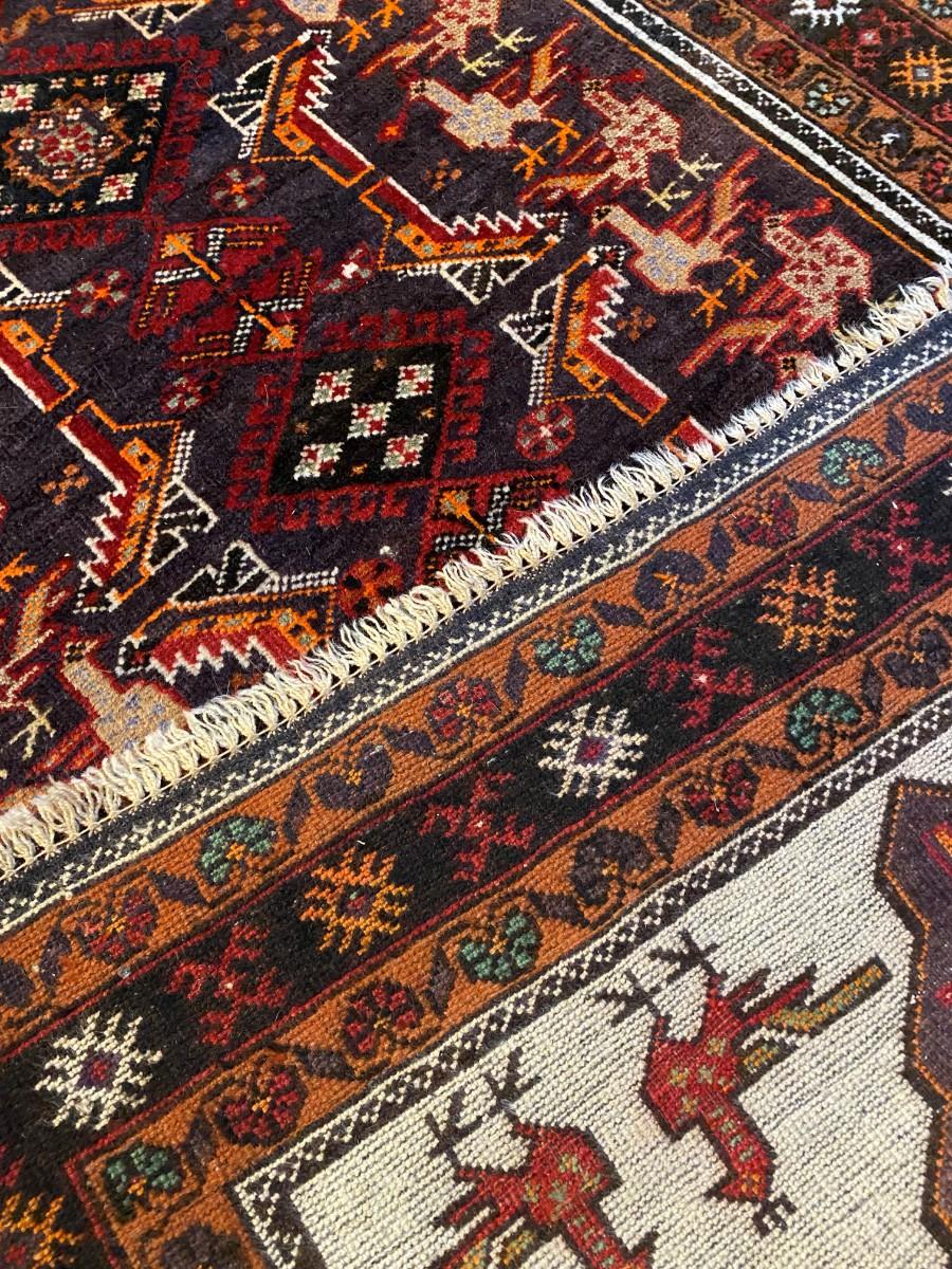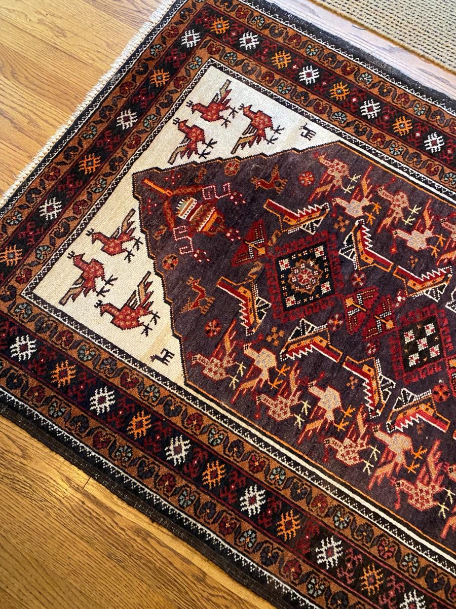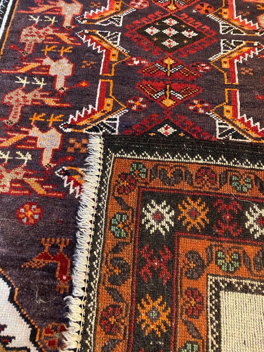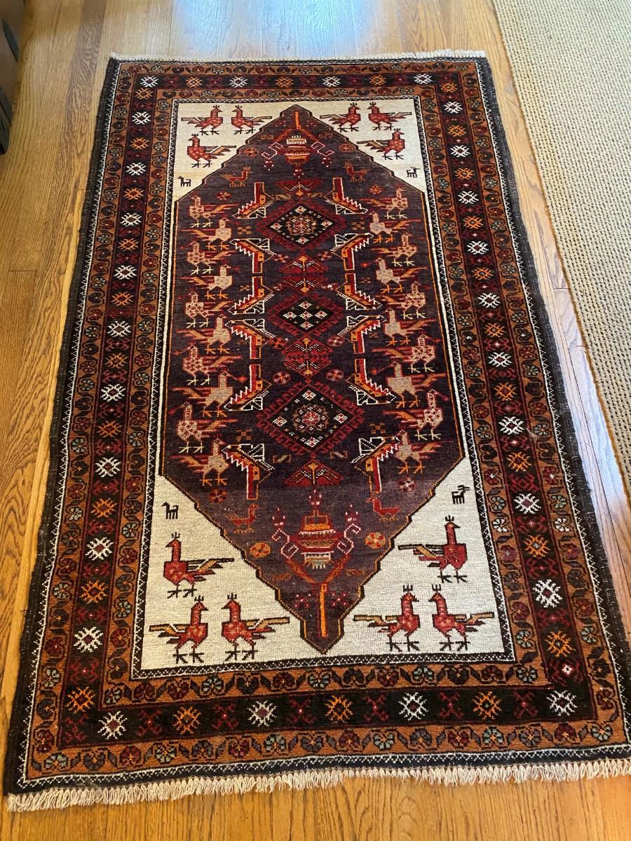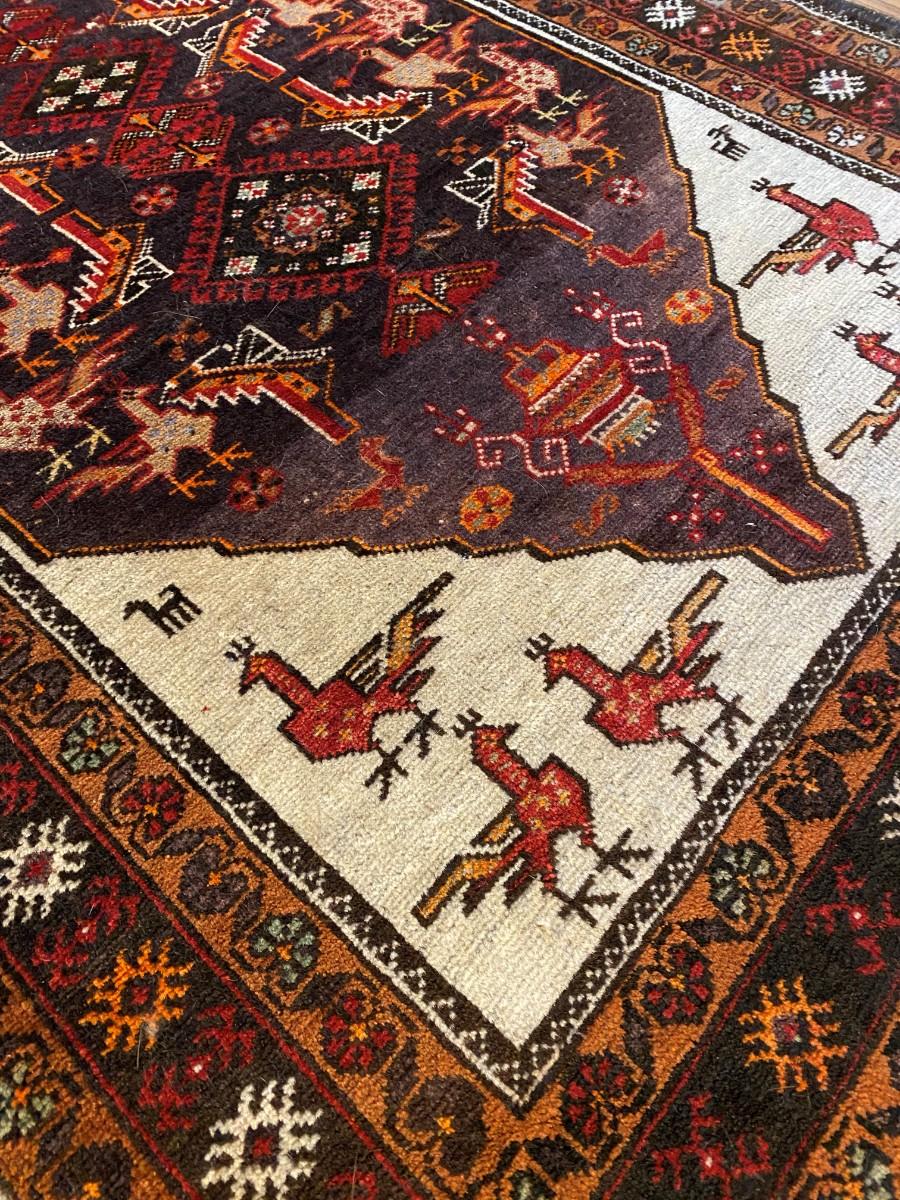 Gorgeous Deep Red Burgandy Black and White Runner Rug with Bird Detailed Pattern. In good condition, with some fading (show in photos).