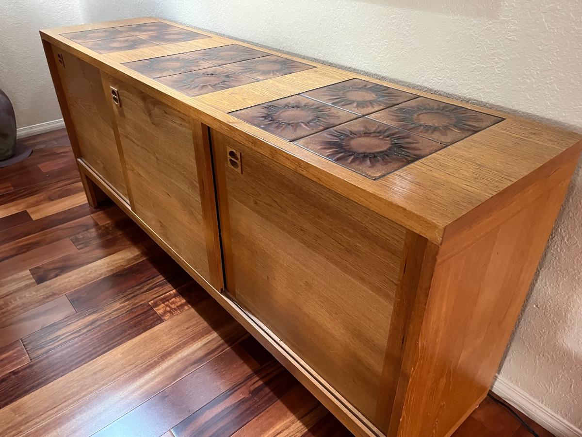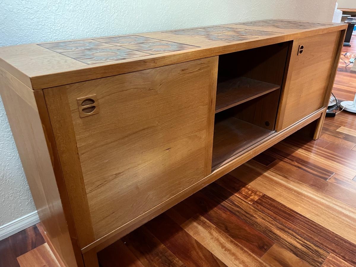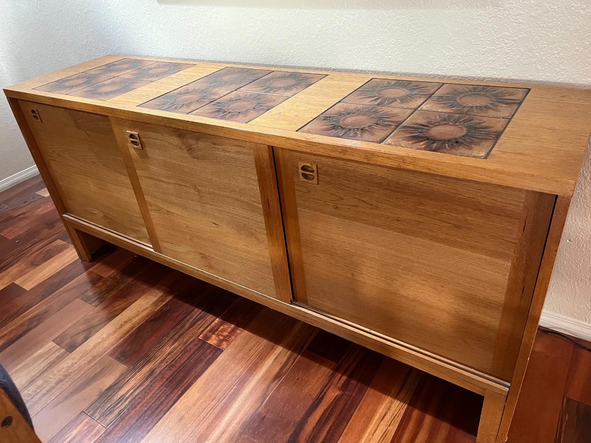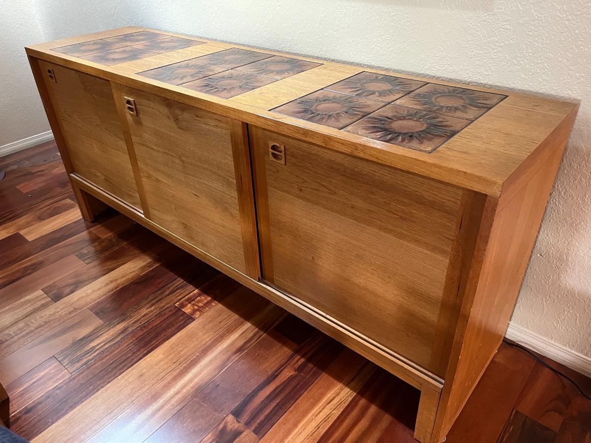 Gorgeous Denmark Wooden Credenza. Very beautiful - has 12 engraved sun symbols on tiles on top - brand says N.Eilersen, made in Denmark, 71”Lx31”Hx19”D