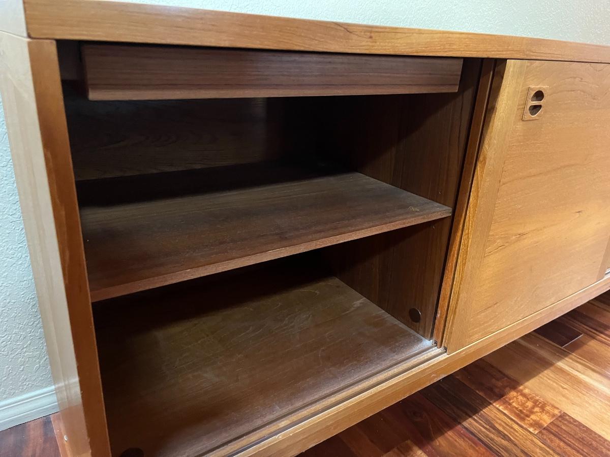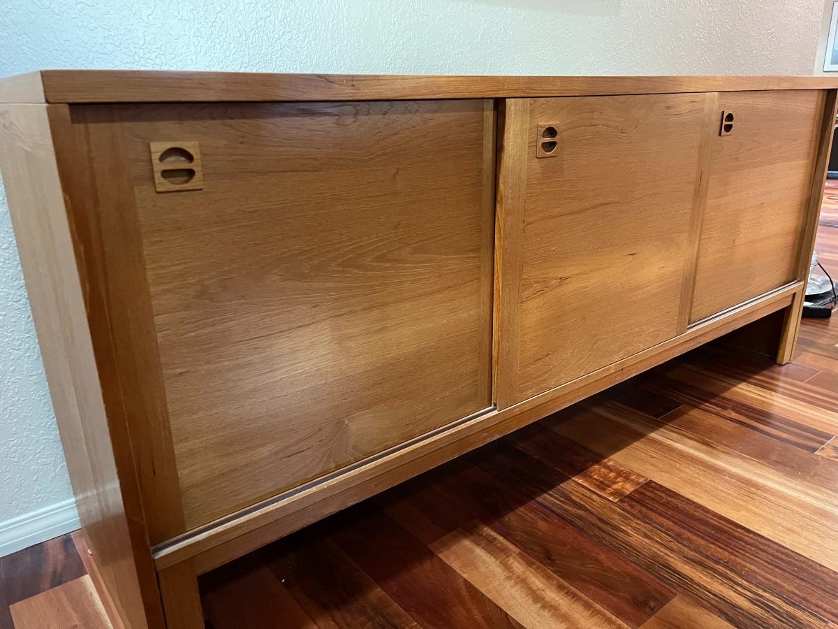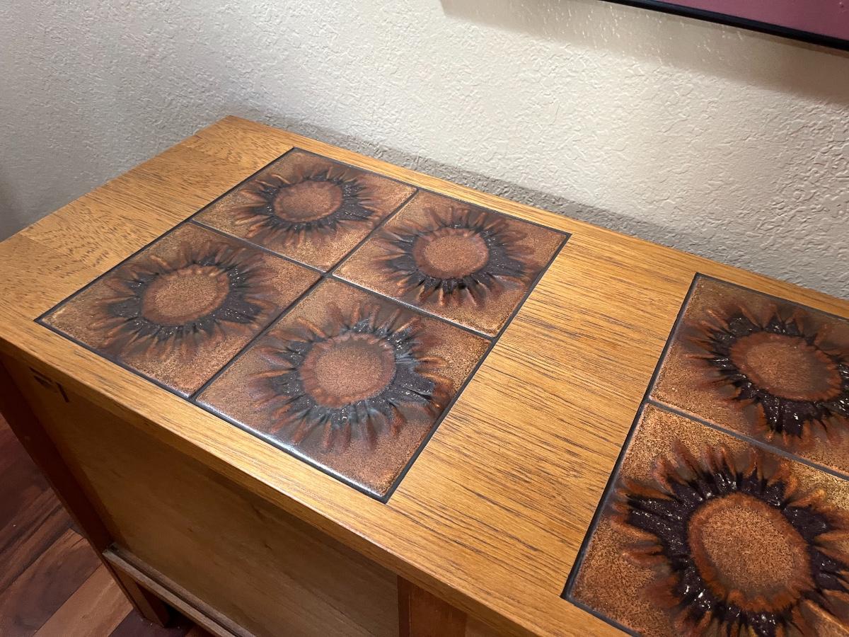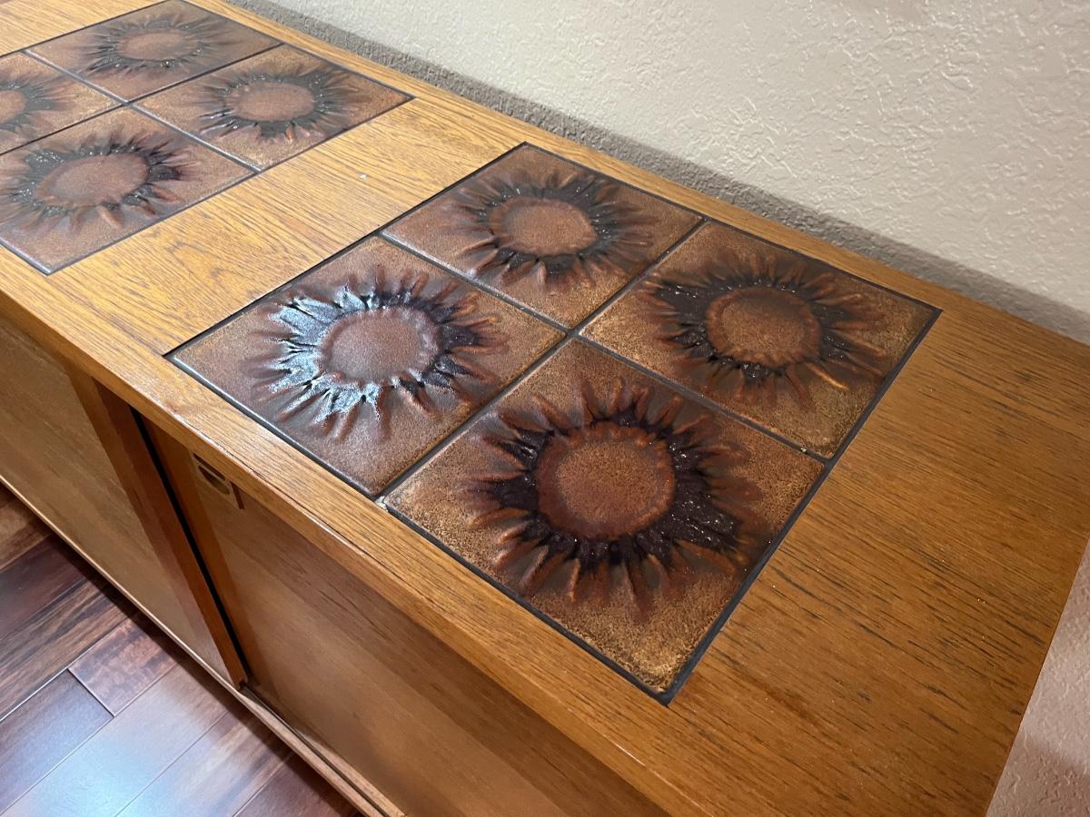 Gorgeous Denmark Wooden Credenza. Very beautiful - has 12 engraved sun symbols on tiles on top - brand says N.Eilersen, made in Denmark, 71”Lx31”Hx19”D