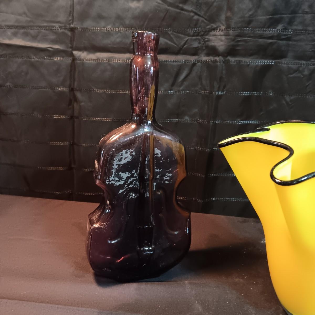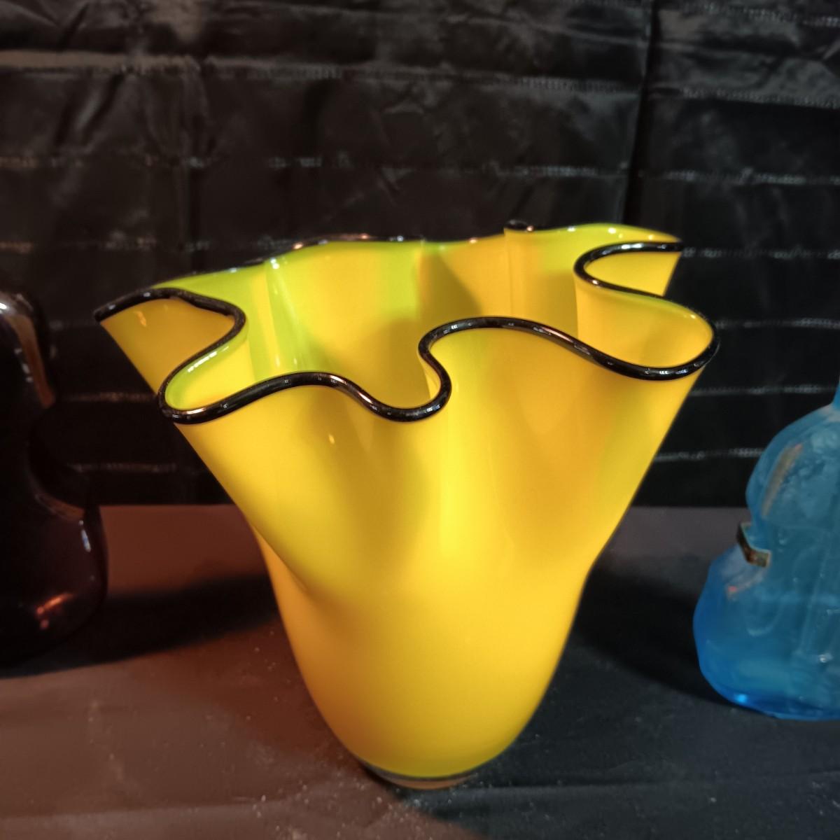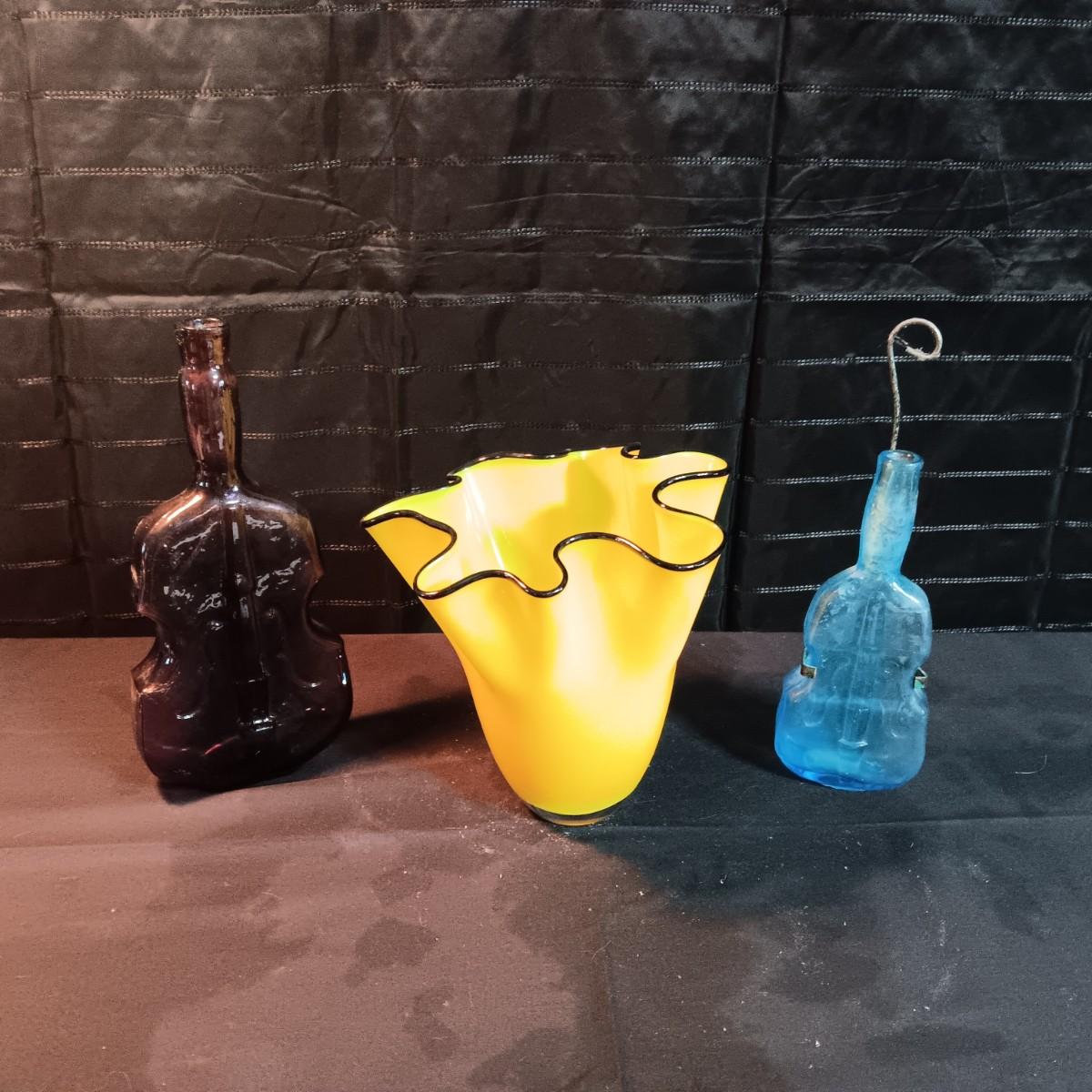 GORGEOUS DESIGNS RUFFLED VASE AND 2 GLASS CELLO SHAPED BOTTLES