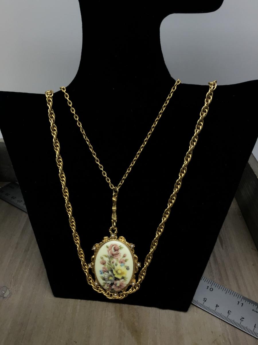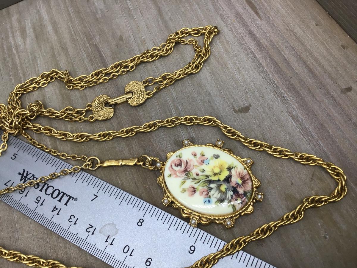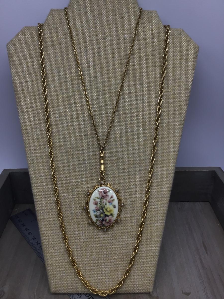Gorgeous Double Strand Necklace With ceramic Floral Pendant Vintage signed Denise