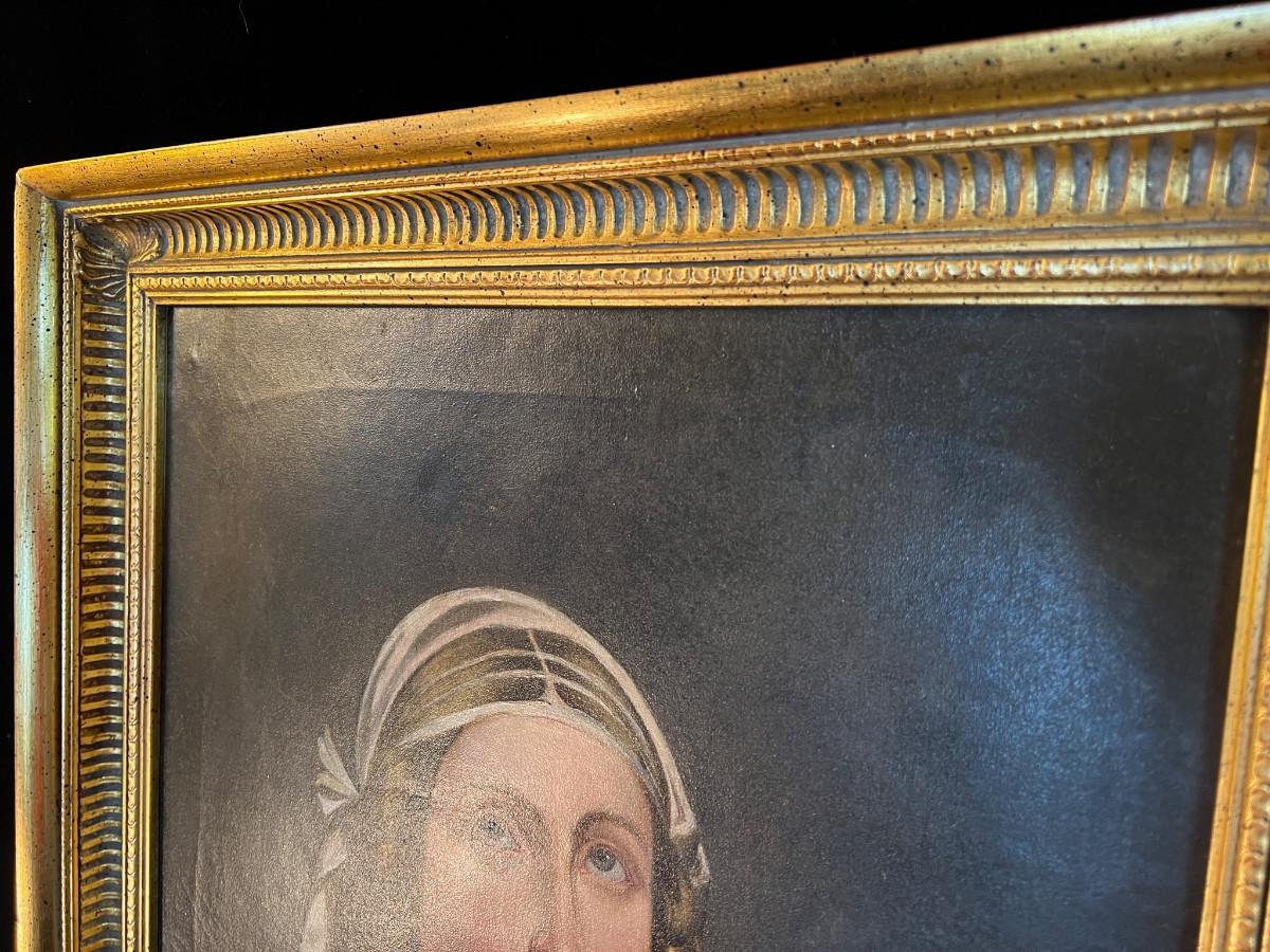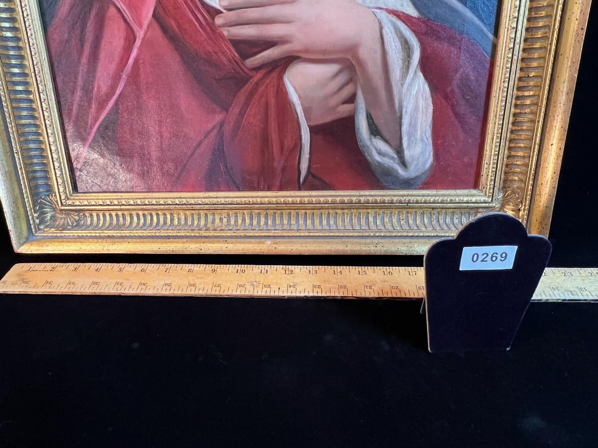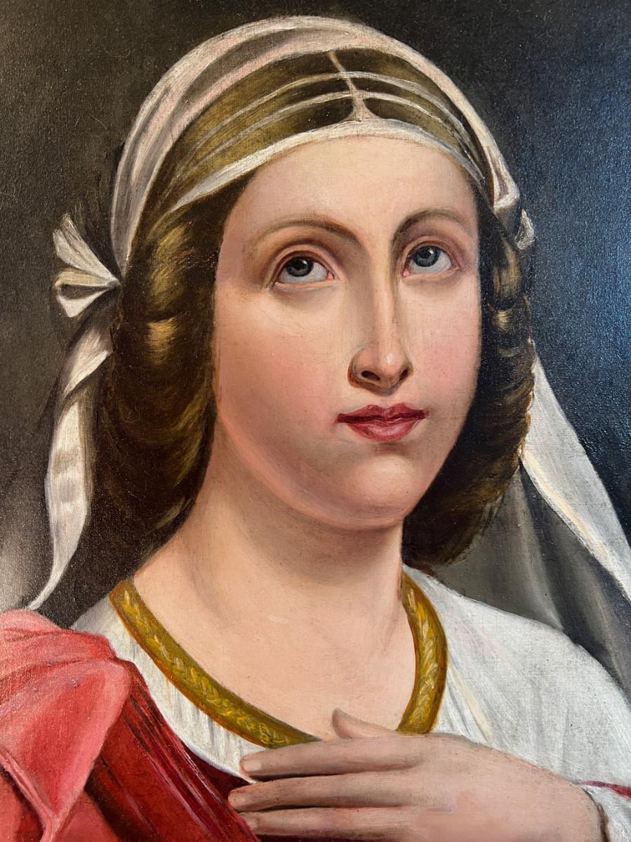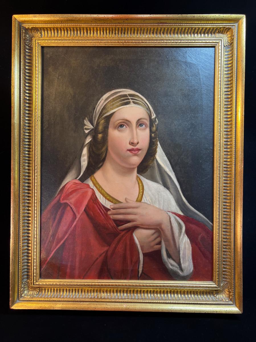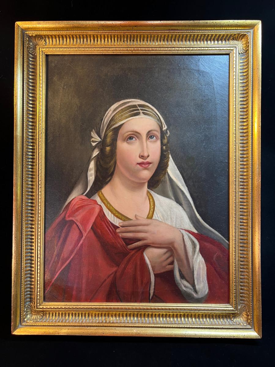DESCRIPTION: The subject item is a classic bust length portrait of a female saint with a heavenward gaze and arms crossed over her heart.