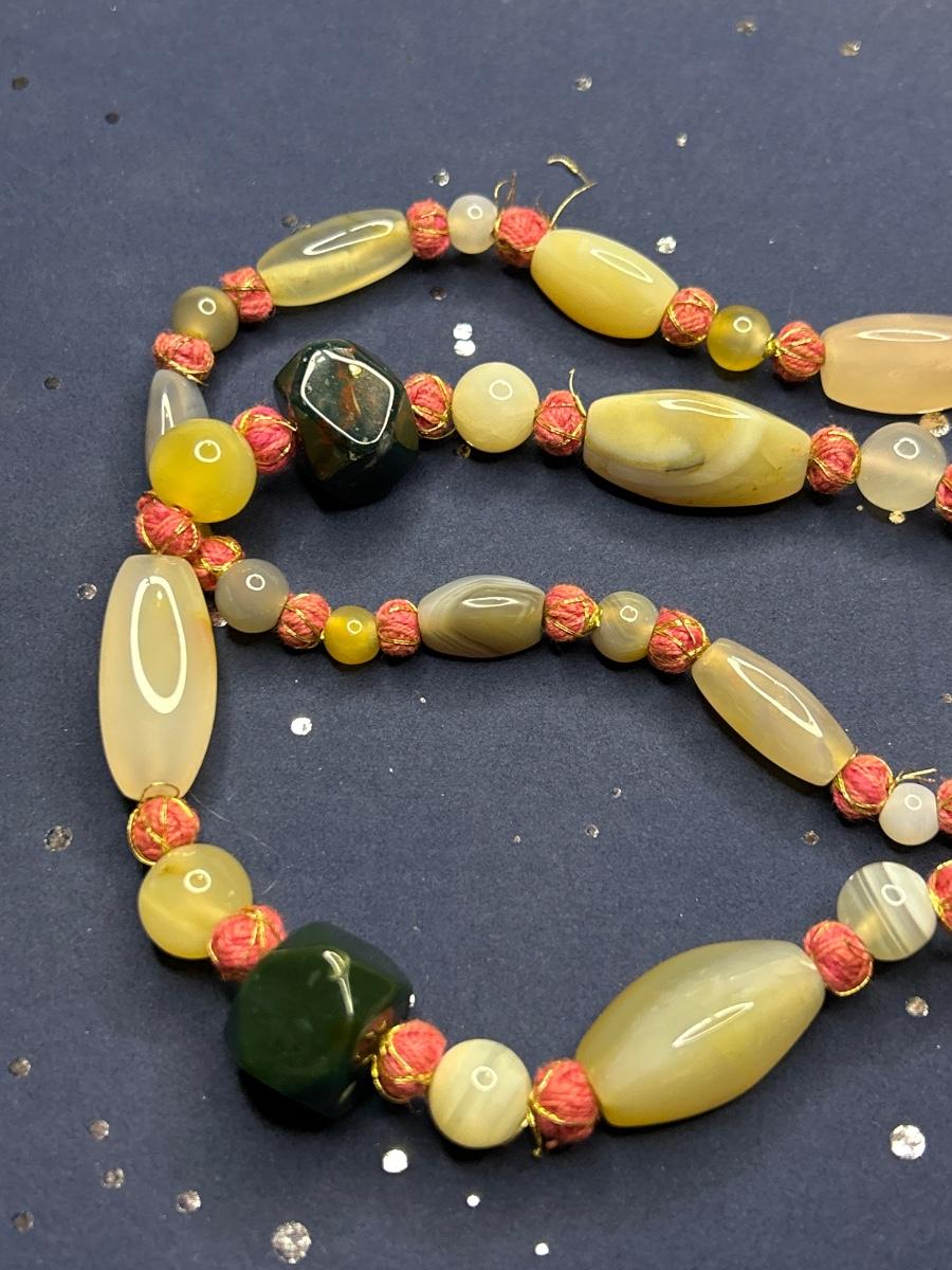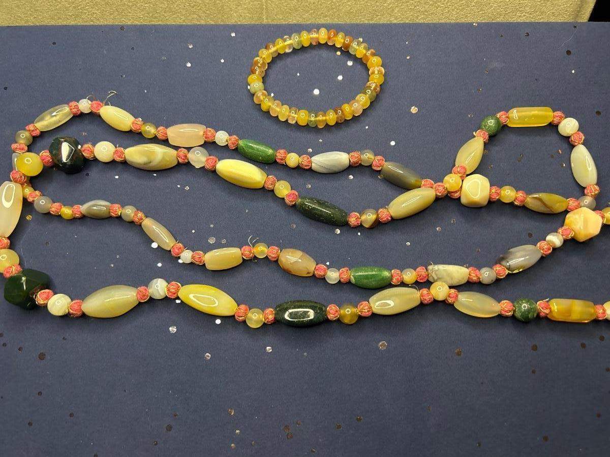 This unbelievable necklace consists of Jasper, Bloodstone, green Chalcedony, Albeite & Agate. The stretch bracelet is Carnelian Agate. It’s hard to see them go but, somebody else needs to enjoy them too!