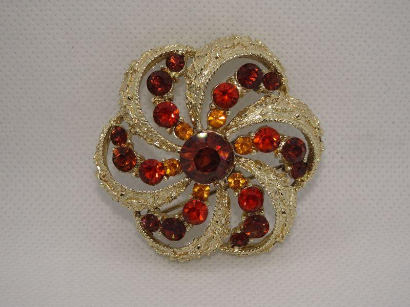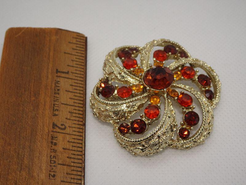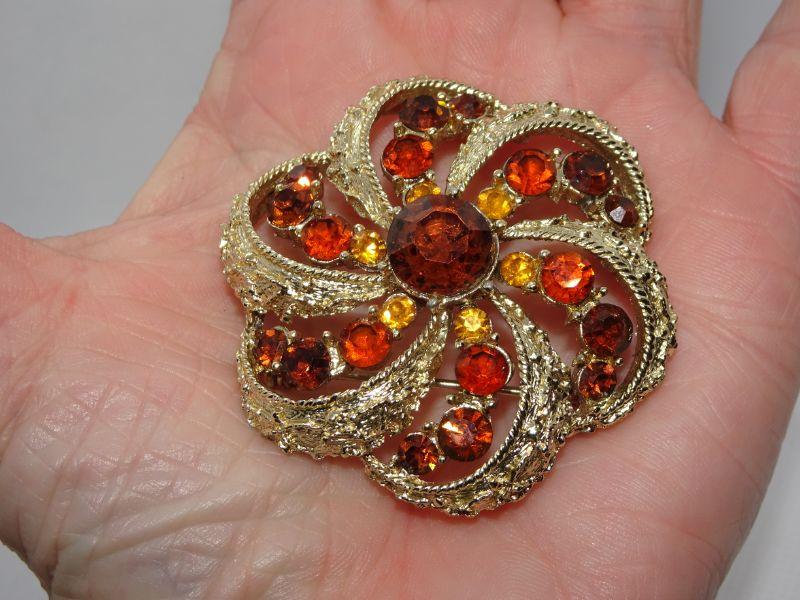 Gorgeous Fall Colors! Oranges, Browns and Gold Rhinestone Brooch, Gold Tone