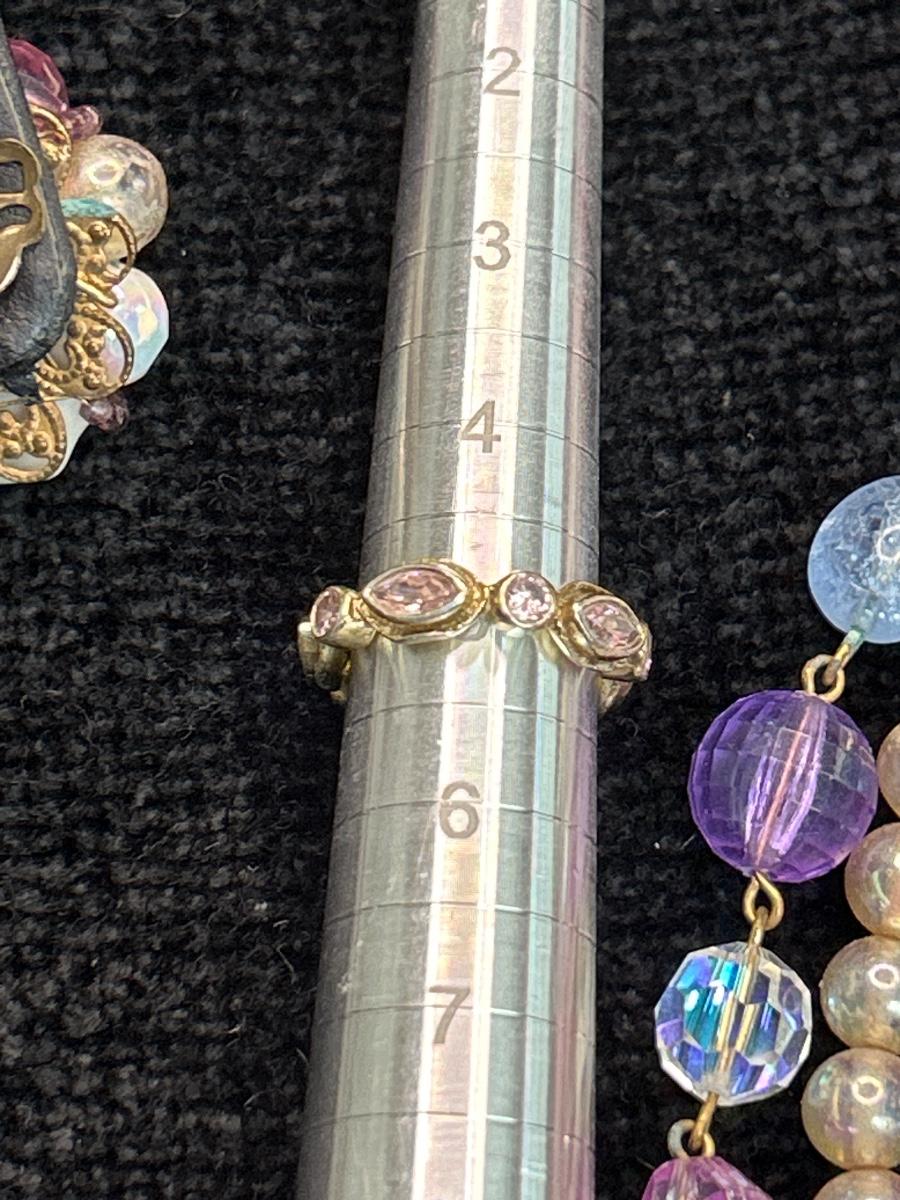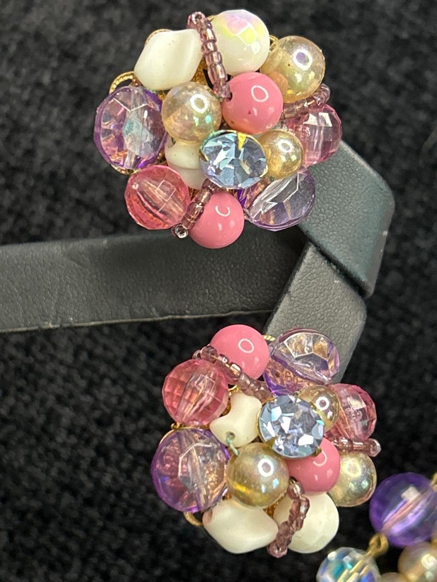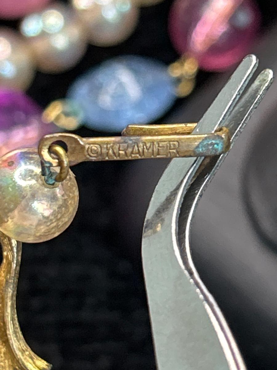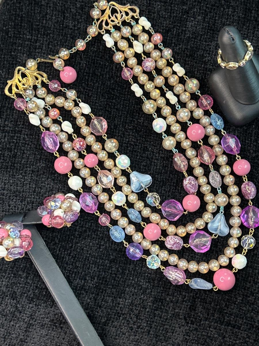 This is a vintage five strand, beautiful Kramer necklace and clip earring set and I paired a costume ring with it.
