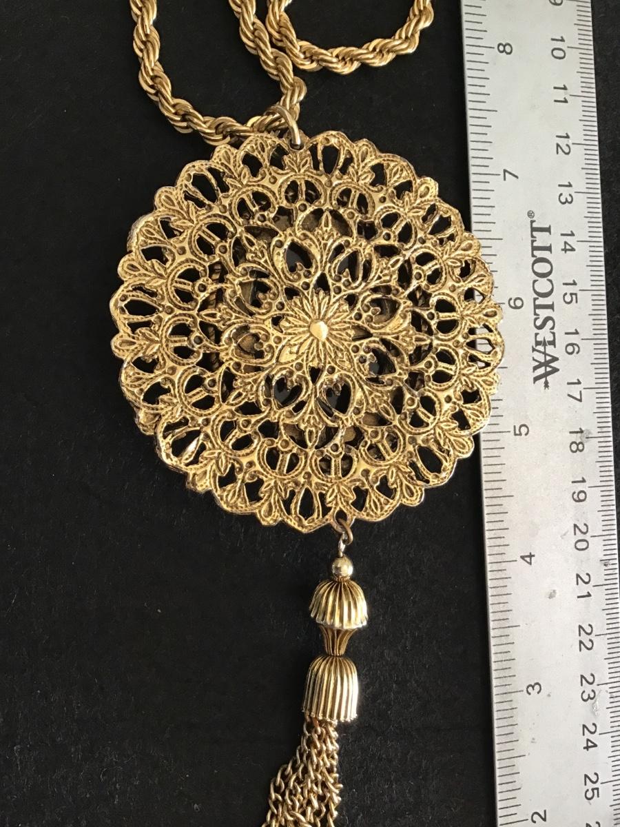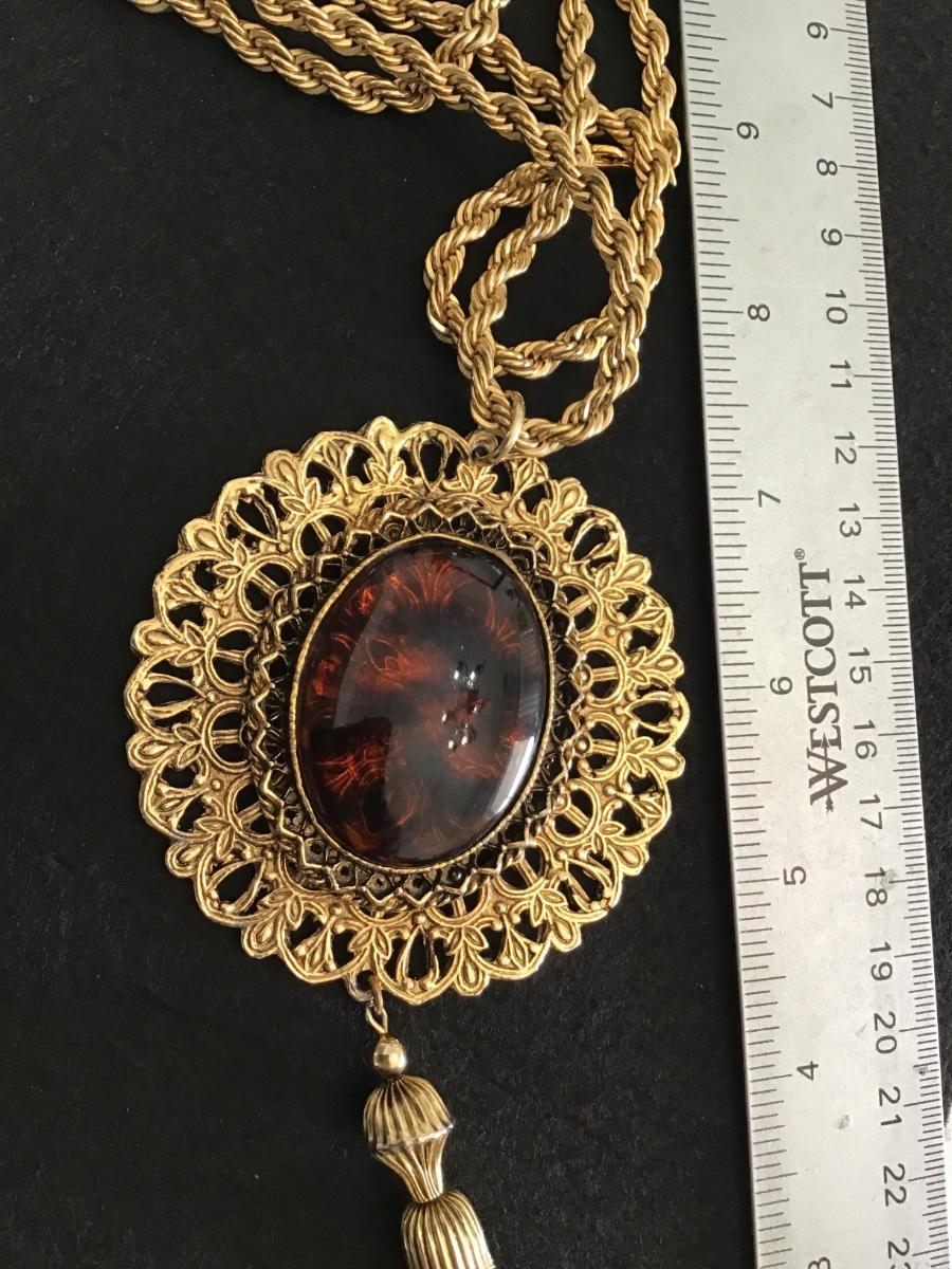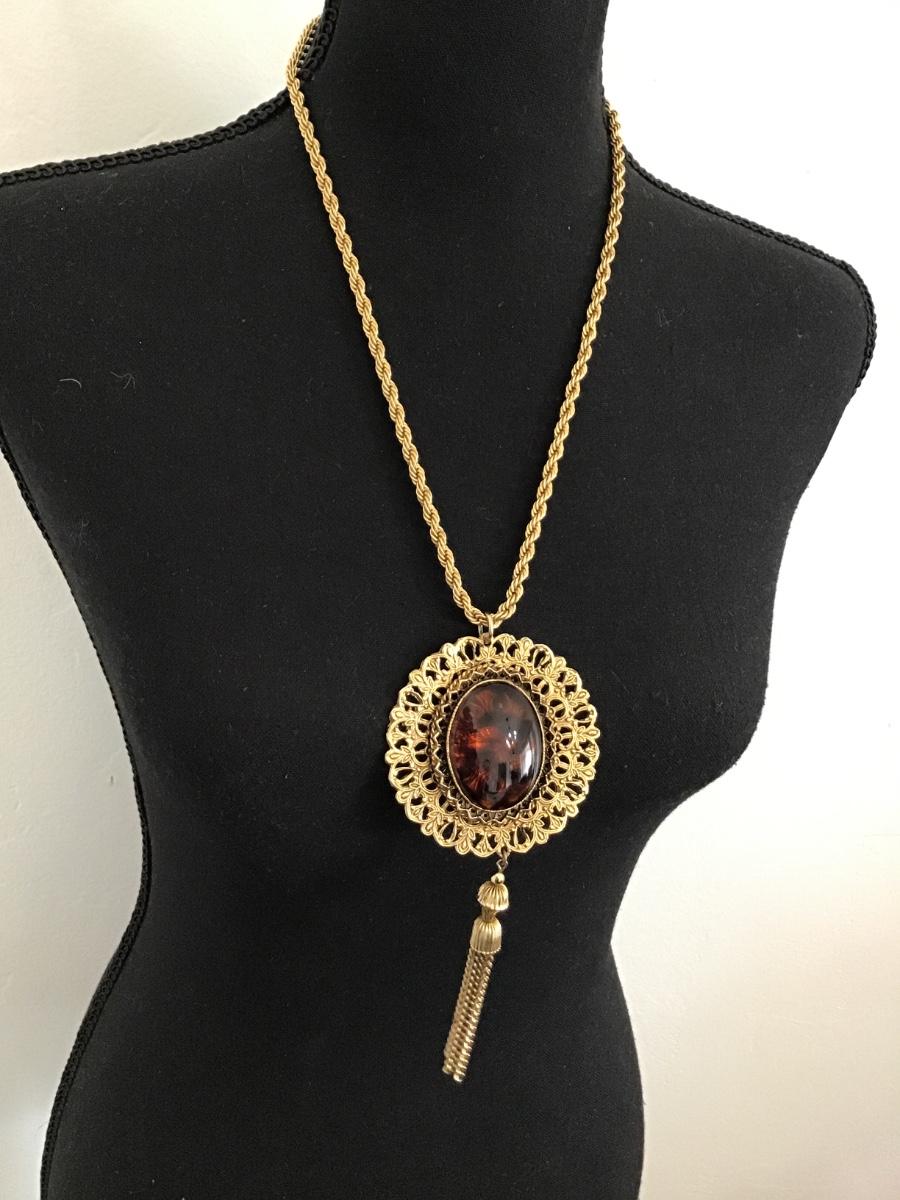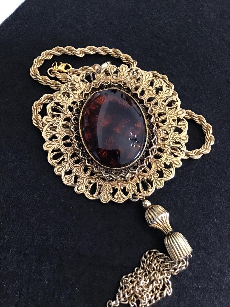 Gorgeous Gold Tone Filagree Glass Tortoise Color Stone on Vintage Chain