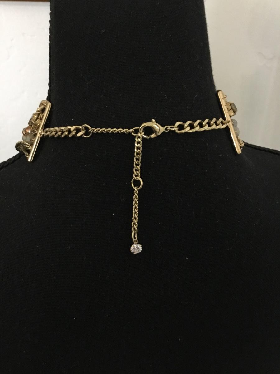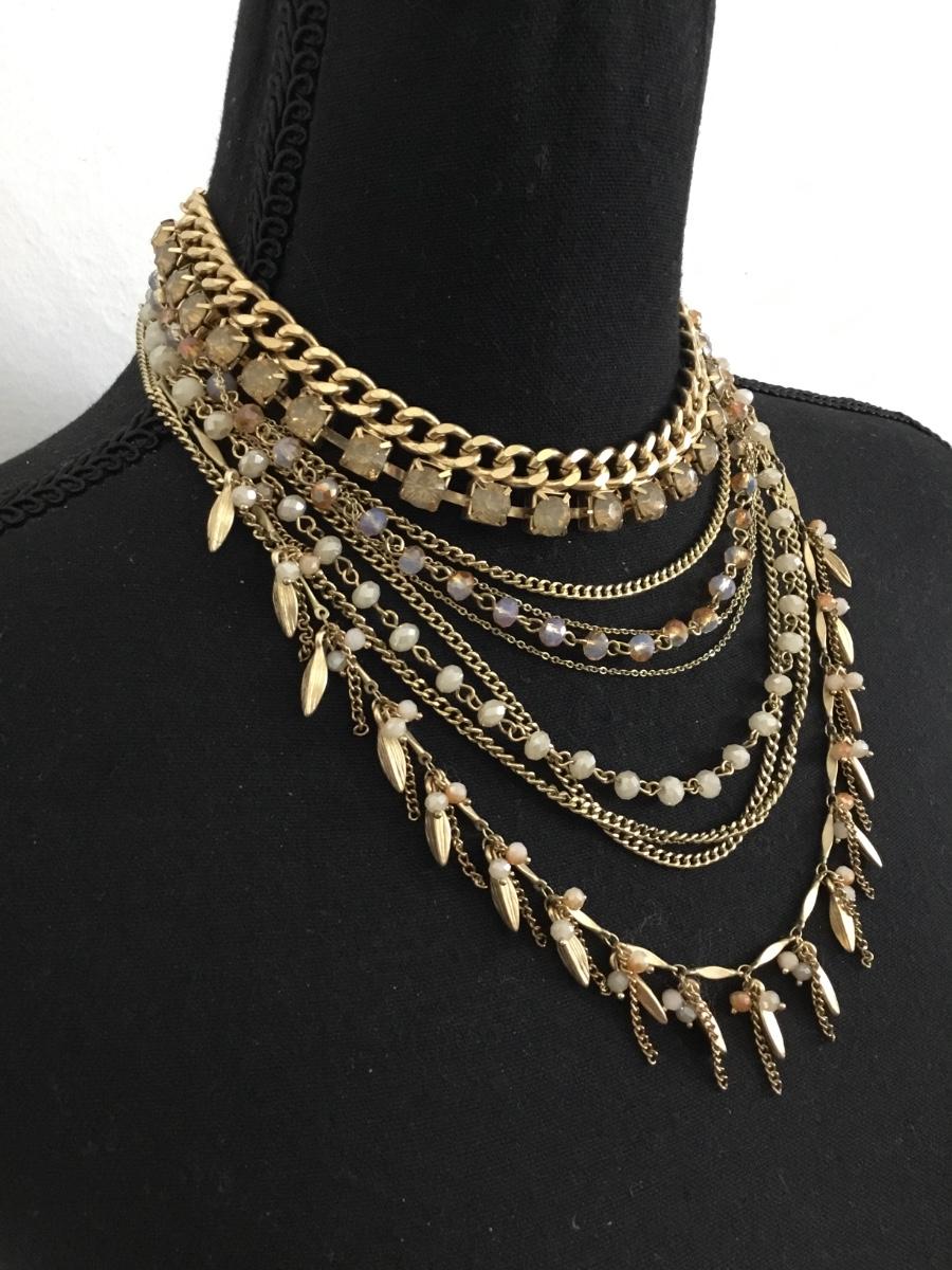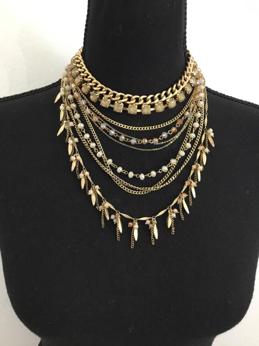 Gorgeous, gold tone, multi layer & rhinestone in glass bead statement necklace