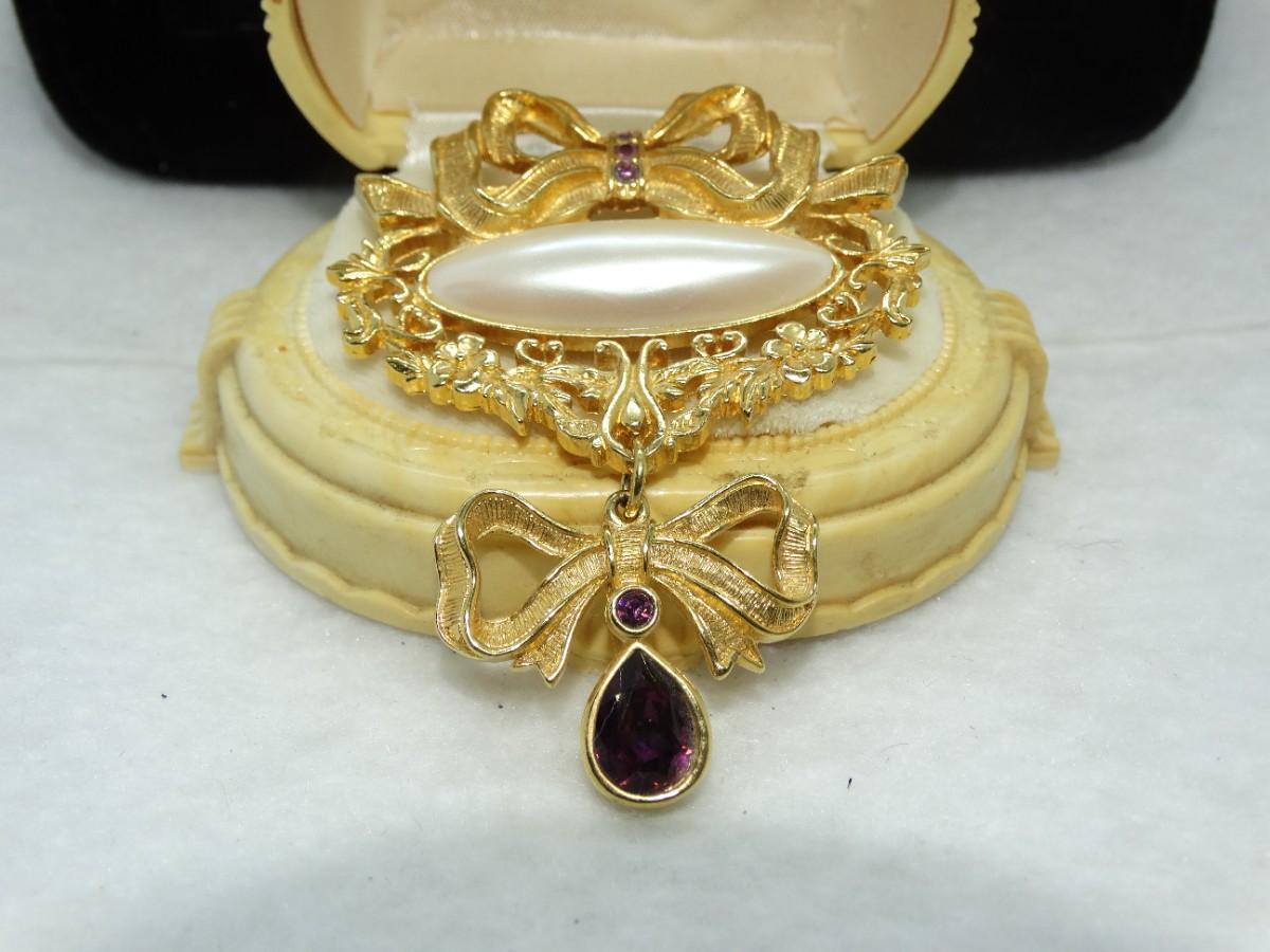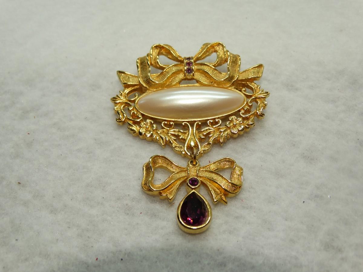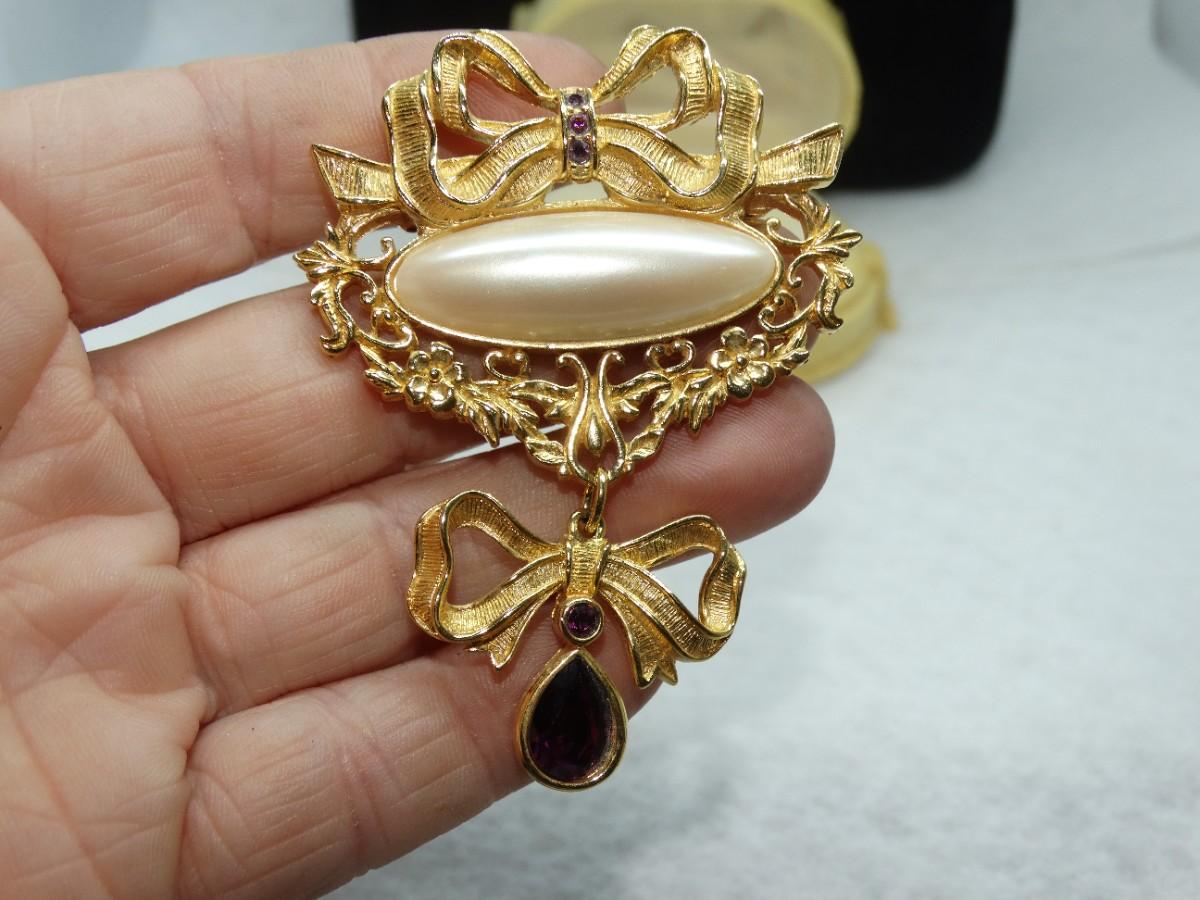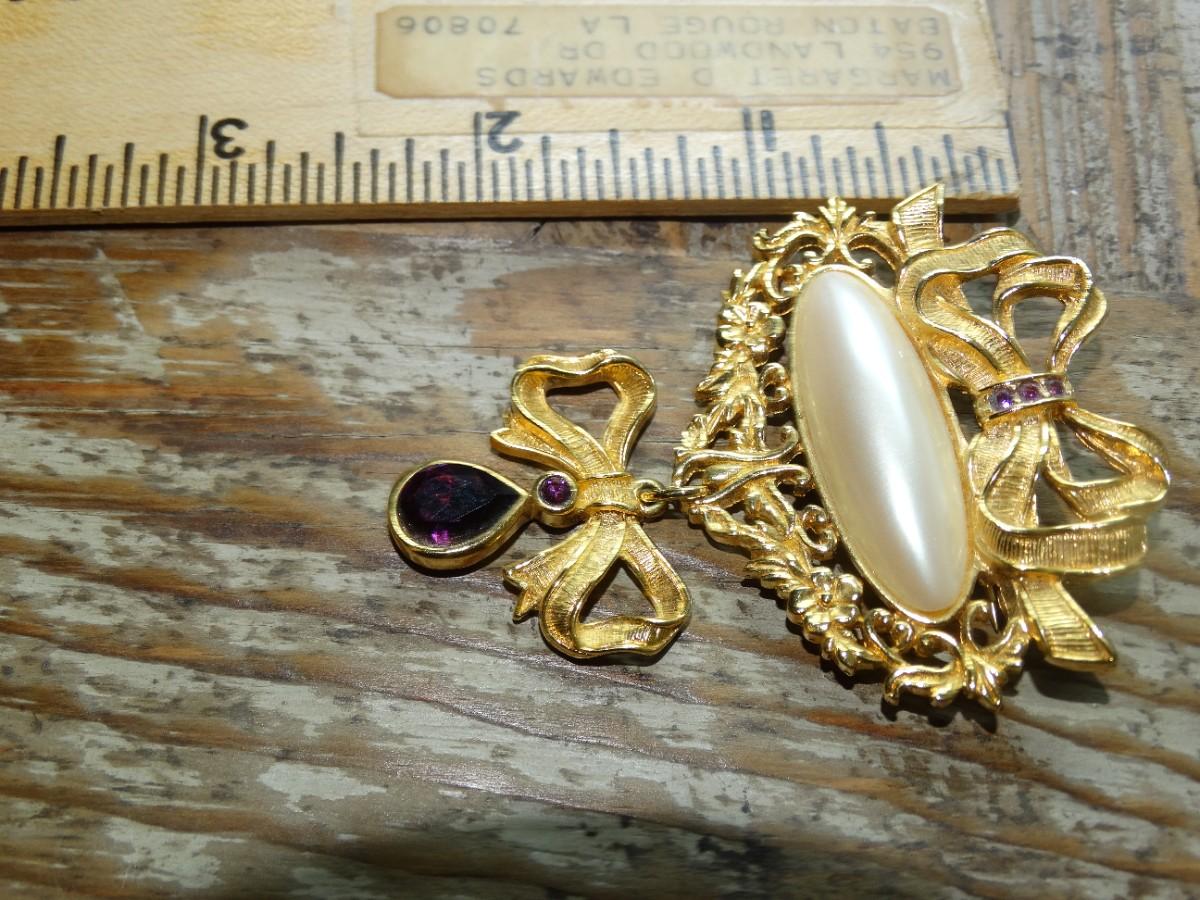 Gorgeous Gold Tone Pearl & Amethyst Colored Stone Brooch, Statement Jewelry